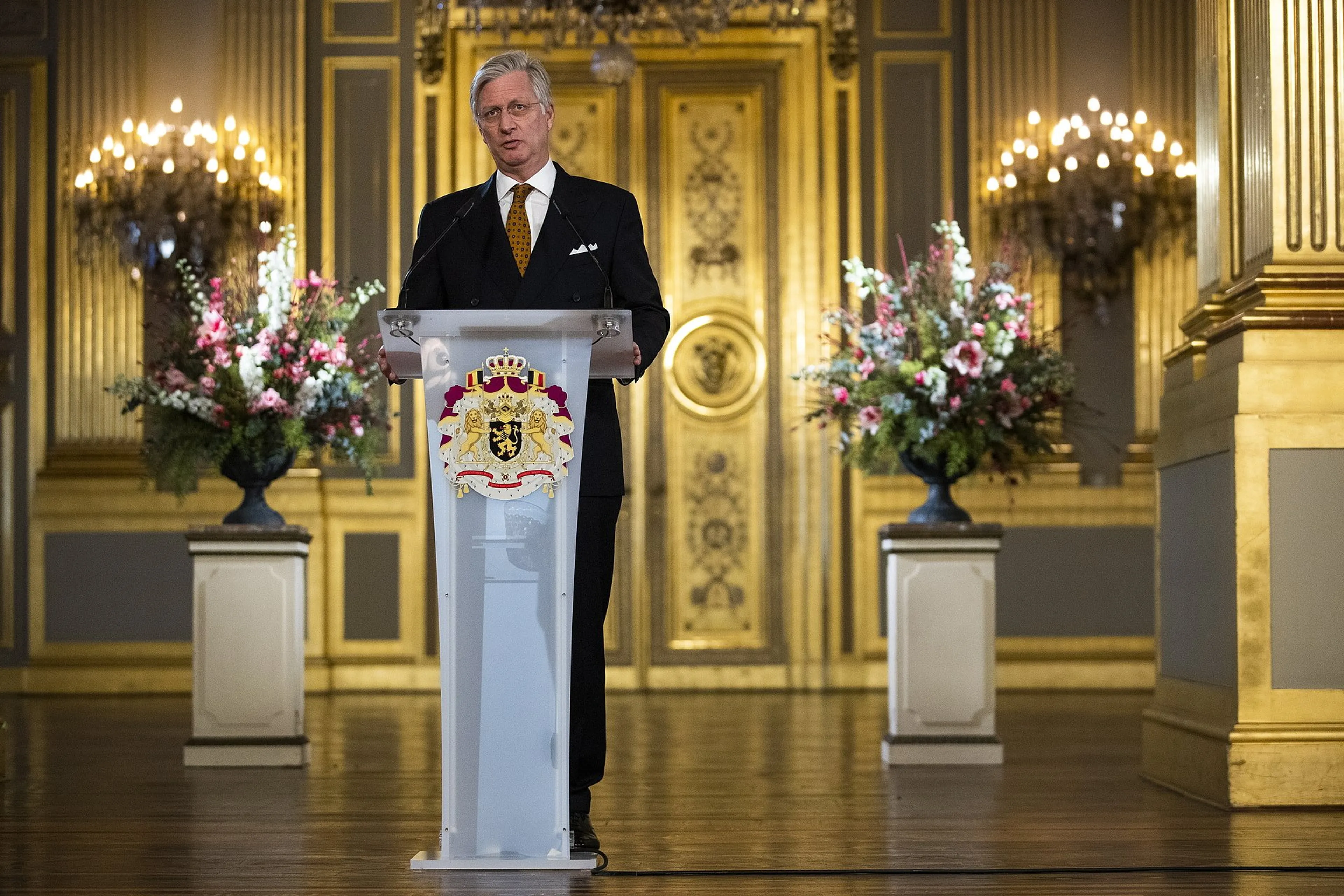 De koning en premier Alexander De Croo spraken donderdag de overheden van het land vanuit een lege Troonzaal in het Koninklijk Paleis in Brussel toe. Door de coronacrisis was de traditionele nieuwjaarsreceptie enkel digitaal te volgen.