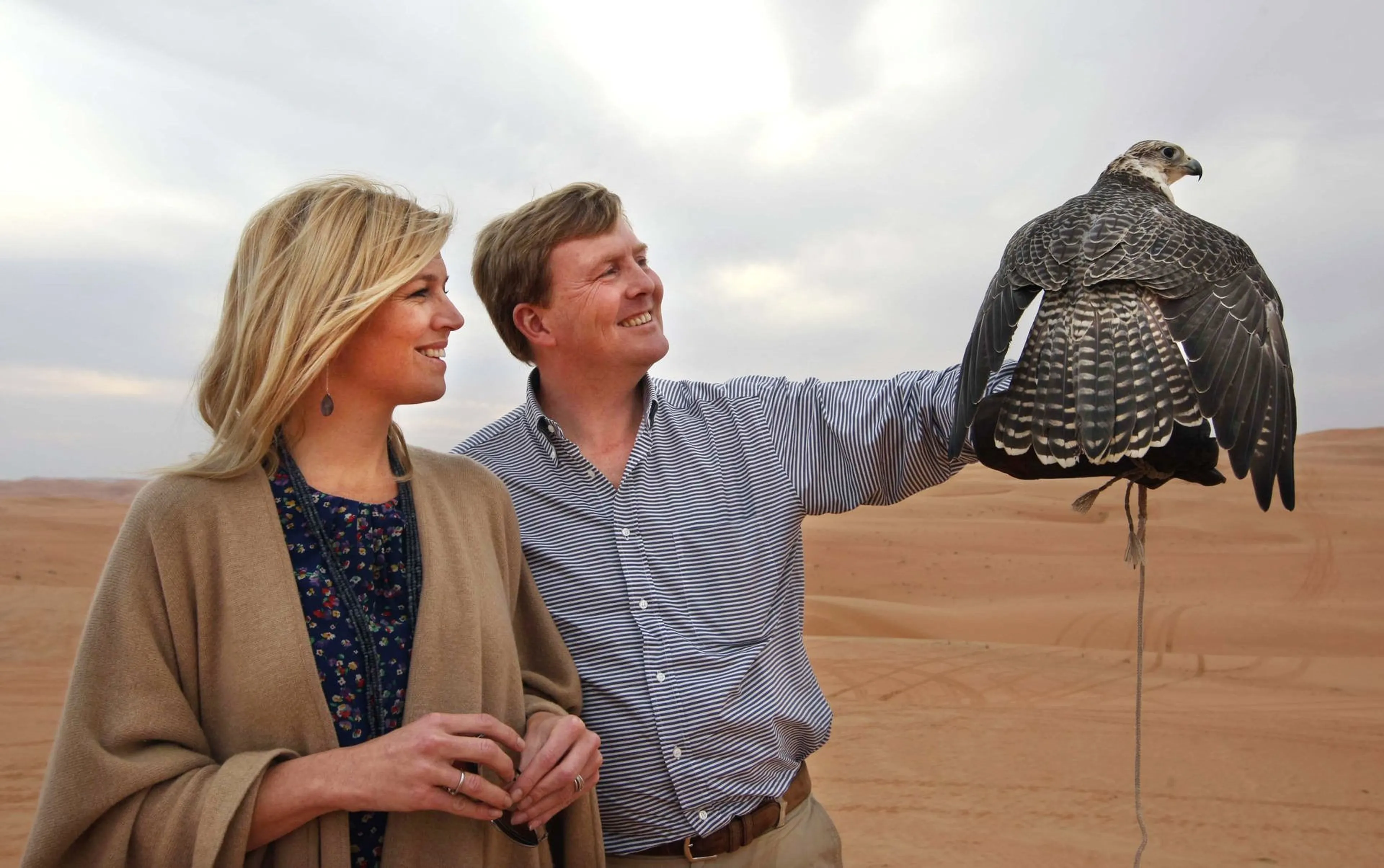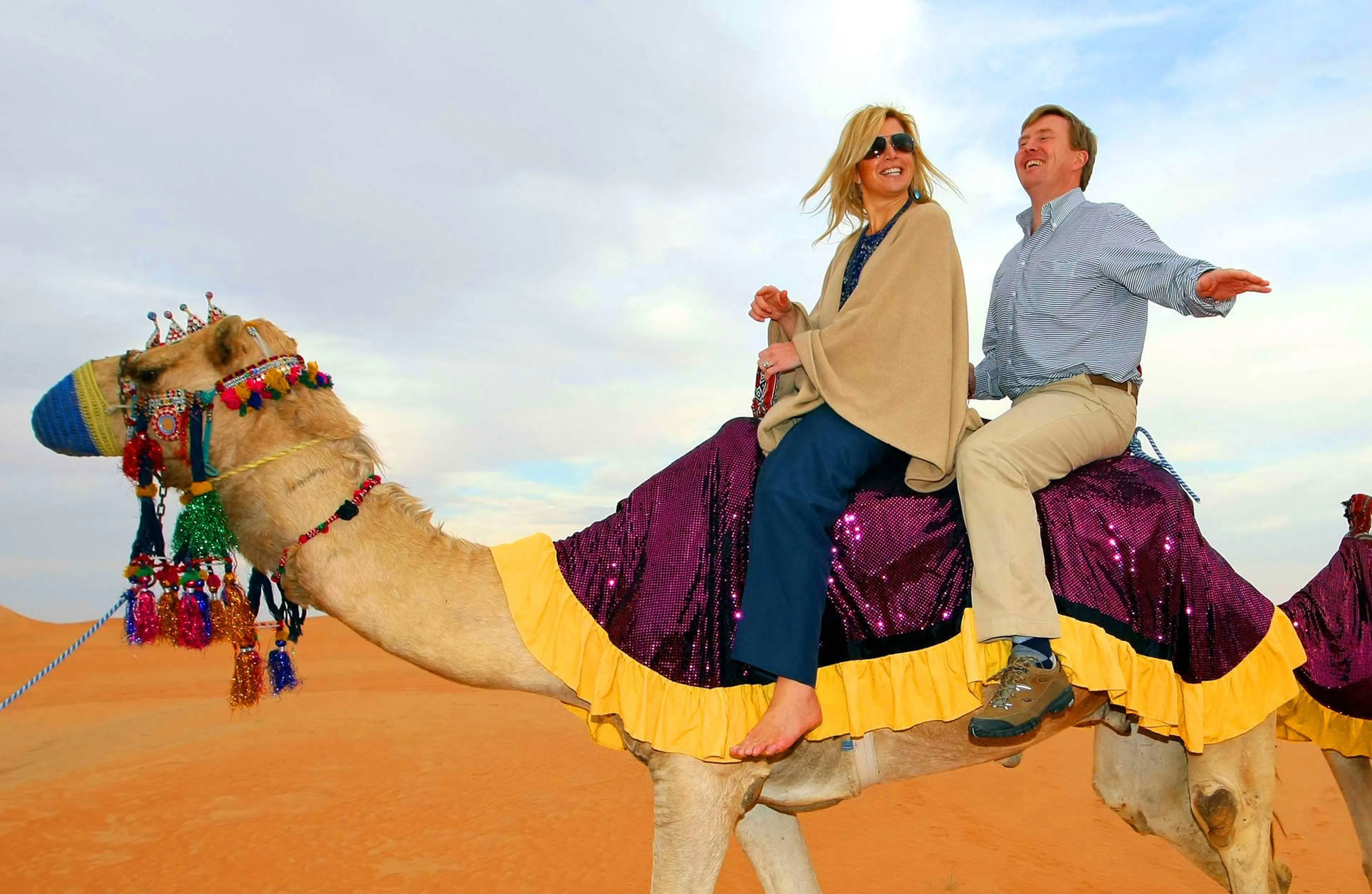 Tijdens een dag in de woestijn in Abu Dhabi maakt het -toen nog- prinselijk paar kennis met de traditionele cultuur door een ritje te maken op een kameel. Máxima vindt het spannend maar Willem-Alexander durft met losse handen op de rug te zitten!