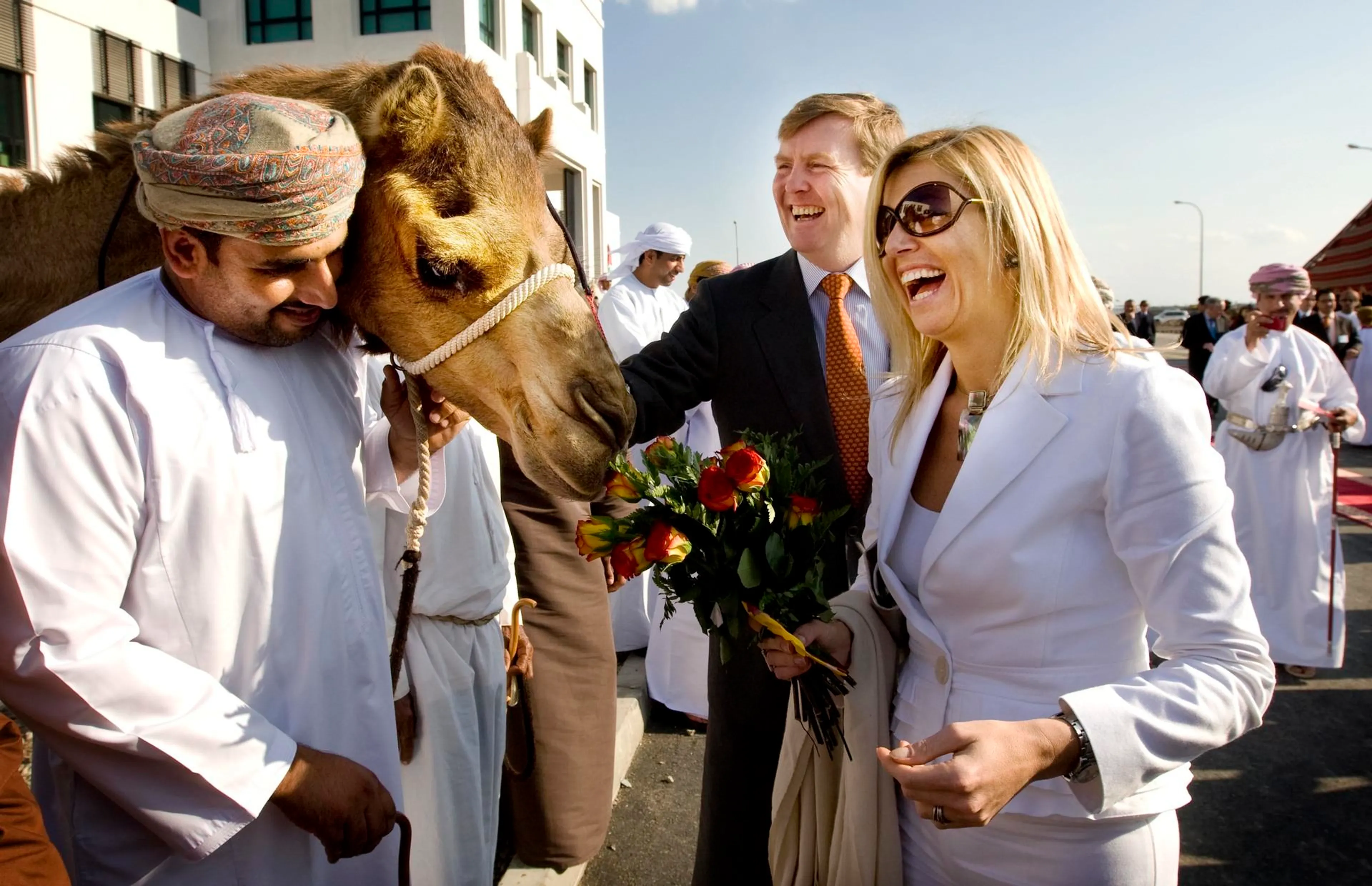 Twee keer tijdens één reis maken Willem-Alexander en Máxima in 2009 kennis met een kameel. In Oman wil het dier eigenlijk een hapje nemen van het kleurrijke boeket van prinses Máxima.