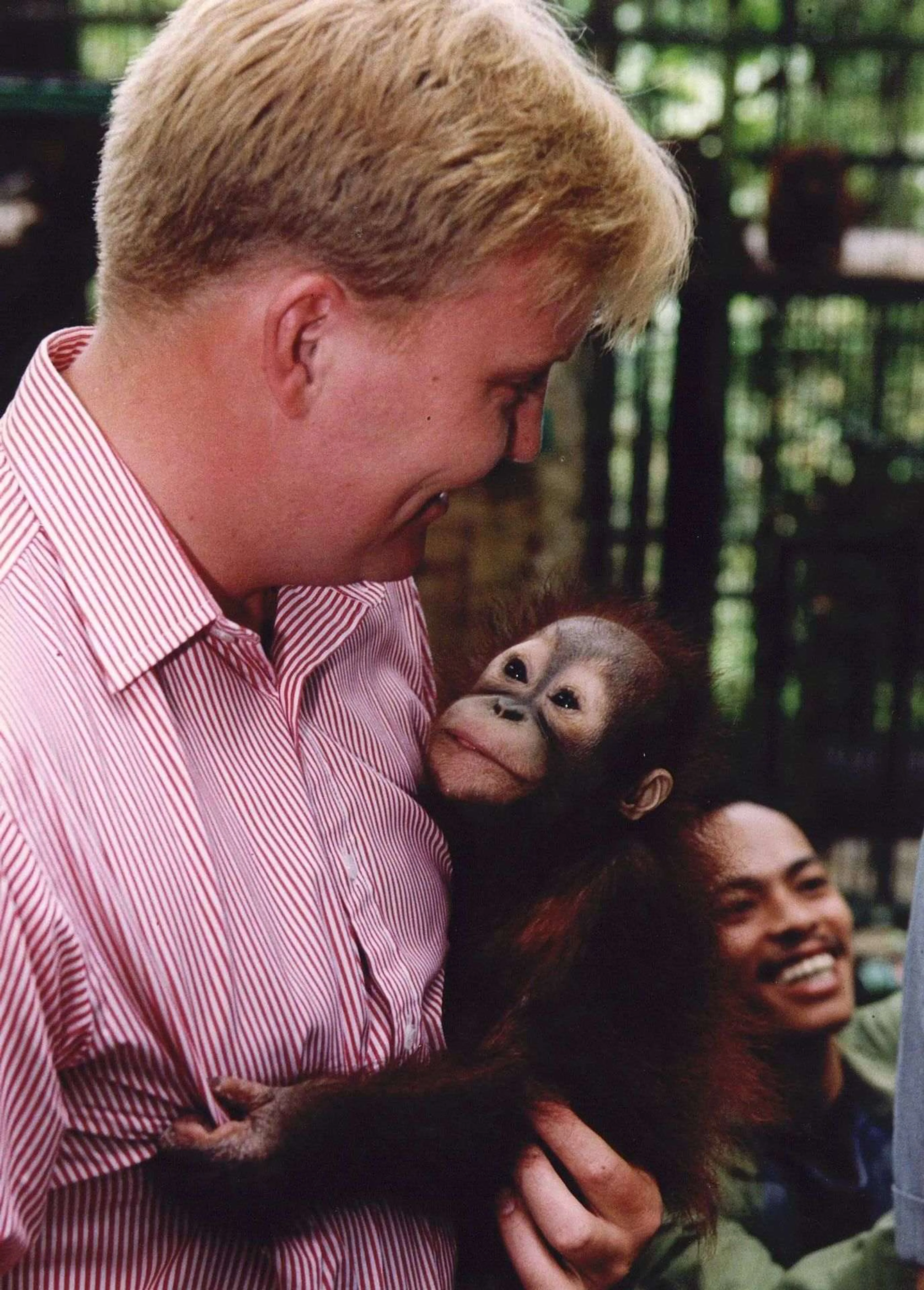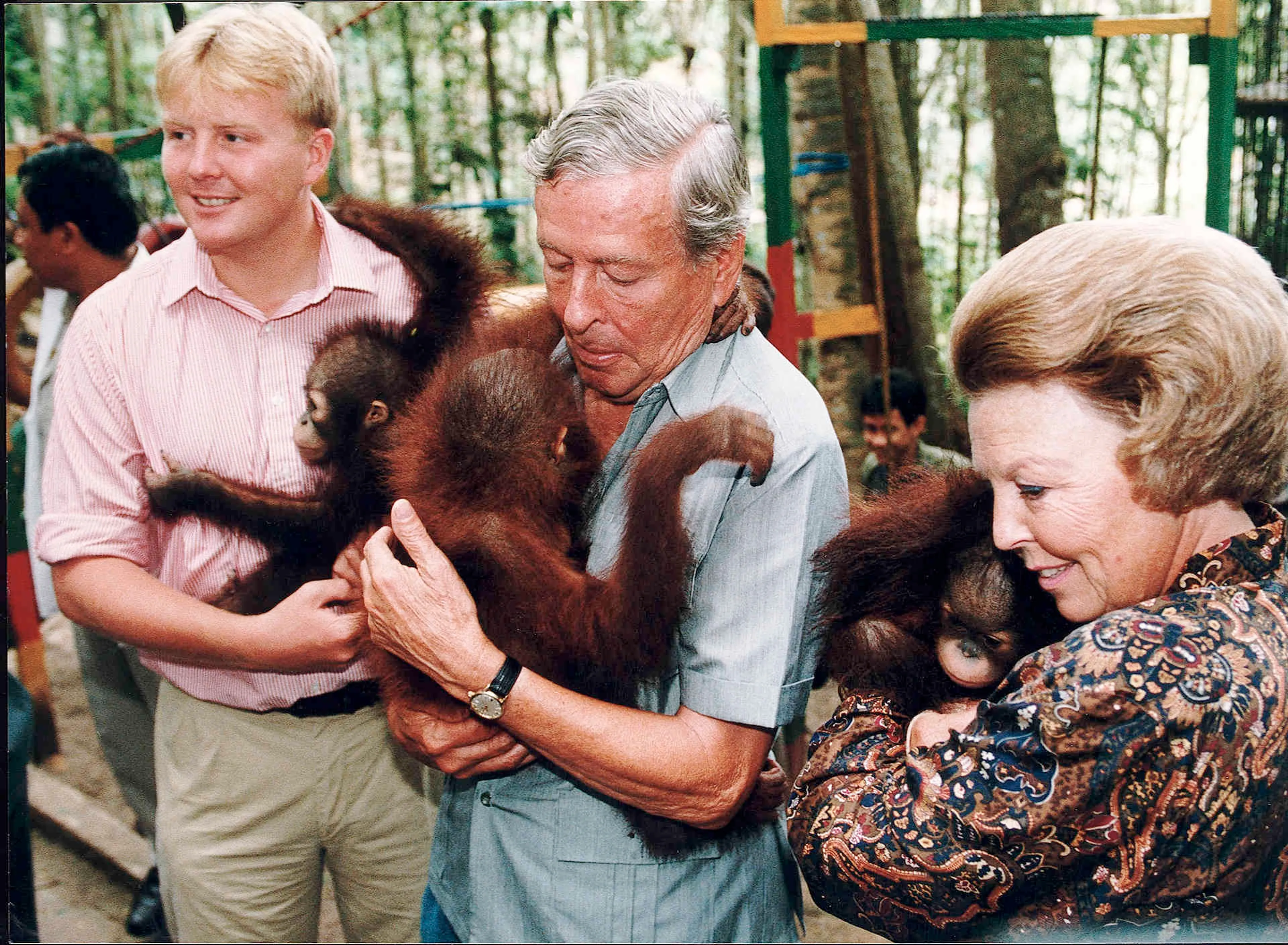 Even knuffelen! In 1995 bezoekt Willem-Alexander samen met zijn ouders een rehabilitatieproject voor Orang-Oetangs in Indonesië. De prins adopteert het aapje op de foto dat sinds die dag zijn naam draagt.