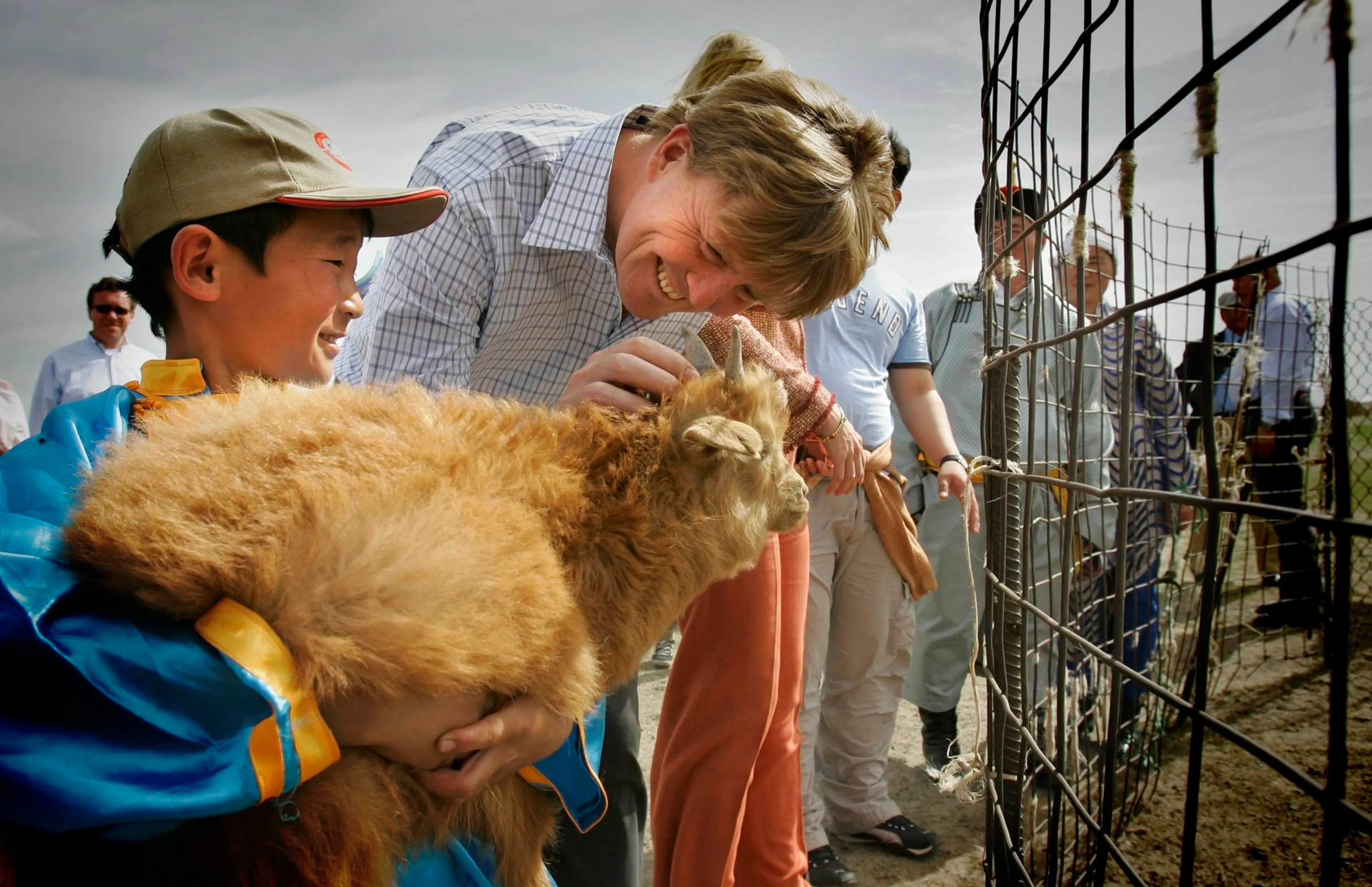 In de Hustai Park Buffer Zone in Mongolië laat een jongetje vol trots zijn geitje zien aan Willem-Alexander. De lach op het gezicht van Willem-Alexander zegt genoeg.