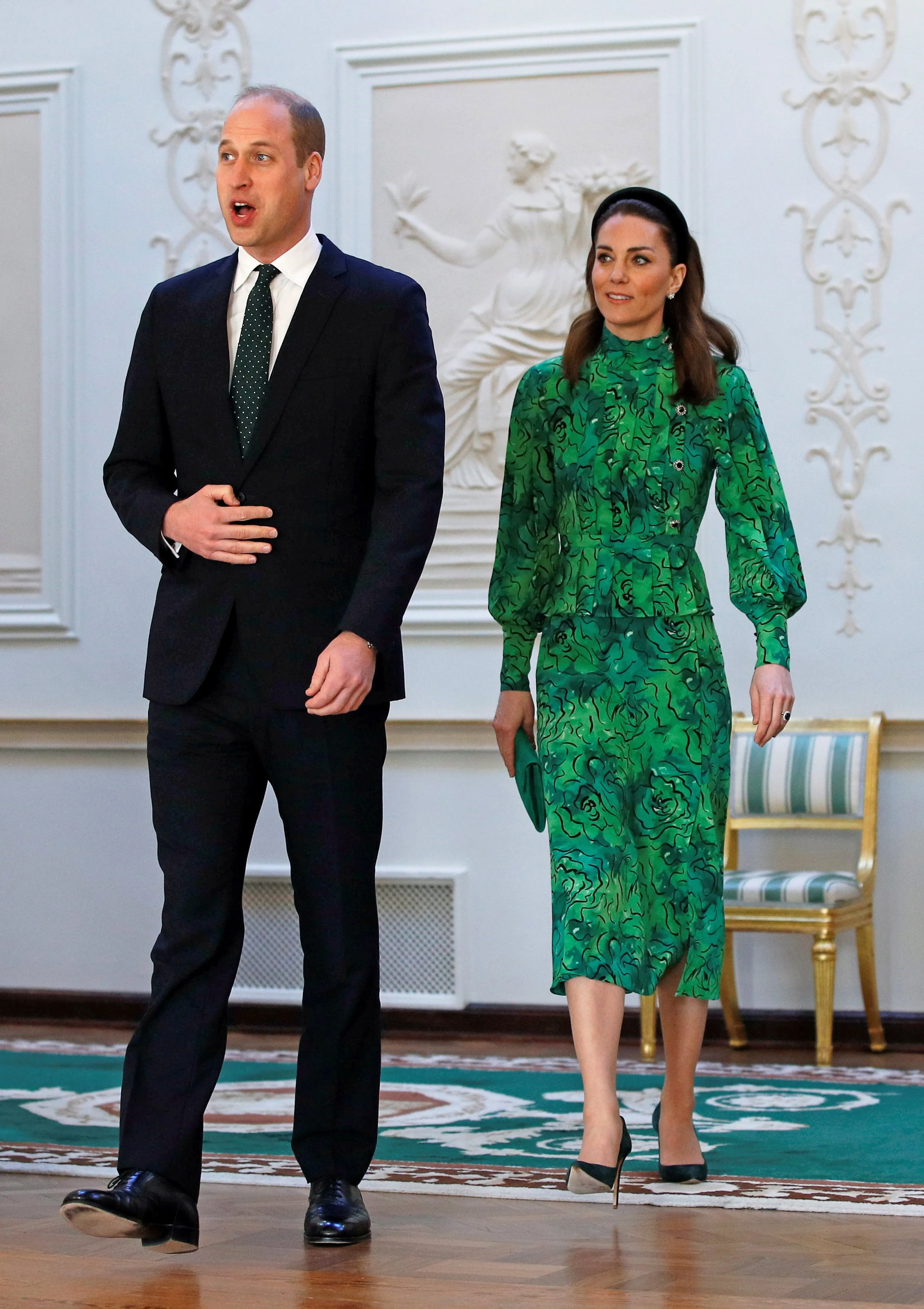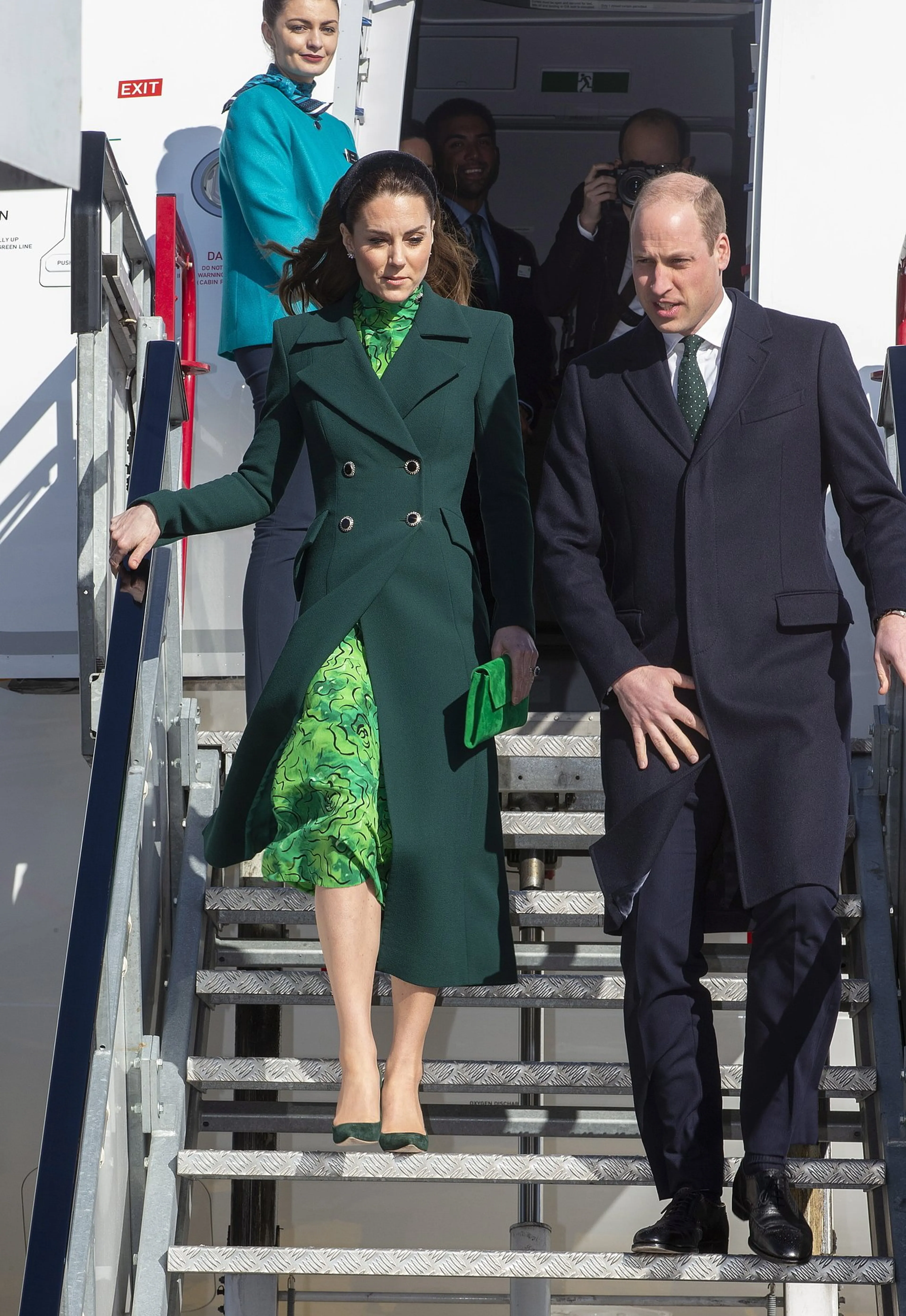 Catherine verscheen namelijk geheel in het groen, de nationale kleur van Ierland. Dit wordt ook wel 'flagdressing' genoemd. Ze droeg een jas van Catherine Walker in deze kleur, met daaronder een bijpassende gedecoreerde jurk van ontwerpster Alessandra Rich. De jurk kost rond de 1500 pond. Ook prins Wiliam was voor de gelegenheid gekleed in het groen.