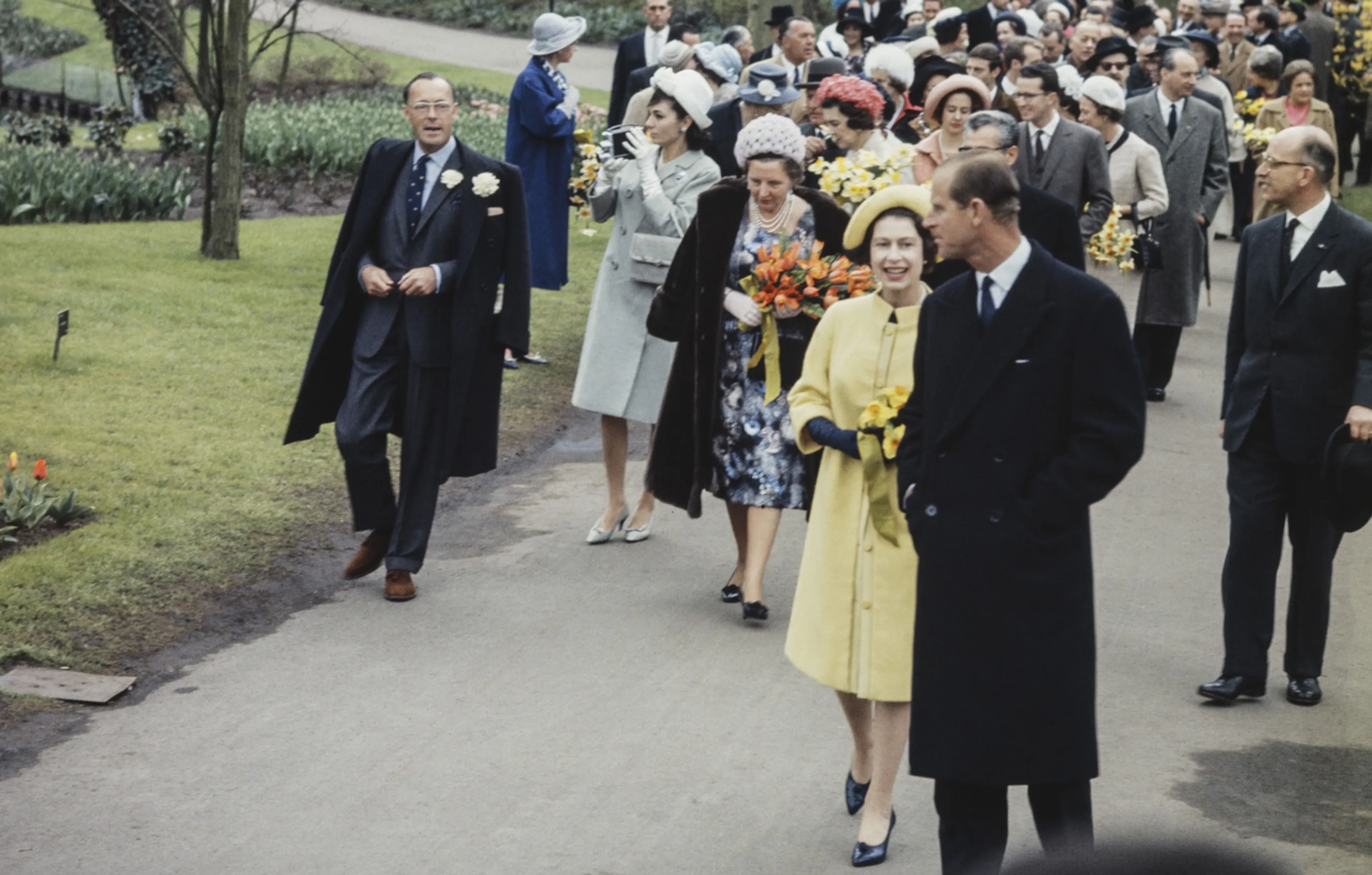 In 1962 worden diverse festiviteiten gevierd omtrent het 25-jarig huwelijksjubileum van Juliana en Bernhard. Een van de feestelijke gebeurtenissen is een bezoek van het koningspaar aan de Keukenhof. Er zijn ook buitenlandse genodigden bij. De twee Engelse gasten, koningin Elizabeth en prins Phillip, lopen voorop.