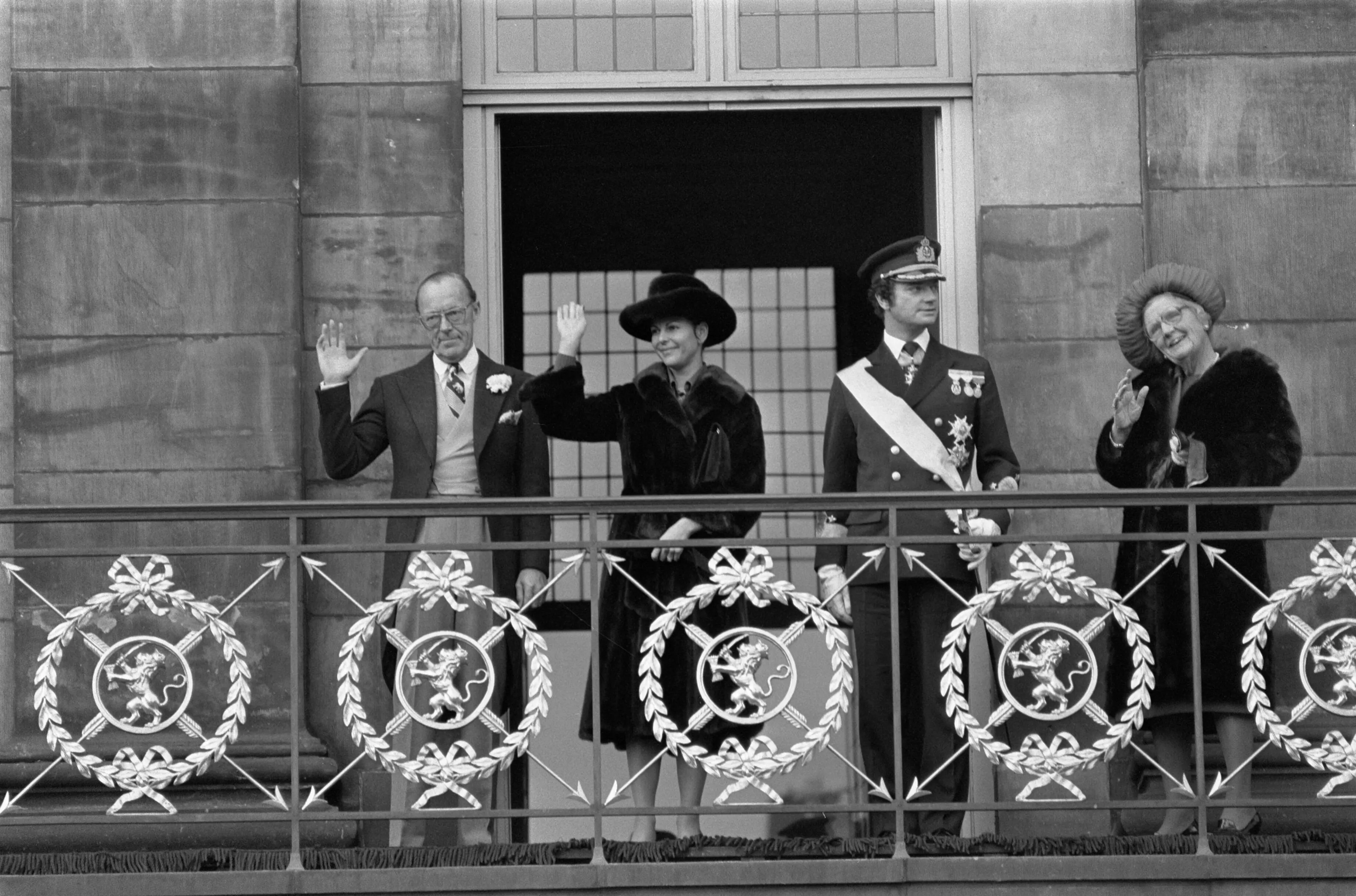 In 1976 brengt het Zweedse koningspaar een staatsbezoek aan Nederland. Op deze foto is te zien hoe Juliana en Bernhard samen met koningin Silvia en koning Carl Gustaf vanaf het balkon van het Paleis op de Dam het publiek staan toe te zwaaien.