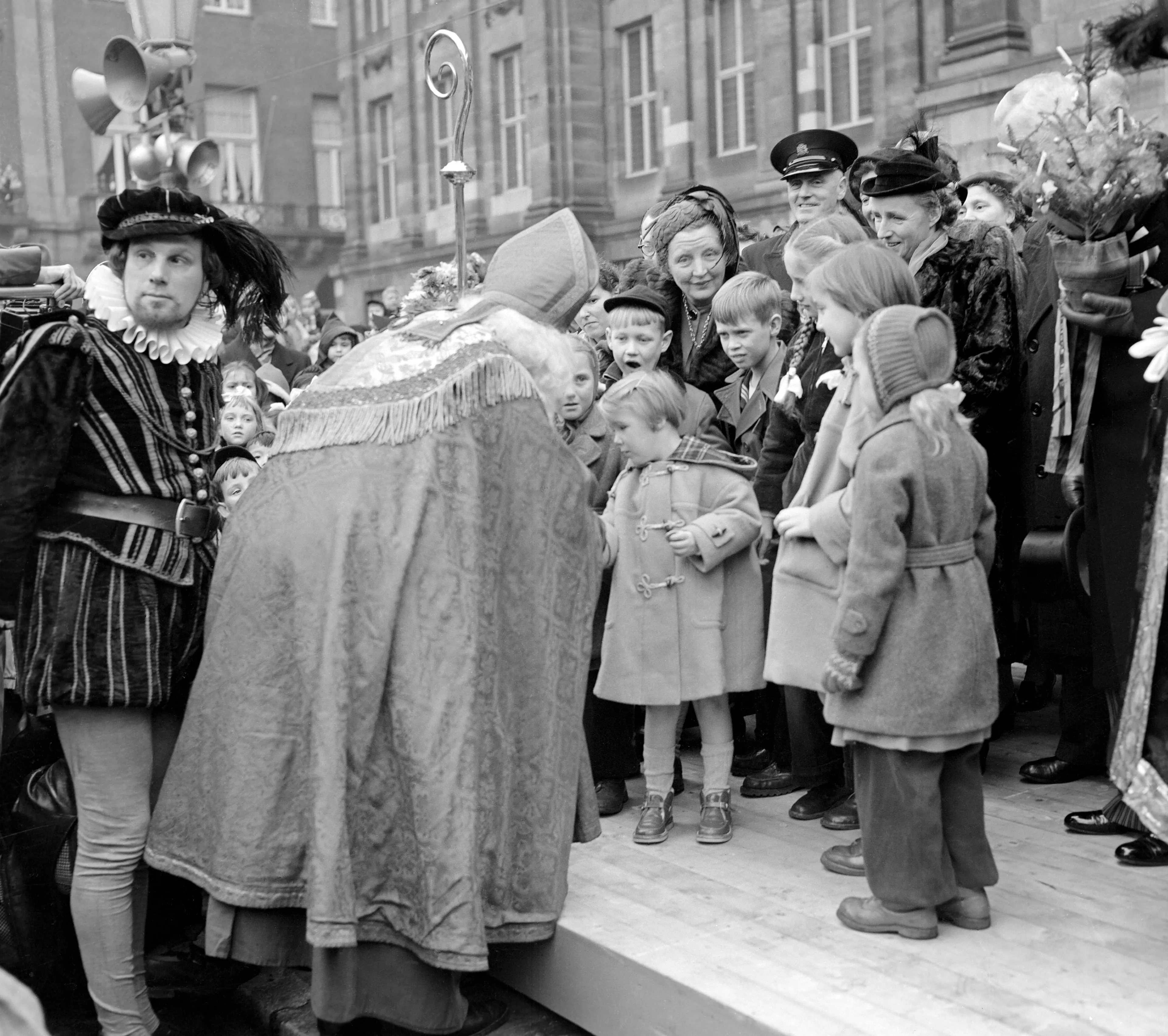 In datzelfde jaar gaat Juliana met haar twee jongste dochters, Margriet en Marijke, naar de Sinterklaasintocht in Amsterdam. Juliana kijkt toe als prinses Marijke de Sint een handje geeft.