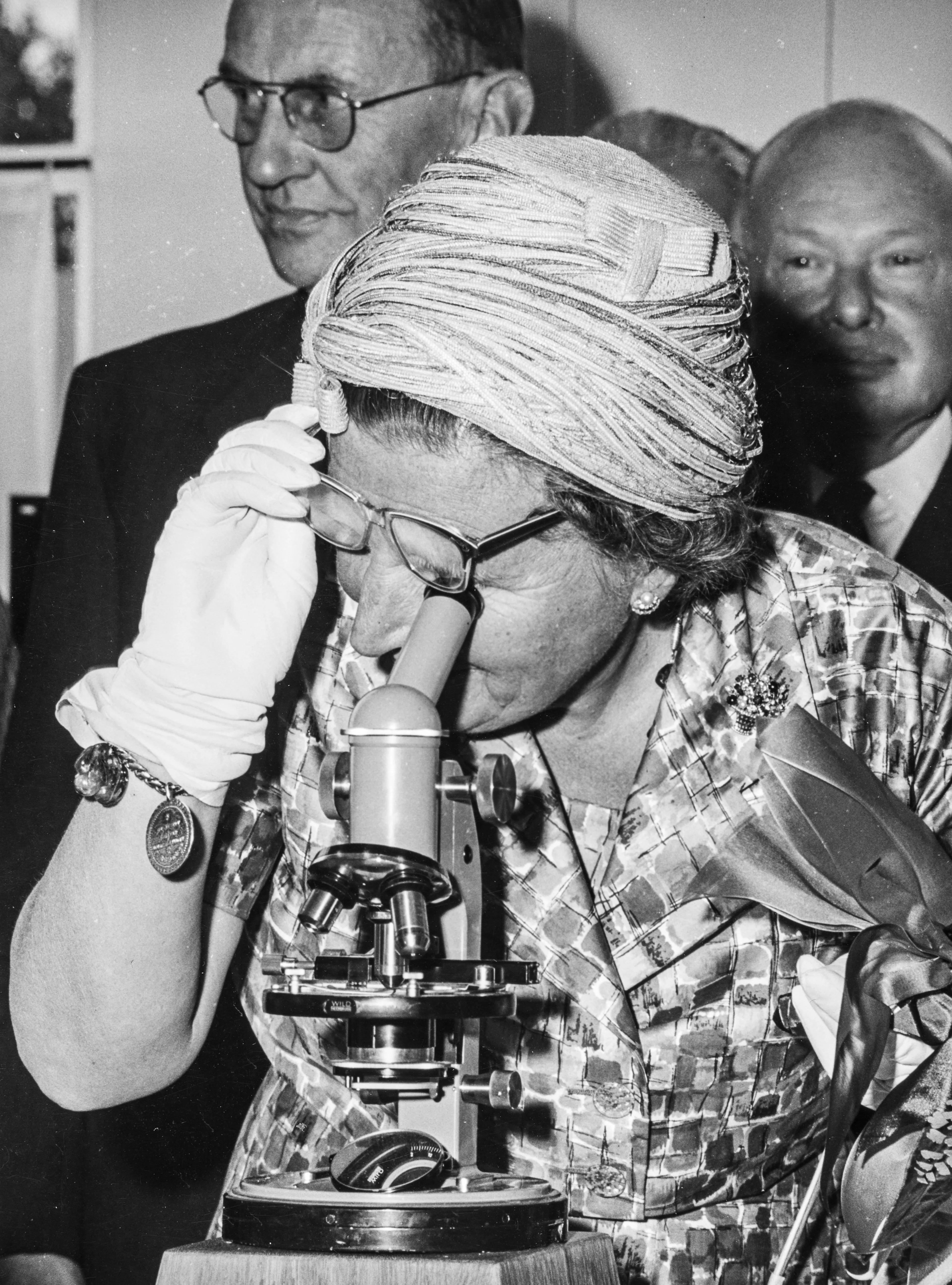Op 4 juli 1960 neemt koningin Juliana een kijkje bij de Nederlandse Aardolie Maatschappij in Oldenzaal. In het laboratorium trekt een microscoop de aandacht van de nieuwsgierige vorstin.