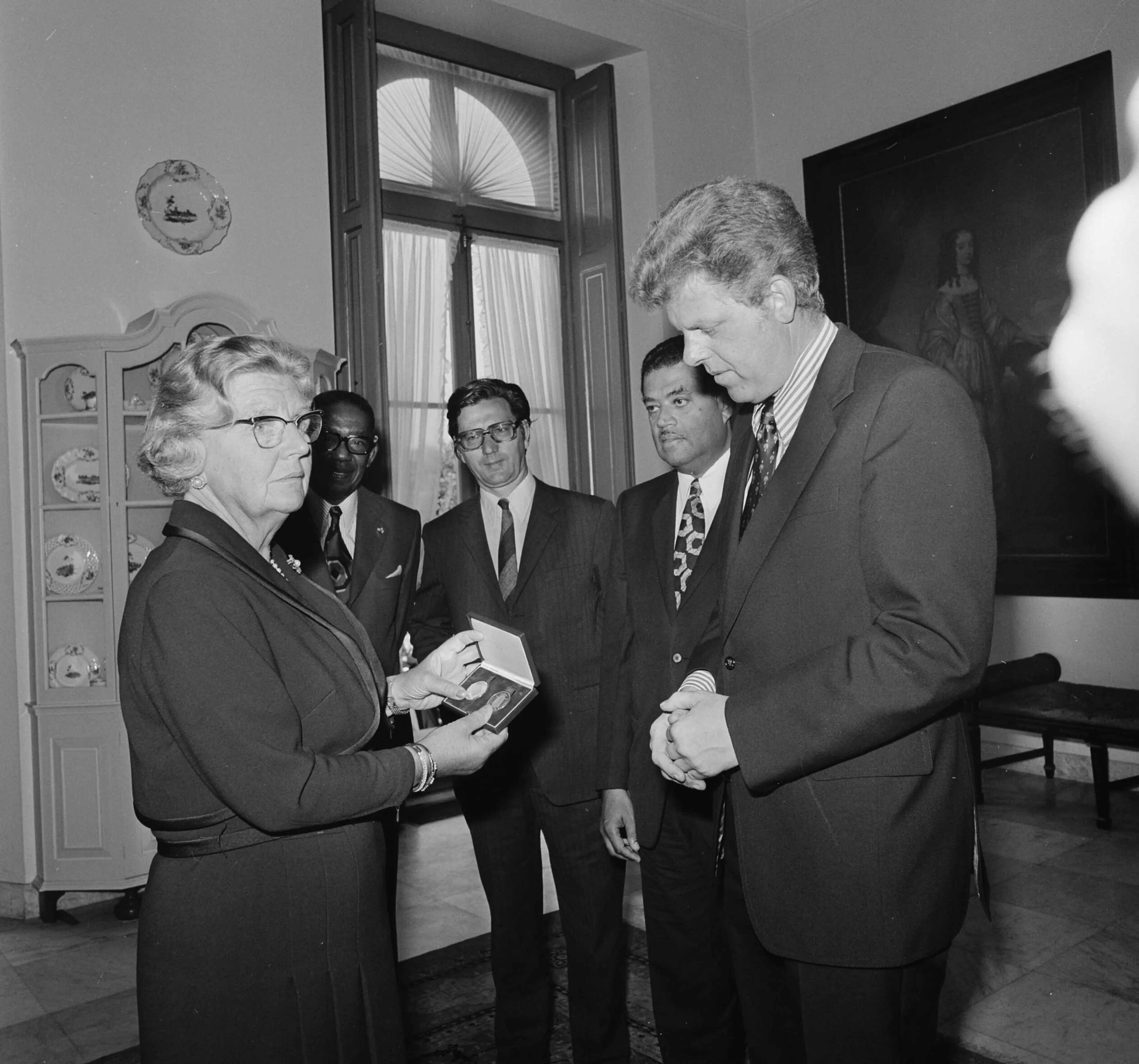 In 1973 viert Juliana haar 25-jarig regeringsjubileum. Ter gelegenheid van deze gebeurtenis geeft de Rijksmunt een zilveren tien gulden munt uit. Op deze foto is te zien hoe Juliana twee exemplaren als cadeau krijgt.