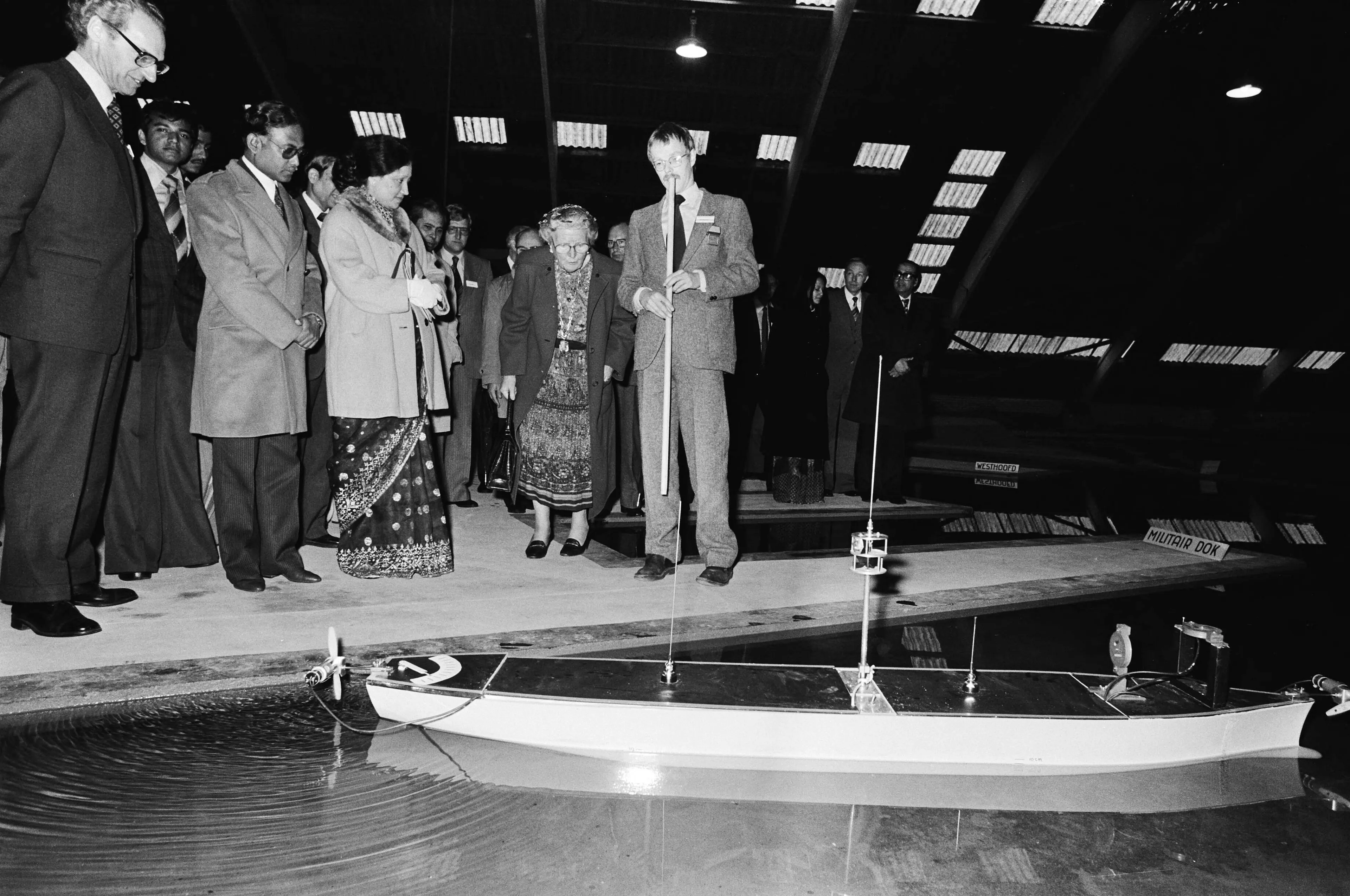 Juliana bezoekt in 1979 het Waterloopkundig Laboratorium in de Noordoostpolder. De koningin kijkt hier vol bewondering naar het zelf varende bootje.