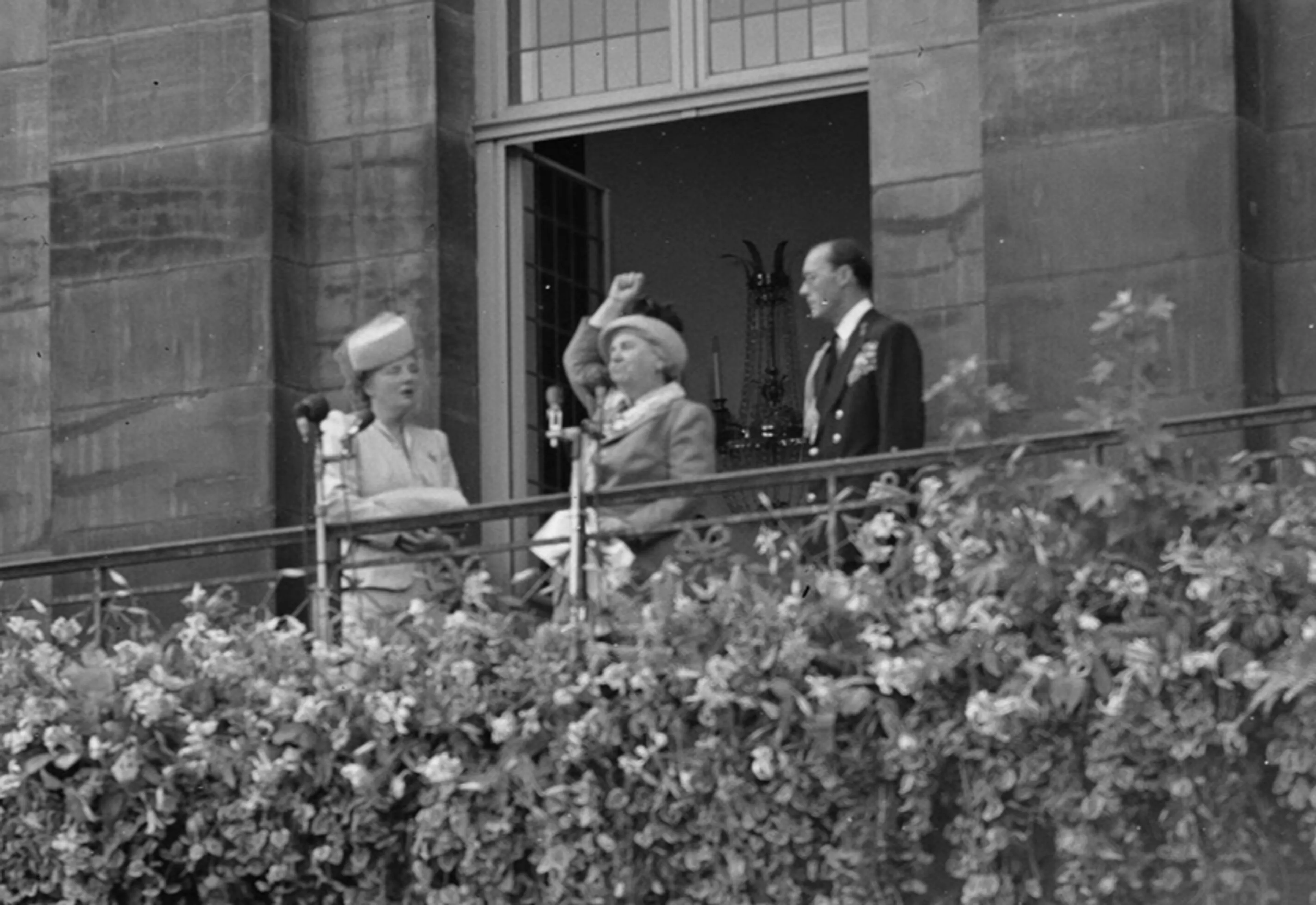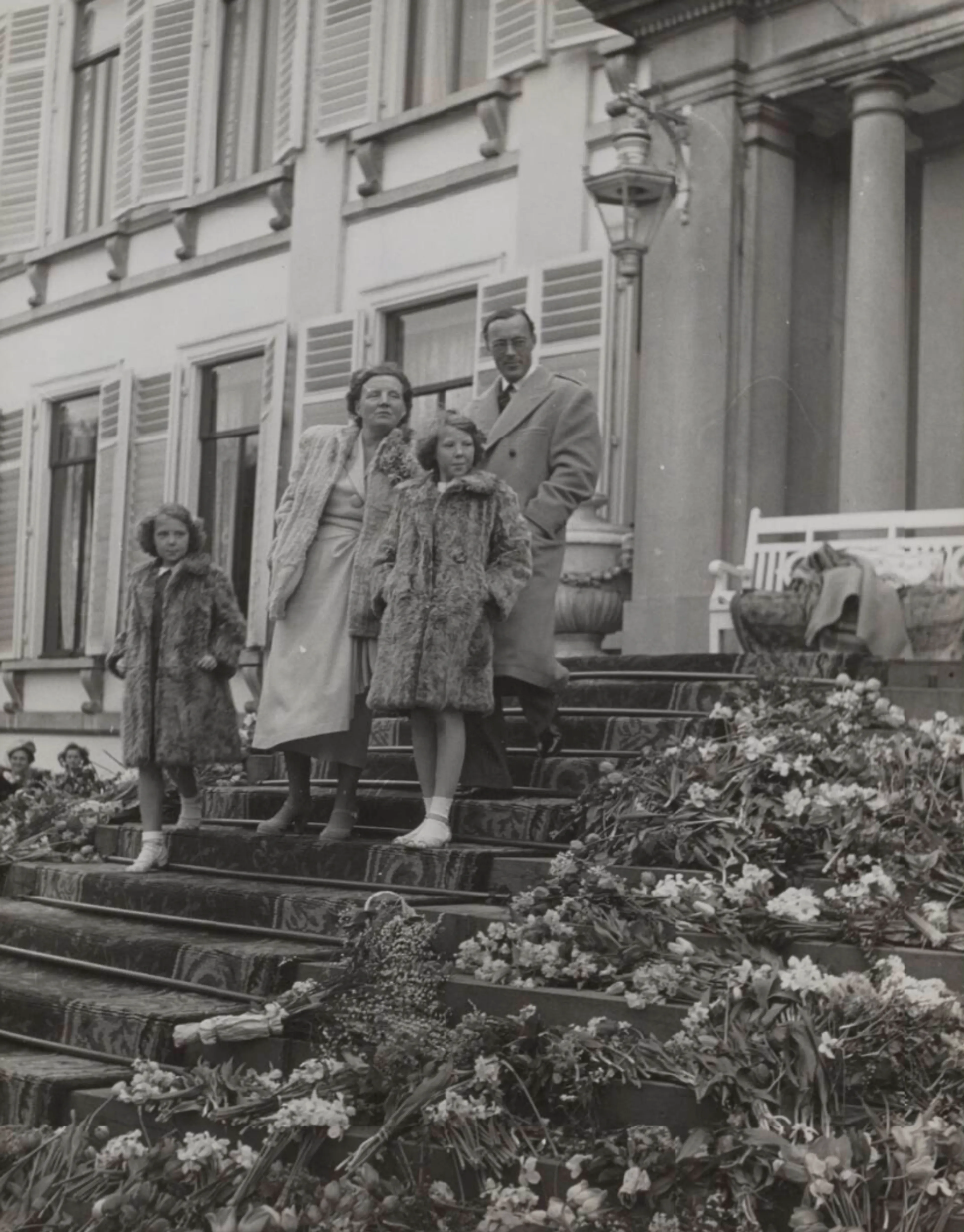 Juliana is op 30 april geboren, daarom wordt Koninginnedag vanaf haar inhuldiging op die dag gevierd. In 1949 wordt door de plaatselijke bevolking van Soestdijk en Baarn een grote bloemenhulde gebracht op Paleis Soestdijk. Juliana bekijkt hier samen met haar man en dochters Beatrix en Irene de bloemenzee, die voor haar verjaardag bij haar woning is gelegd.