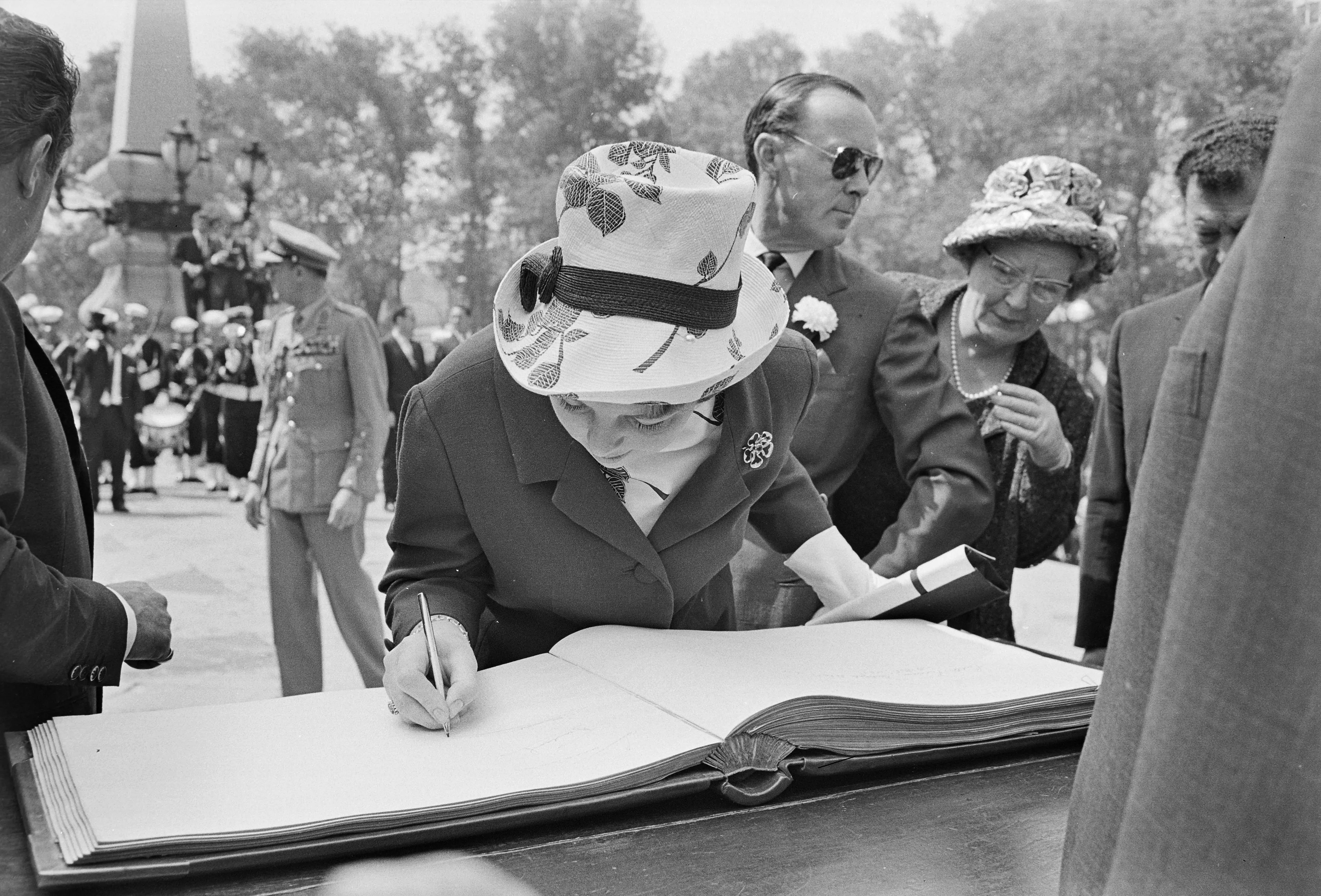 Op deze foto tekent kroonprinses Beatrix het gastenboek in Mexico, omdat ze mee is op staatsbezoek. Naast haar staan haar ouders. Koningin Juliana staat lachend naar haar dochter te kijken.