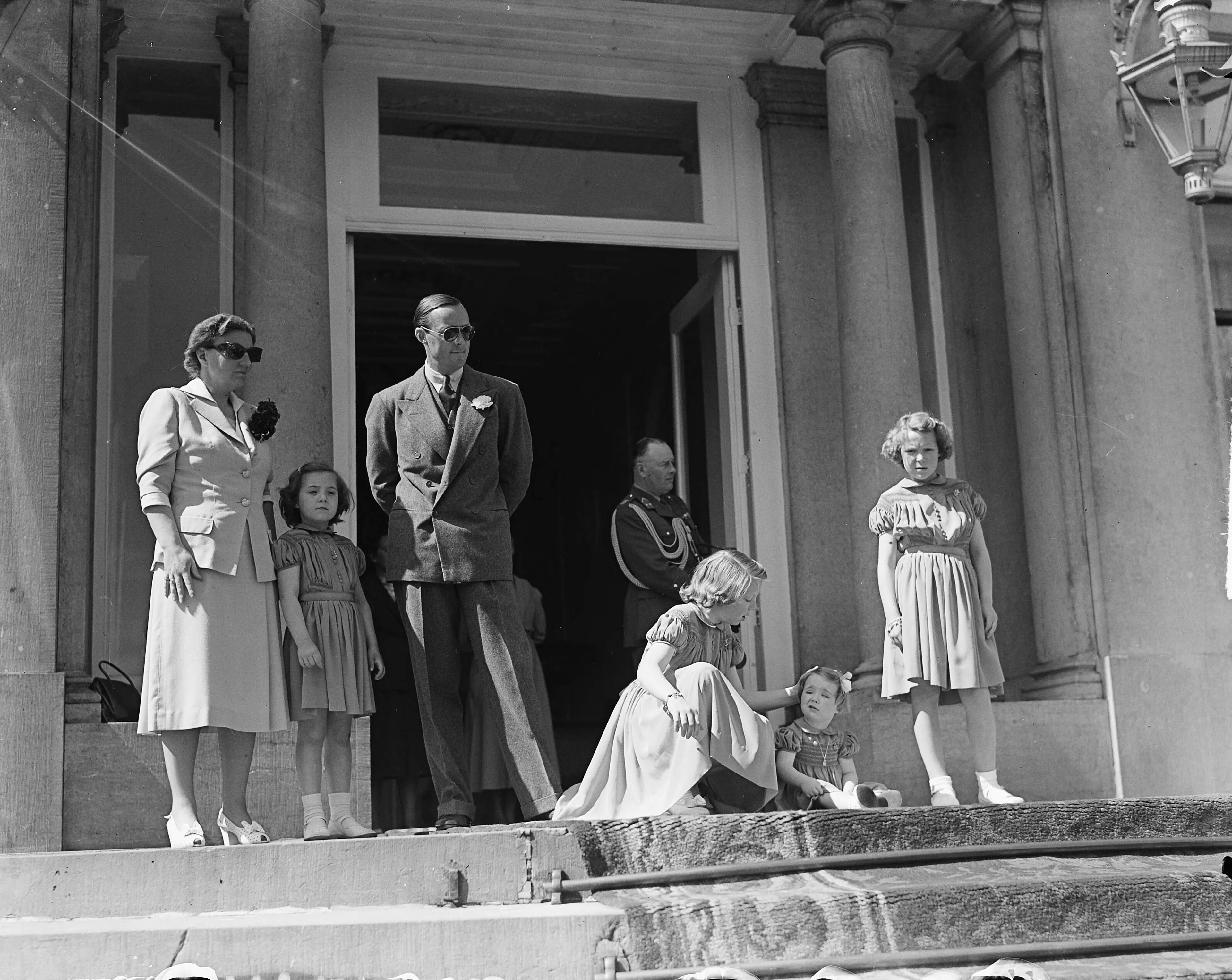 In 1950 wordt Juliana's verjaardag niet op 30 april gevierd omdat het op een zondag valt. Het wordt daarom een dagje later gevierd dit jaar. Het koninklijk gezin staat hier voor hun voordeur en kijken naar het defilé dat wordt gehouden ter gelegenheid van Koninginnedag. Het gezin is op deze foto compleet. Prinses Margriet staat tussen haar ouders Juliana en Bernhard. Helemaal rechts staat prinses Irene. Tussen haar en Beatrix zit de driejarige prinses Marijke.