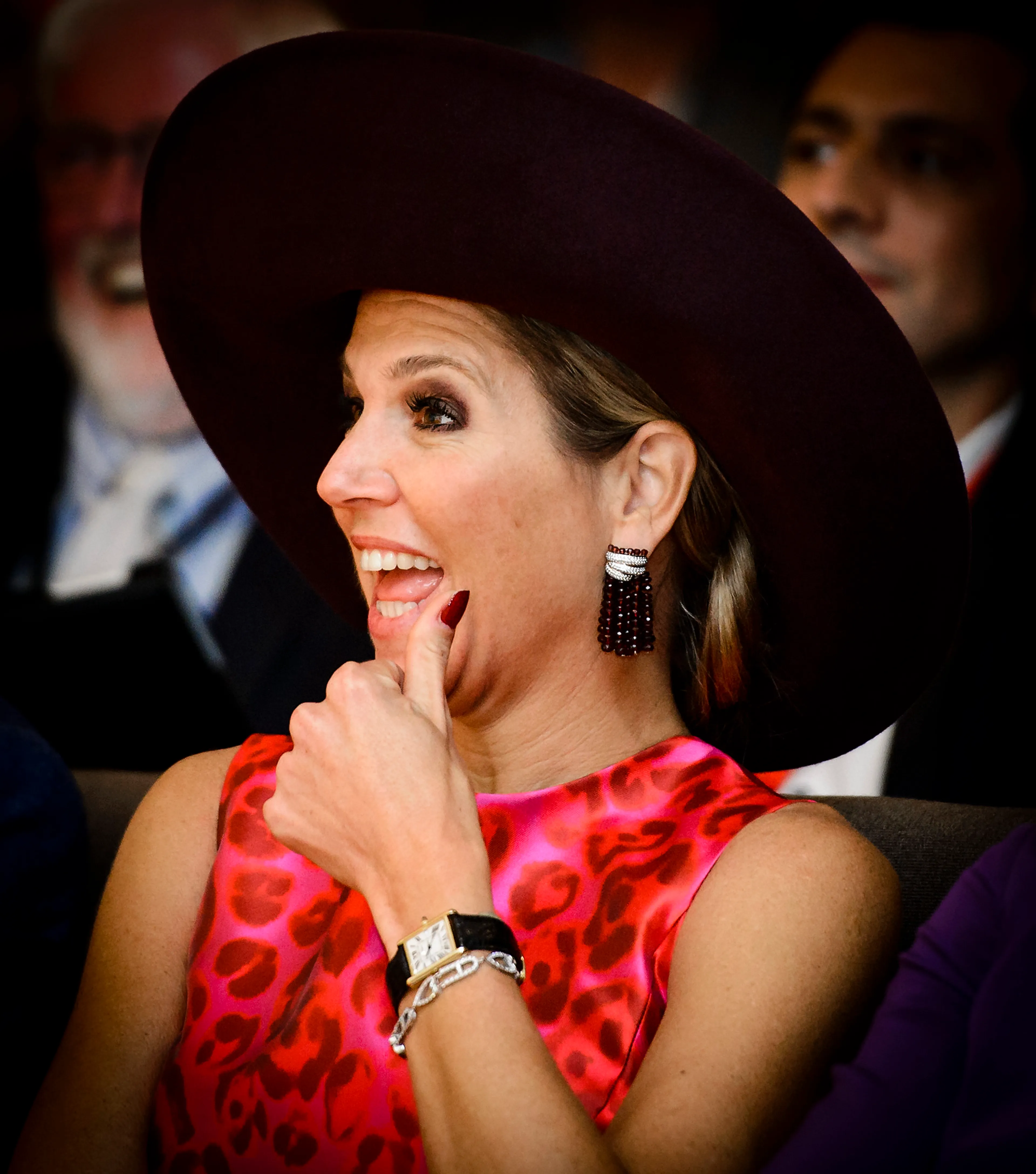 De dierenprints zijn alweer een tijdje helemaal terug in het modebeeld. Koningin Máxima kiest in 2015 al voor een hippe panterprint. De strakke roze jurk is van het modehuis Natan.