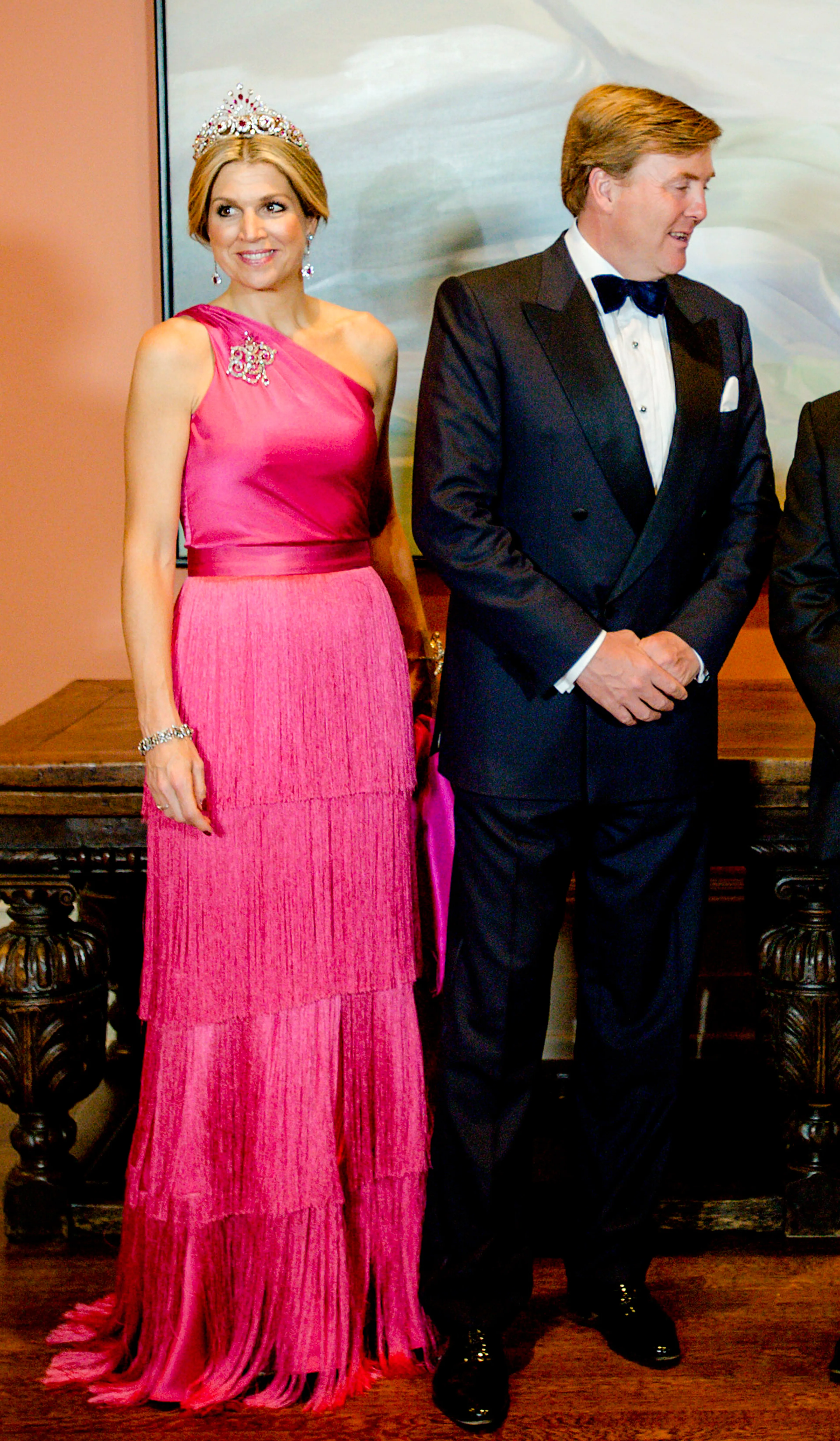 In juni 2017 brengen koning Willem-Alexander en koningin Máxima een staatsbezoek aan Italië. Voor de contraprestatie haalt Máxima een lichtroze avondjurk van Valentino uit de kast.