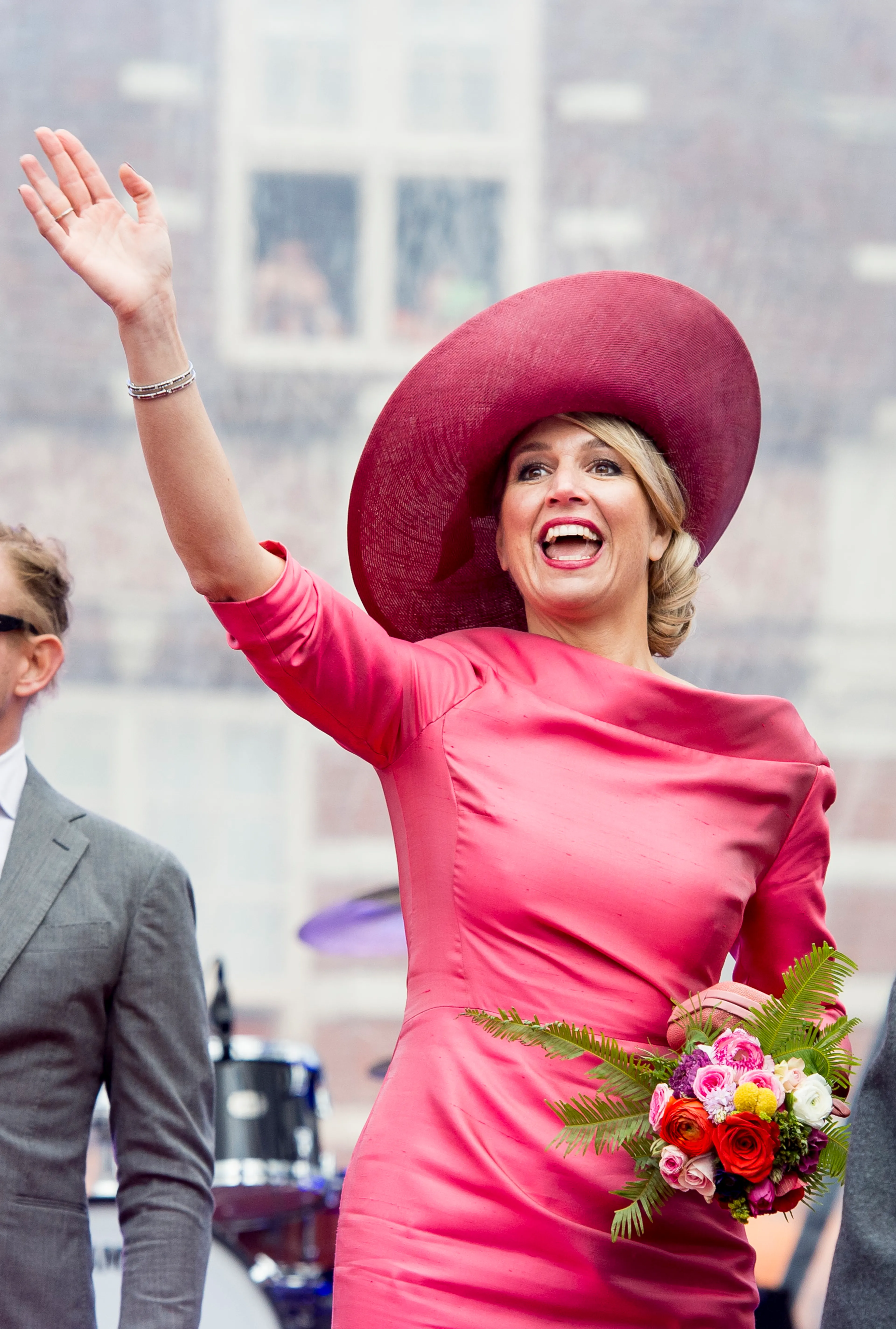Koningsdag 2015. Maxima viert het feest mee in een fuchsia japon met boothals en driekwart mouwen. Deze jurk van Natan zien we in de jaren daarna geregeld voorbijkomen.