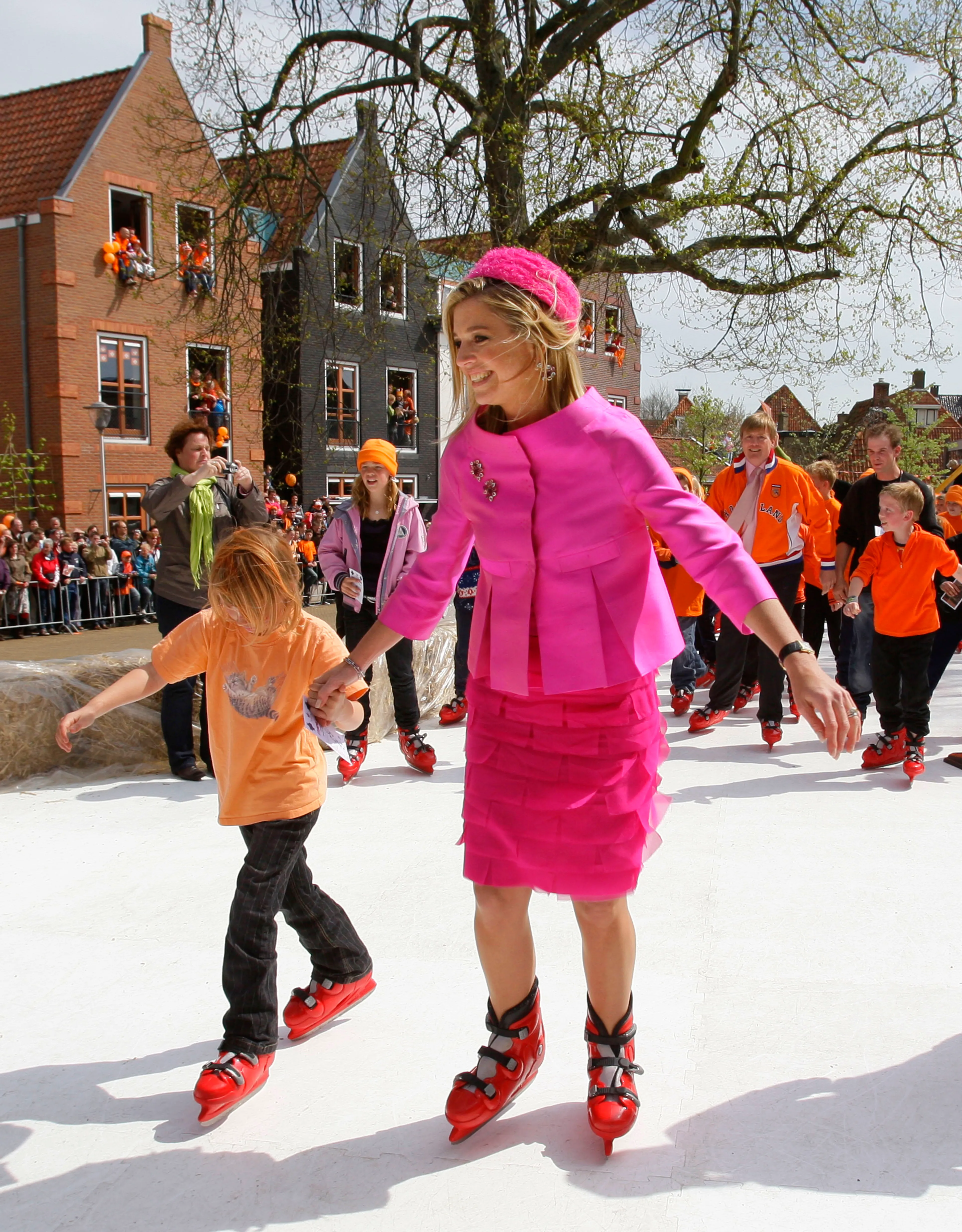 Wie herinnert zich dit nog? Máxima in het knalroze op de schaats tijdens Koninginnedag 2008 in Franeker. Haar fuchsia ensemble van Natan is geïnspireerd op Jackie Kennedy.