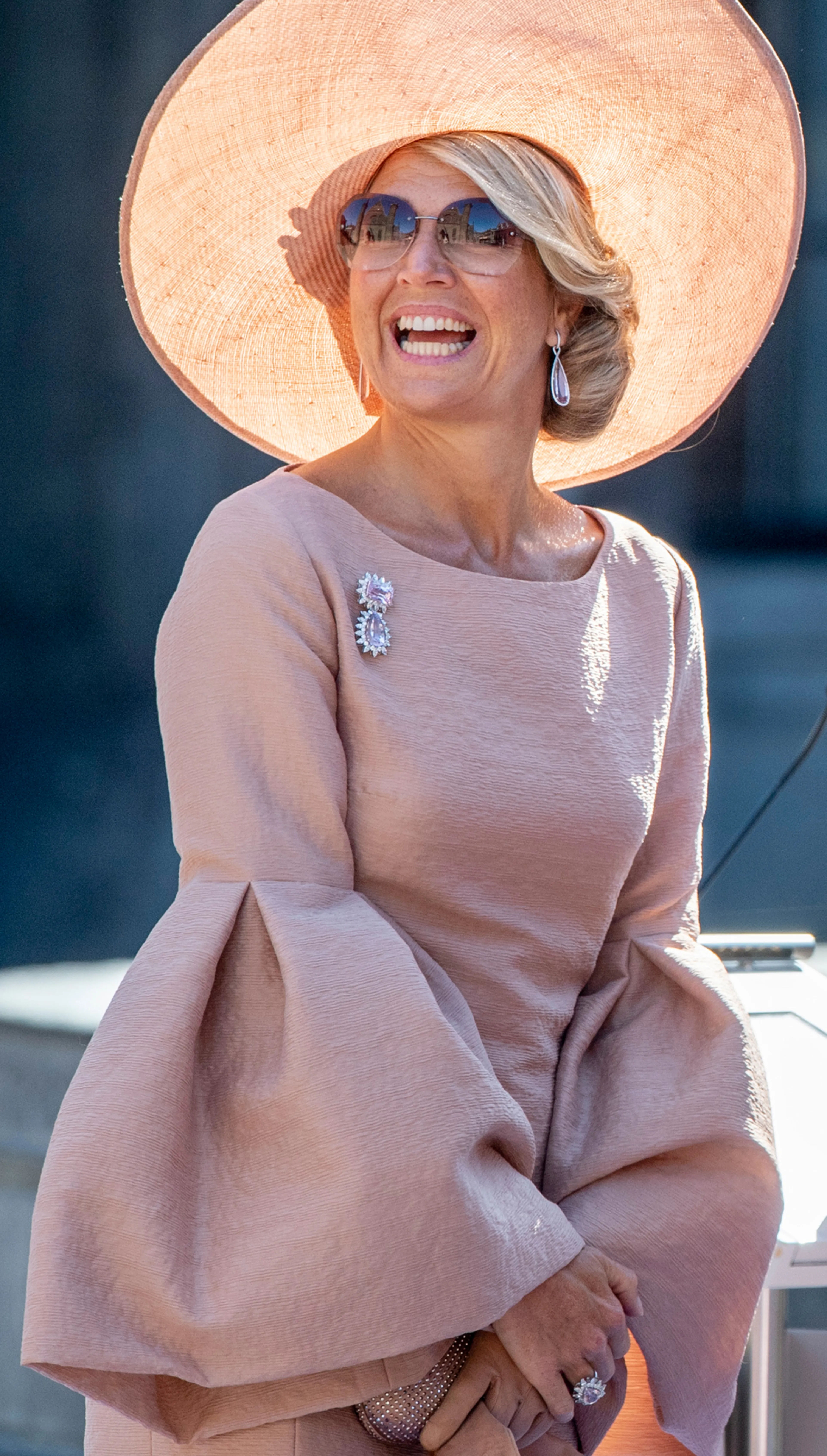 Een perfecte match. Máxima's zonnebril met lichtroze glazen komt van het bekende modehuis: Chanel. De zachtroze jurk met klokmouwen is van Edouard Vermeulen van Natan.
