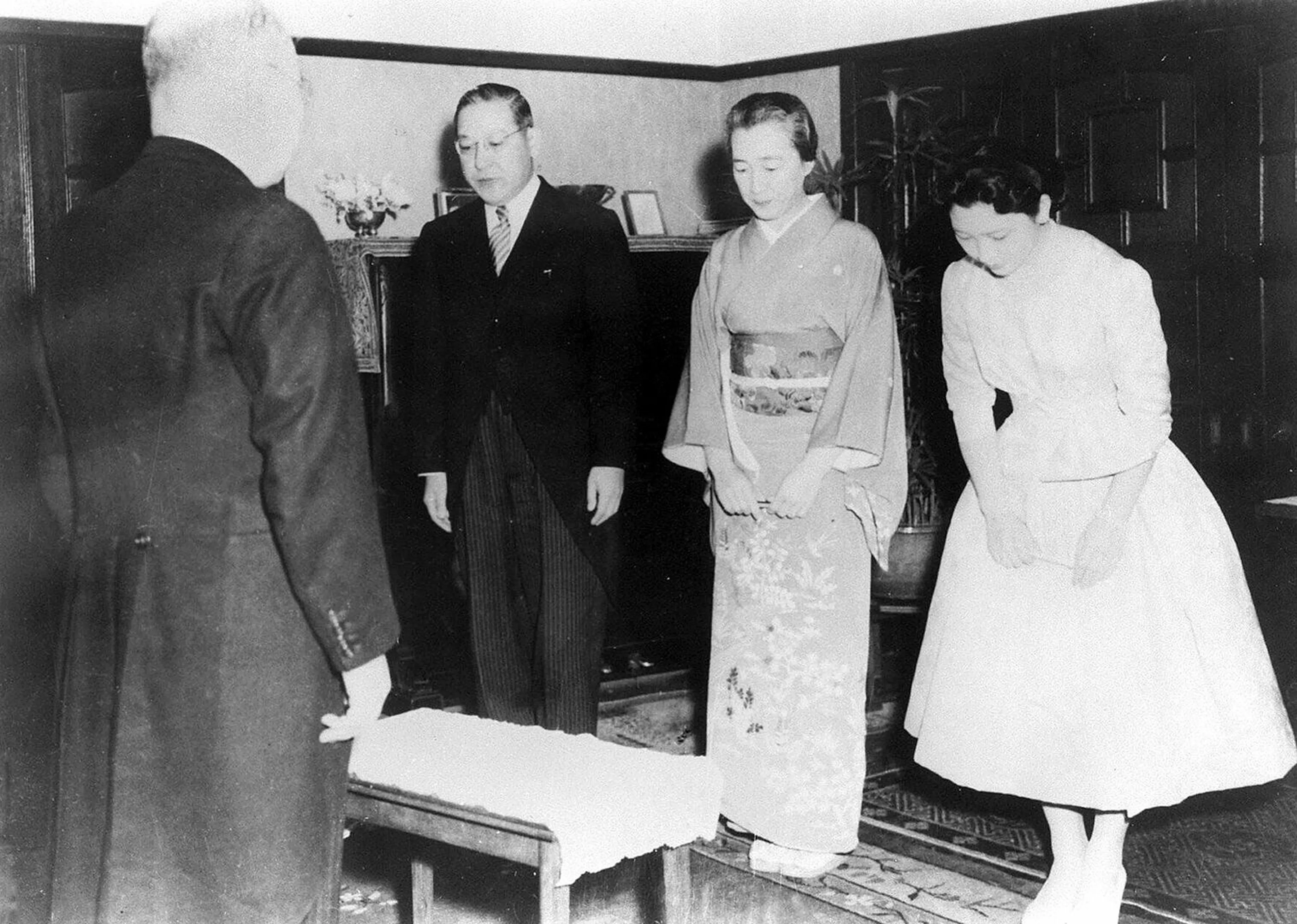 Voordat er getrouwd kan worden, moet eerst de verloving plaatsvinden. Een kamenier van de keizer komt thuis bij de familie van Michiko om de traditionele cadeaus te overhandigen: vissen, flessen saké en zijde.