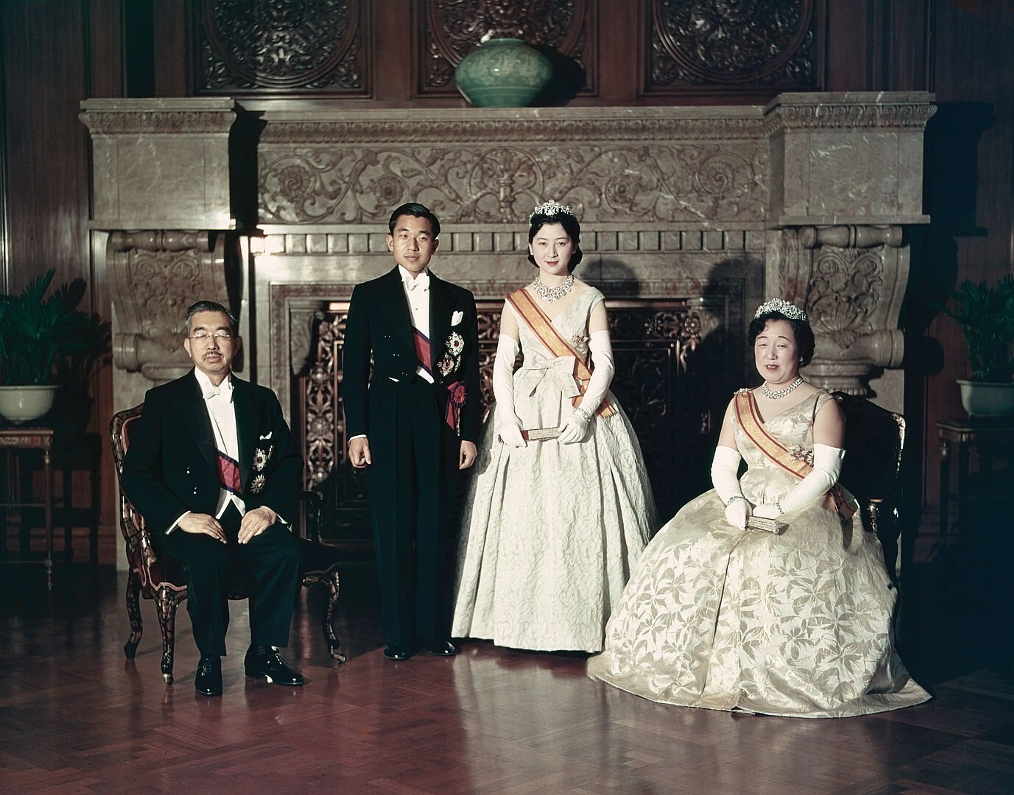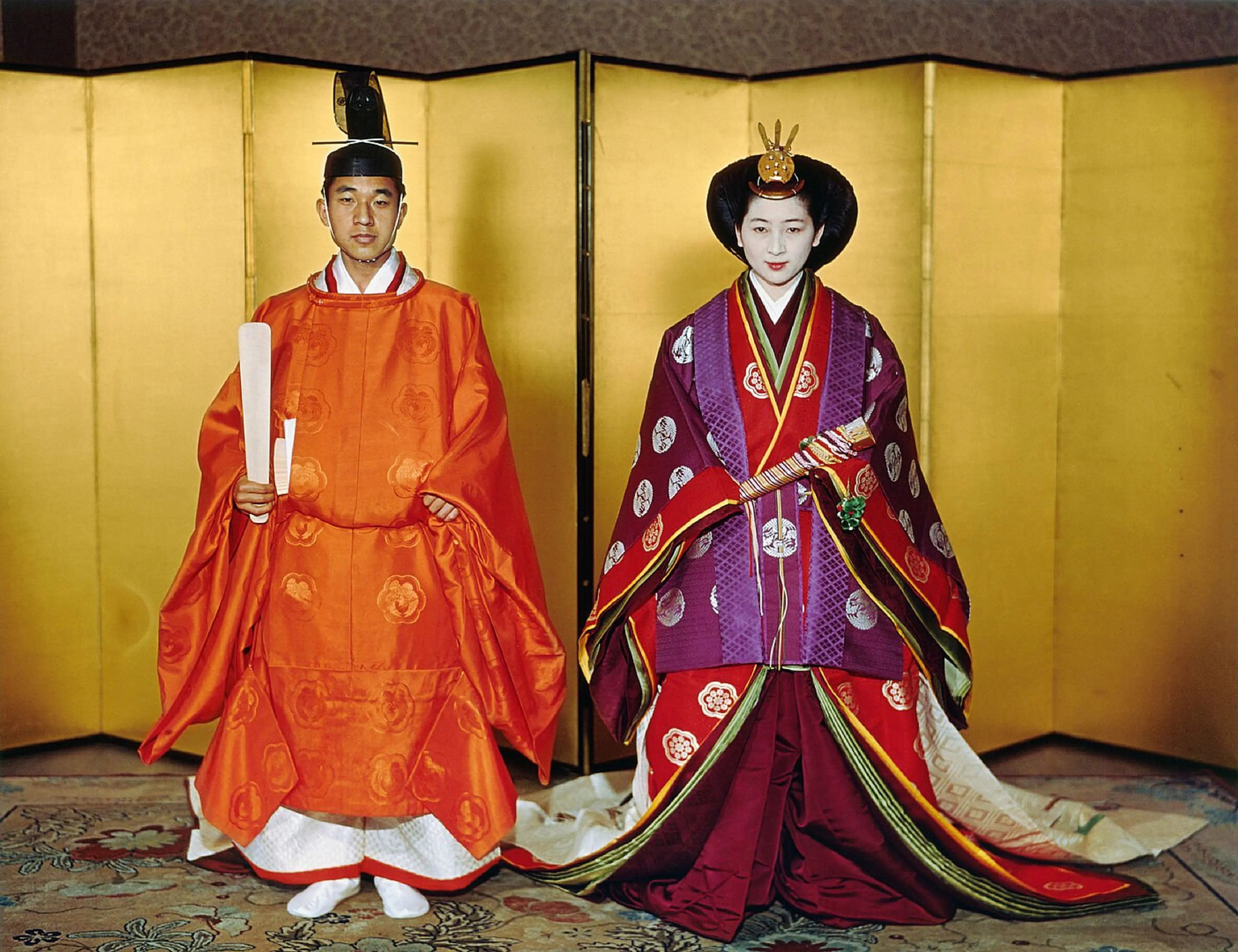 Het bruidspaar trouwt eerst volgens de Japanse traditie: Michiko draagt het klassieke juni-hitoe, een gewaad van zijde. Akihito draagt een oranje kledingstuk. Een verwijzing naar de zon en een kledingstuk dat alleen gedragen mag worden door de kroonprins. De huwelijksceremonie vindt plaats in een tempel op het terrein van het Koninklijk Paleis in Tokio.