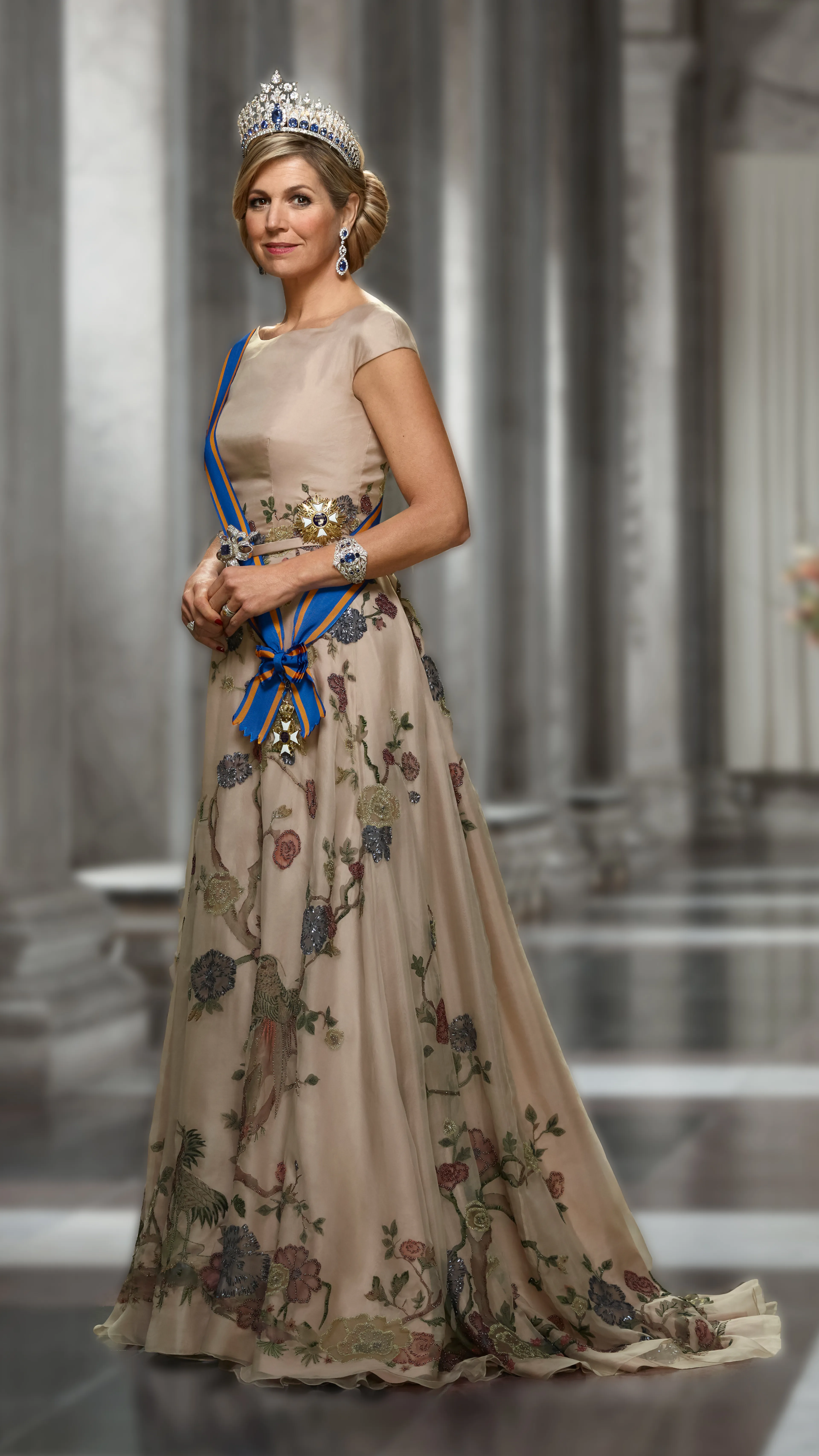 Mooi hoeft niet nieuw te zijn en daarom trok koningin Máxima voor de nieuwe staatsieportretten van Erwin Olaf een eerder gedragen japon van Jan Taminiau aan. Wat mij betreft hebben we het hier over Mode met een grote hoofdletter M, want het tafereel op de japon is helemaal met de hand geverfd en vervolgens gedecoreerd met heel verfijnd borduurwerk. Koninklijker kan bijna niet en dan hebben we het nog niet eens gehad over de Japanse Zaal van Huis ten Bosch, waar deze japon op is geïnspireerd. Hopelijk gaan we deze jurk in de toekomst nog veel vaker zien, want hier krijg ik nooit genoeg van.