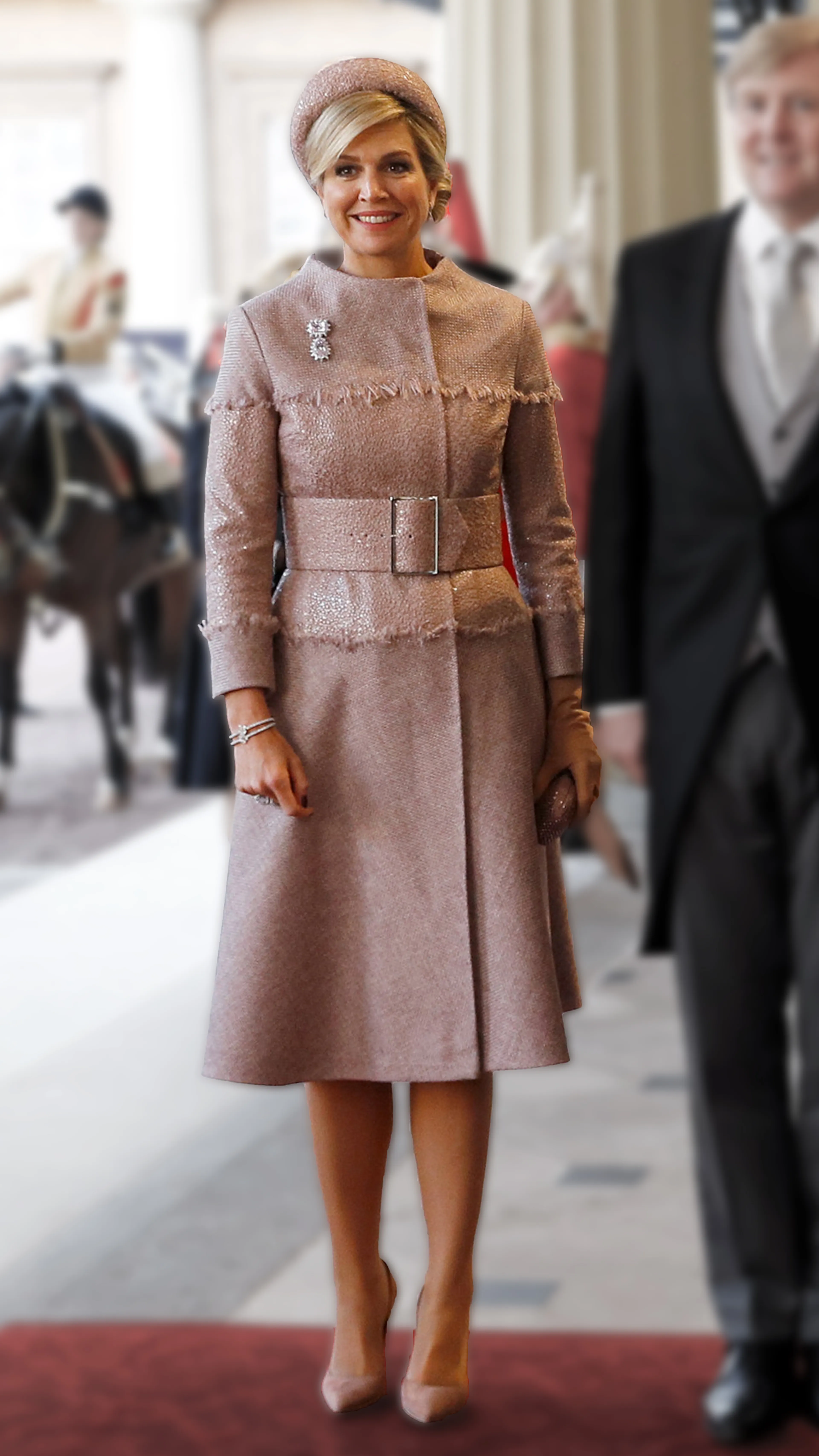 “Kleur is de taal van het oog dat luistert.” Een prachtige uitspraak van de Franse kunstschilder Paul Gauguin. Of koningin Máxima bekend is met de werken van de kunstenaar, weet ik niet. Wel blijkt uit haar kledingkeuzes dat zij goed op de hoogte is van het psychologische effect van kleur. Zo draagt ze bij zakelijke meetings vaak felrode kleding om haar kracht te onderstrepen, terwijl ze bij staatsbezoeken vaak een stapje terug doet door juist ingetogen kleuren te dragen. Zo kregen we op de eerste dag van het staatsbezoek aan het Verenigd Koninkrijk een zachtroze mantel van Claes Iversen te zien. Een bescheiden keuze, die door de brede riem, de haarband en de juwelen toch typisch Máxima is. Na wat twijfelen heb ik de outfit uiteindelijk op nummer 4 gezet, mede dankzij de heerlijke combinatie tussen klassiek (belijning) en modern (de ceintuur en rafels).