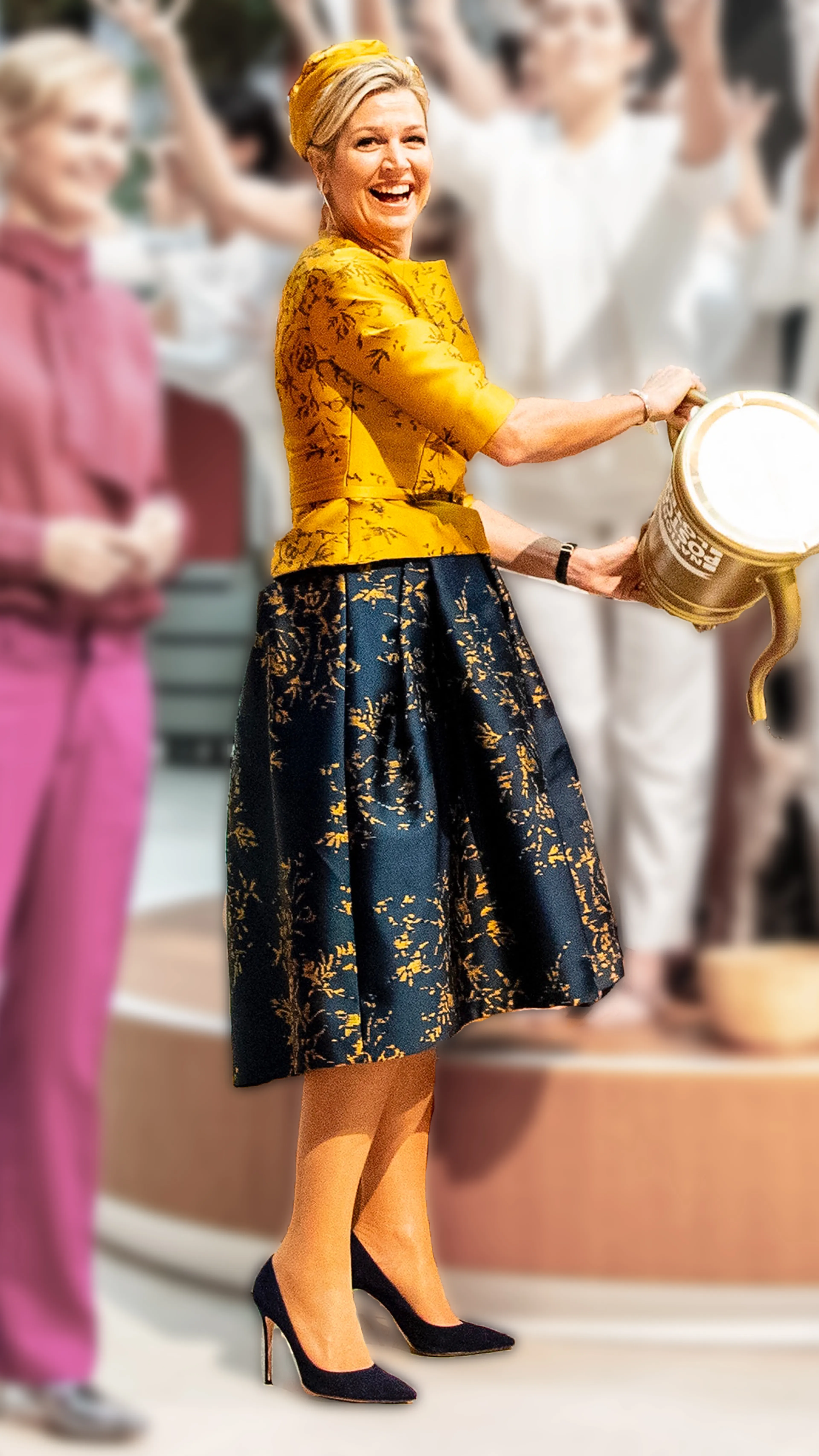 Voor de opening van het nieuwe kantoor van de Goede Doelen Loterijen bestelde Máxima bij modehuis Natan een deux-piece van een tweezijdig jacquardweefsel. De voorzijde van de stof is gebruikt voor de top en hoed, terwijl de achterzijde van de stof terug te zien is bij de rok. Een mooie keuze, want zo sluiten de kleuren perfect bij elkaar aan. En als we toch naar het totaalplaatje kijken, verdienen de mooie pumps ook wel wat aandacht.
