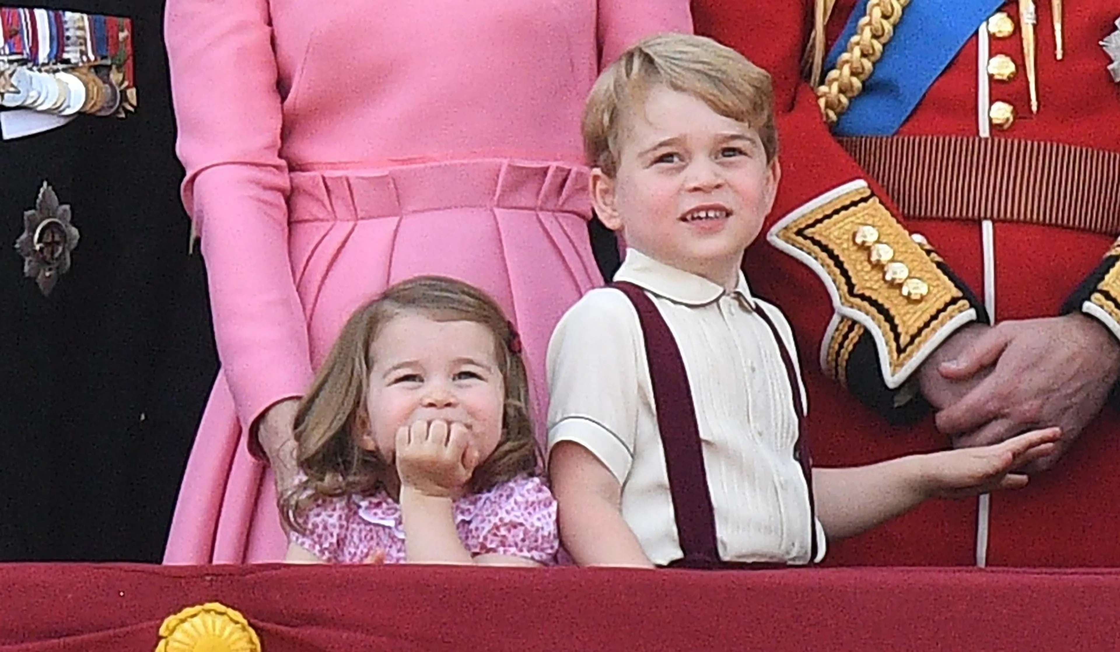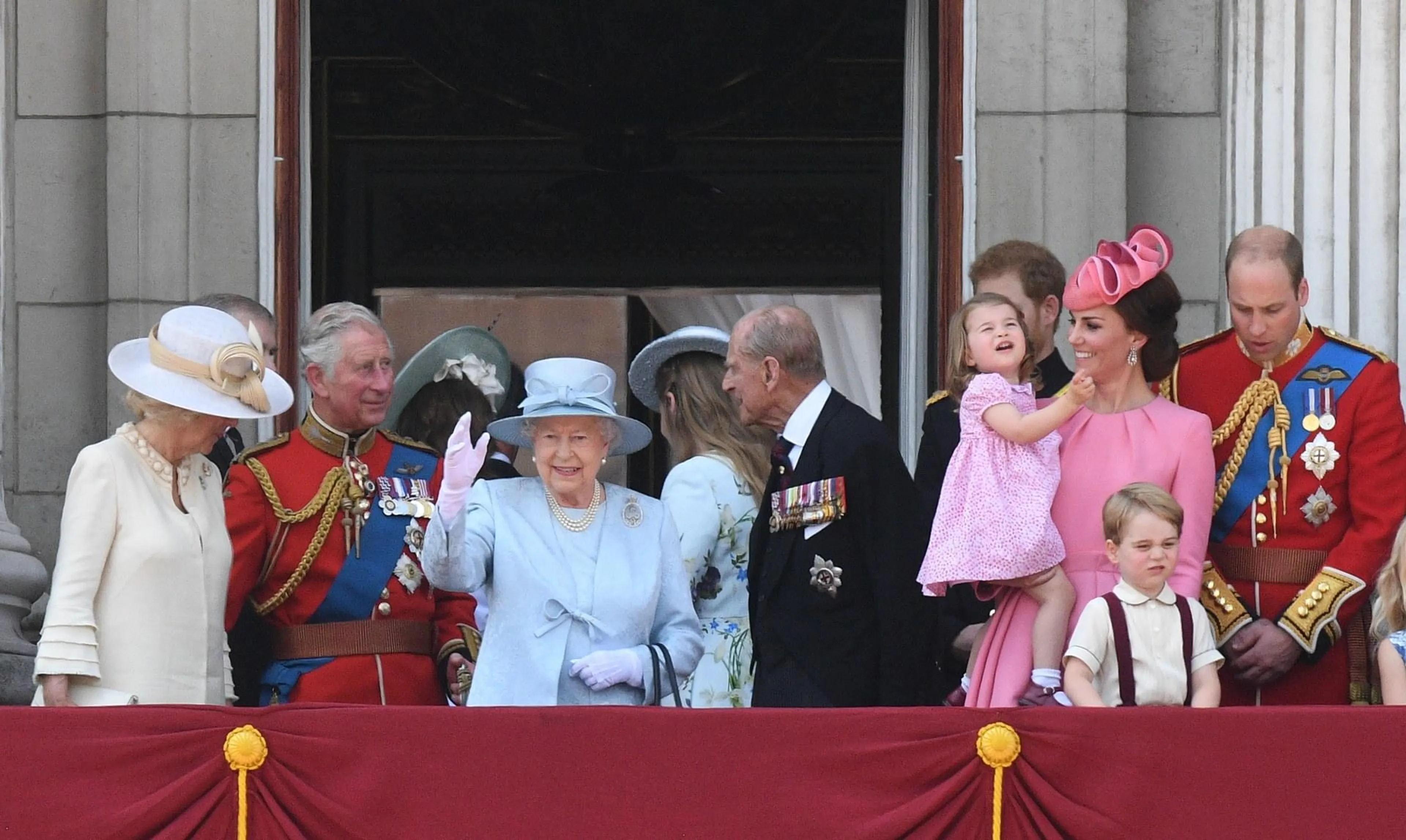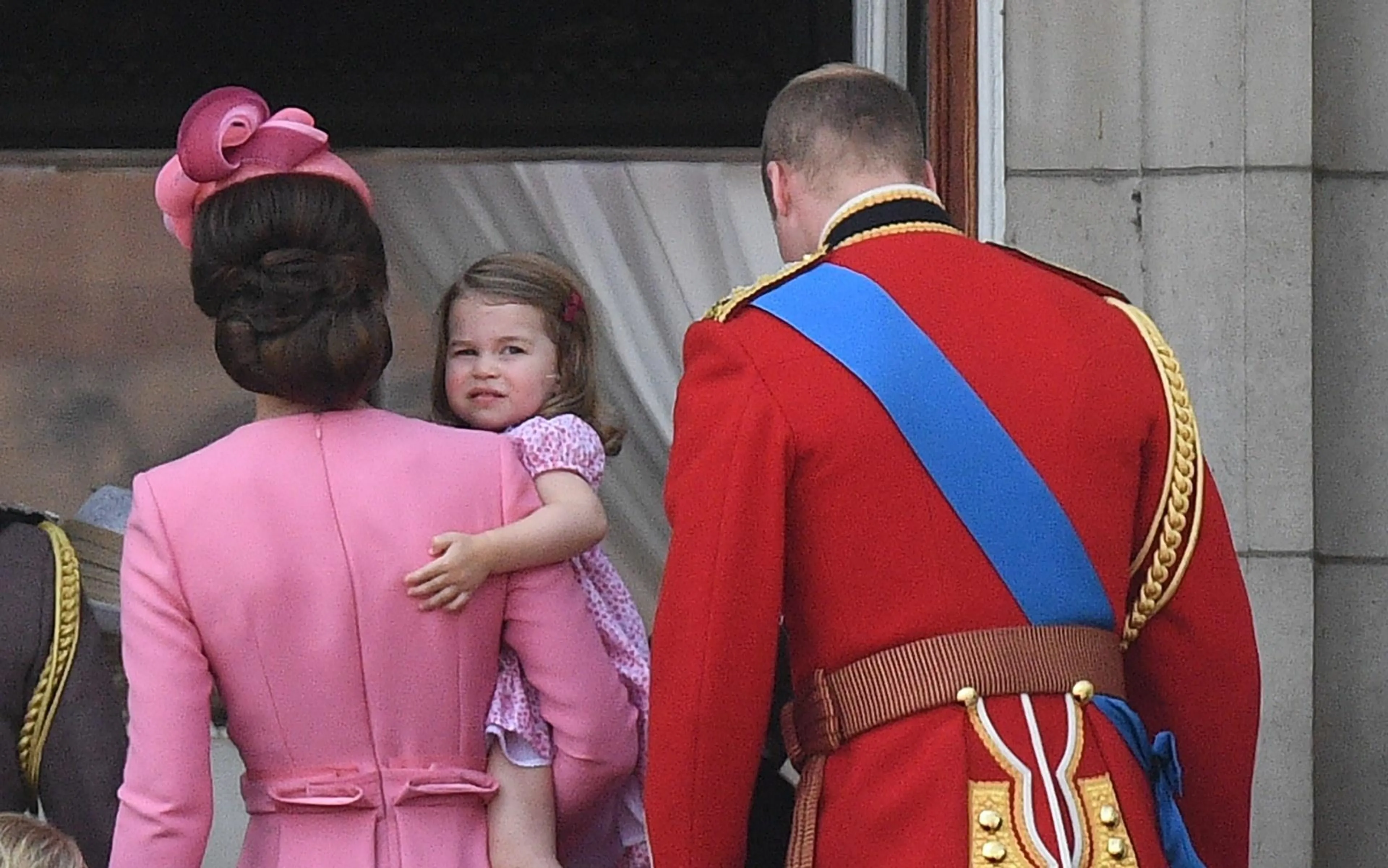 Prinses Charlotte (2) droeg een roze jurkje, passend bij de roze japon van haar moeder Catherine. Prins George (3) verscheen op het balkon van Buckingham Palace in een roomkleurig overhemd met bordeauxrode bretels, terwijl zijn vader in zijn rode uniform de militaire parade ter ere van de 91e verjaardag van koningin Elizabeth gadesloeg. Catherine, de hertogin van Cambridge droeg een jurk van Alexander McQueen, met lange mouwen en subtiele plooien. Haar hoed, eveneens in de kleur roze, is volgens Hello! van ontwerper Jane Taylor. Voor prinses Charlotte was het de tweede keer dat ze aanwezig was tijdens de balkonscène van Trooping the Color, waarbij de koninklijke familie keek naar overvliegende vliegtuigen van de Royal Air Force.