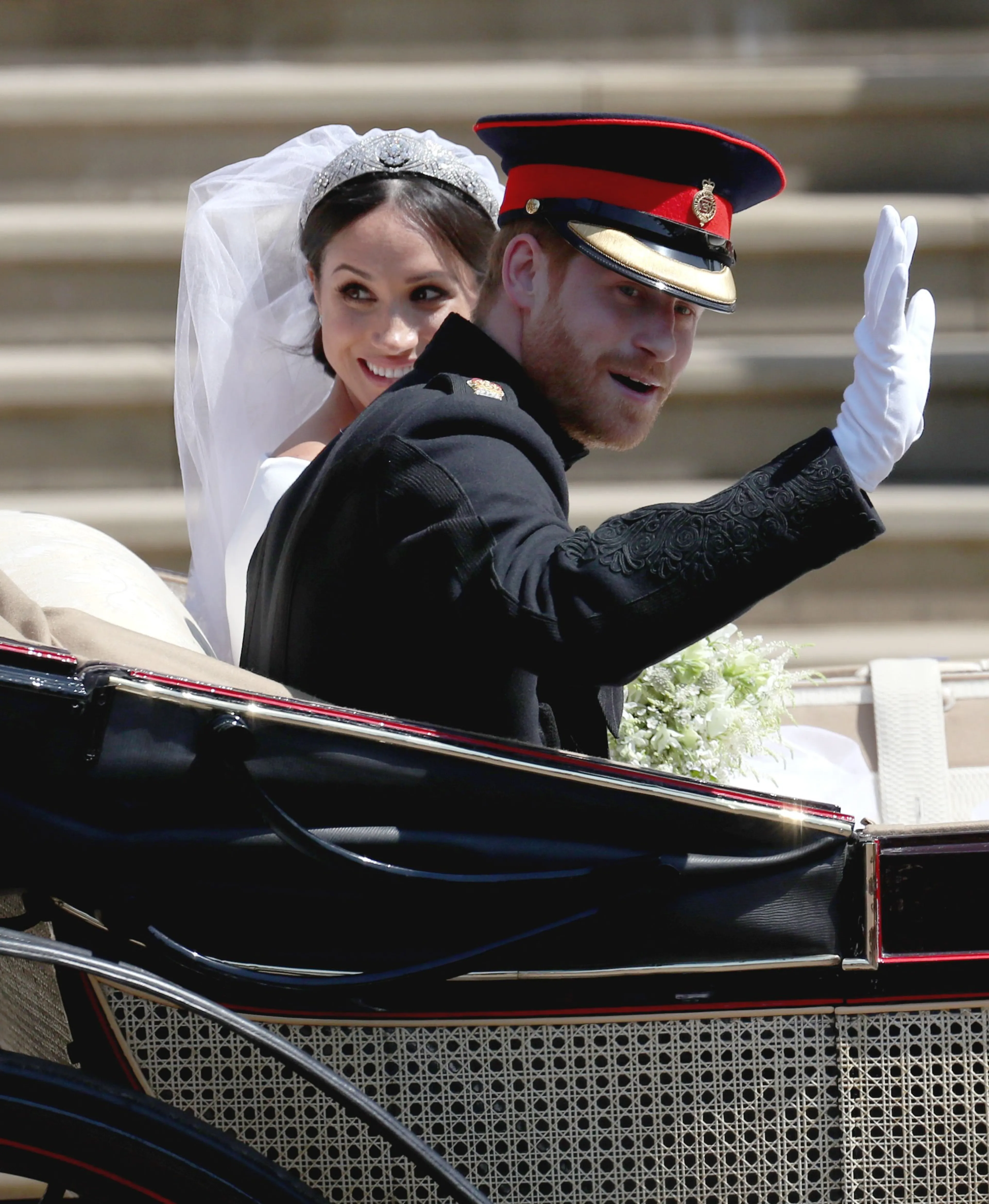 Prins Harry en zijn echtgenote Meghan hebben na de huwelijksplechtigheid in de St. George's Chapel een korte rijtoer gemaakt door Windsor.