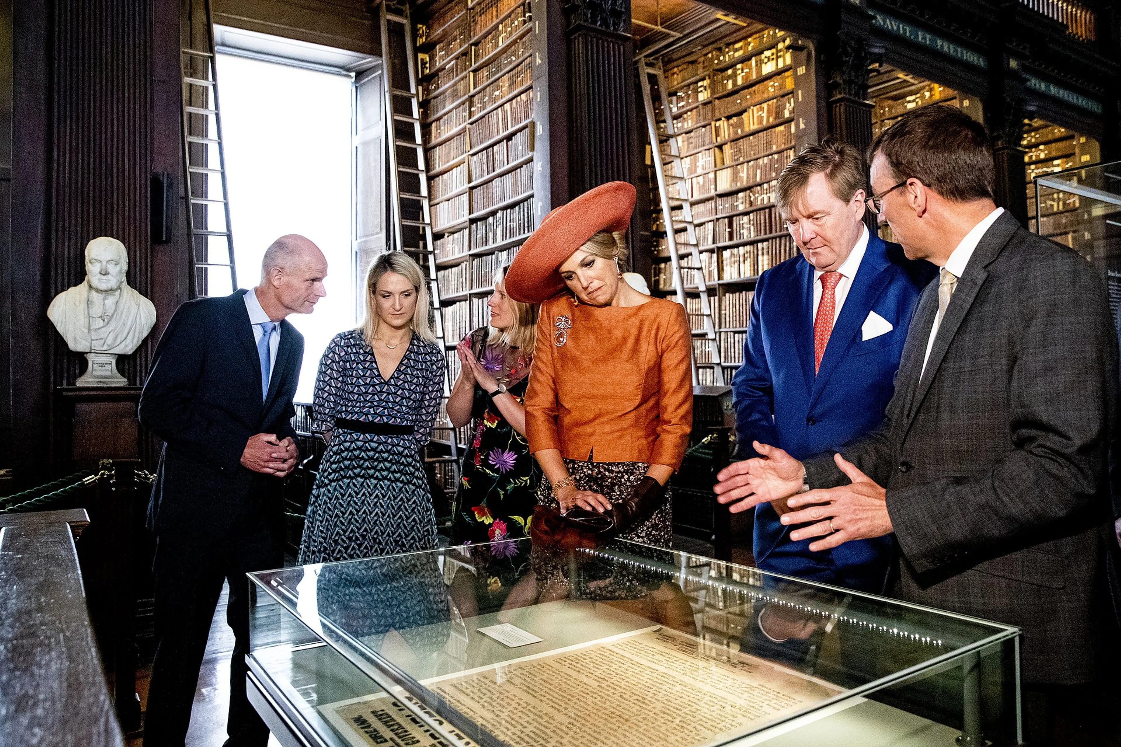 Koning Willem-Alexander en koningin Máxima zetten hun ochtendprogramma voort met een bezoek aan de wereldberoemde bibliotheek van Trinity College en daarna een ontmoeting met 350 leden van de Nederlandse gemeenschap in Ierland.