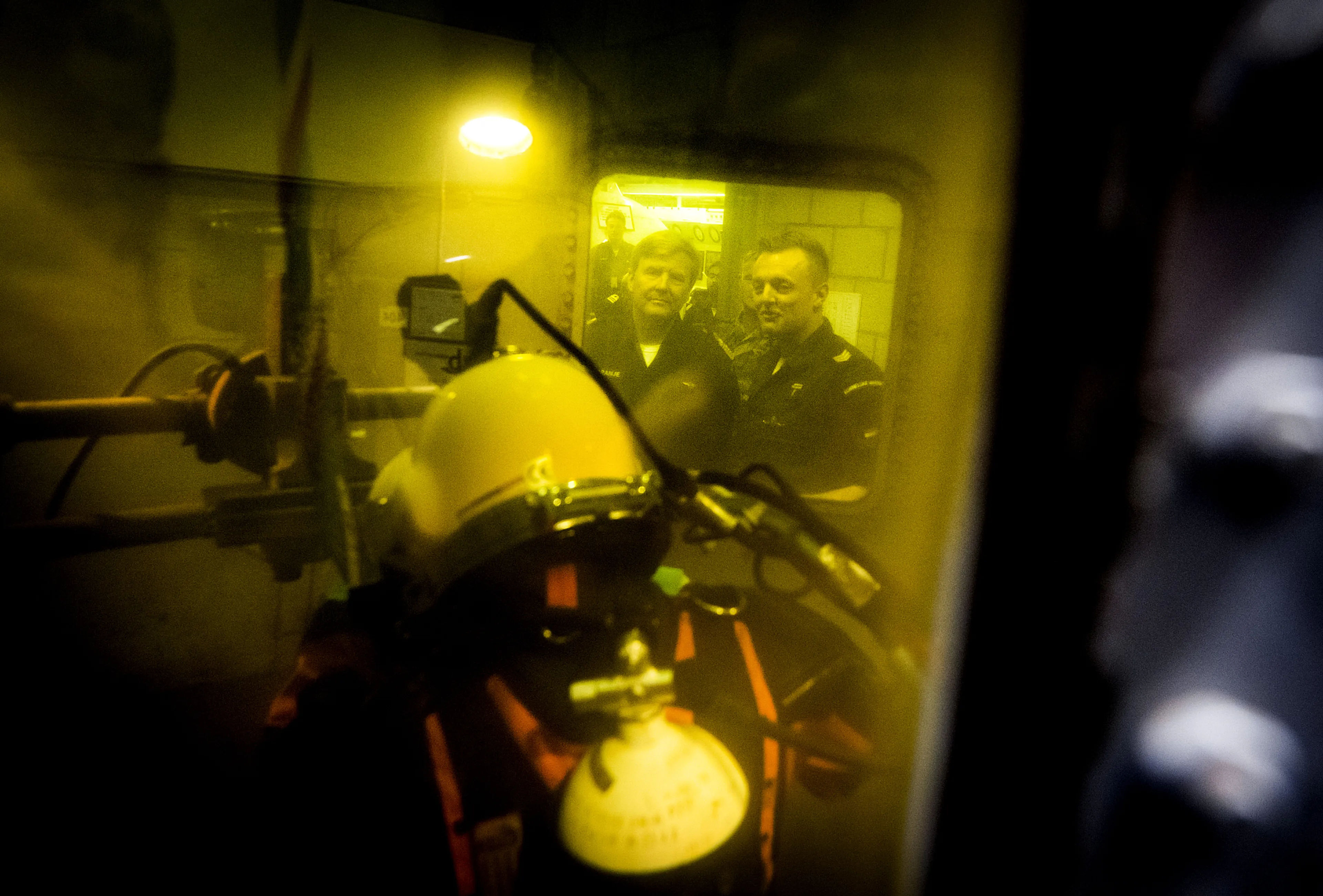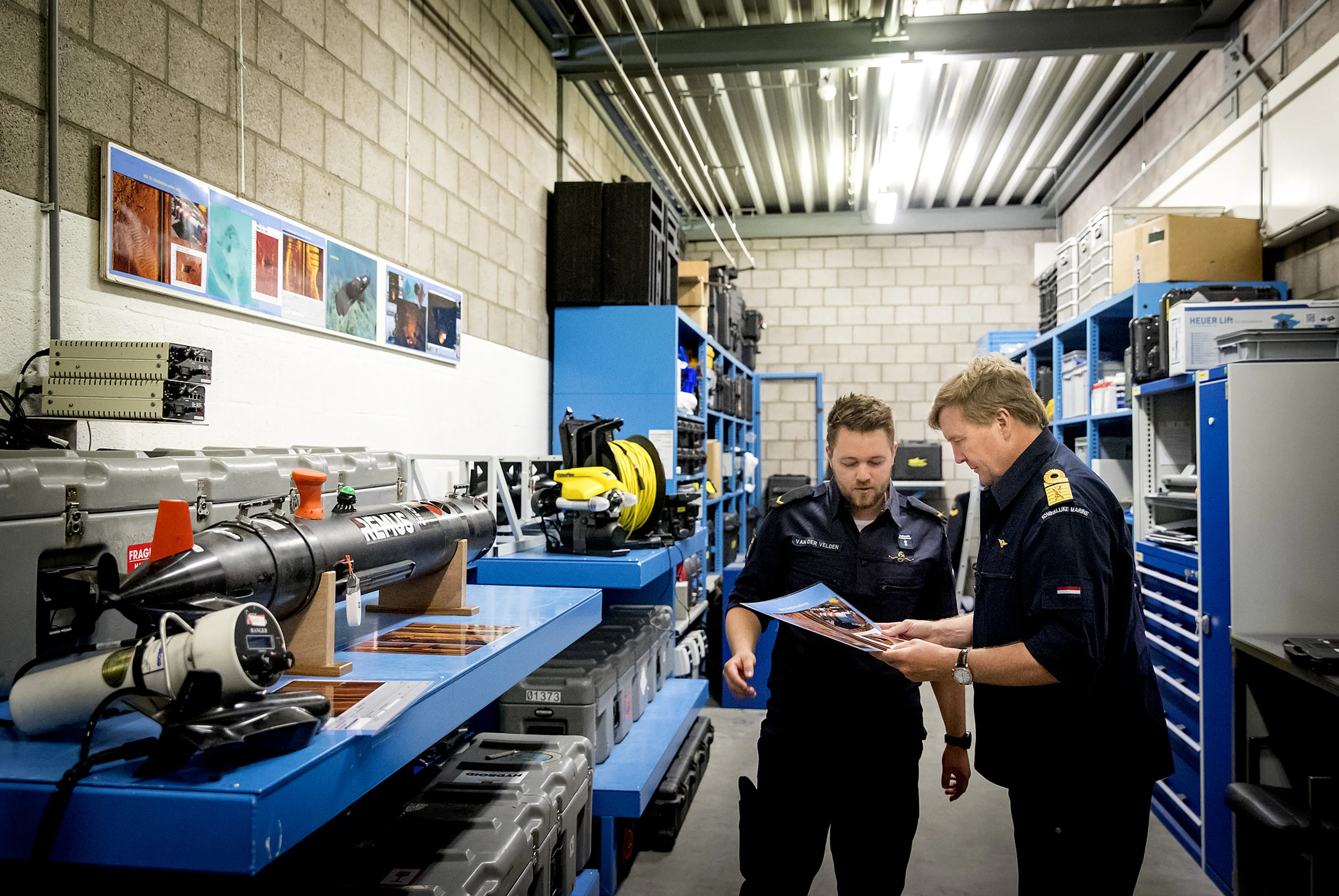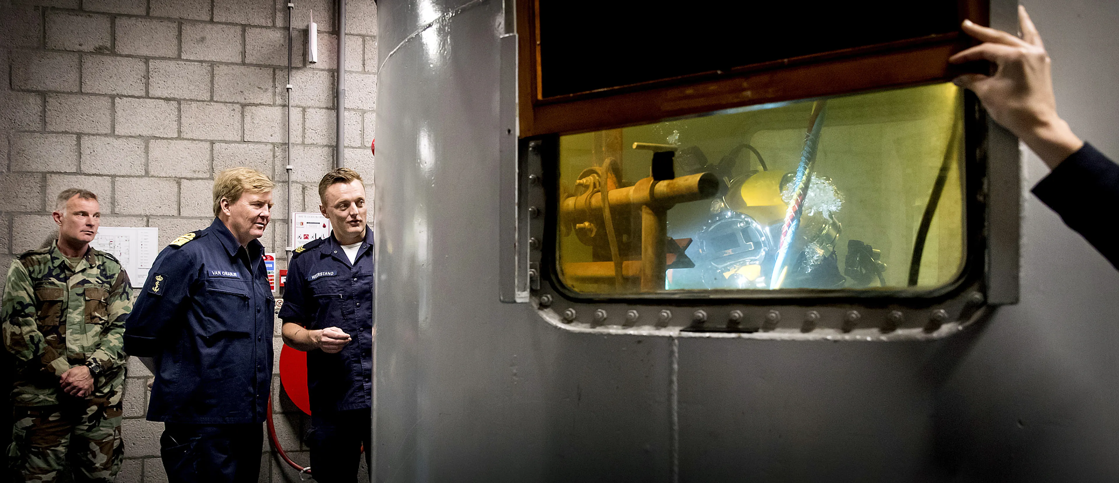 Hierna werd de koning rondgeleid en demonstreerden specialisten verschillende middelen en moderne zoekmethodes om mijnen te vinden en te ruimen. Ook liet een duiker in een onderwatertank zien hoe onderhoud en reparaties aan marineschepen worden verricht. Daarnaast nam Willem-Alexander een kijkje in duiksimulator ‘Medusa’, die door duikers wordt gebruikt als test- en trainingsruimte.