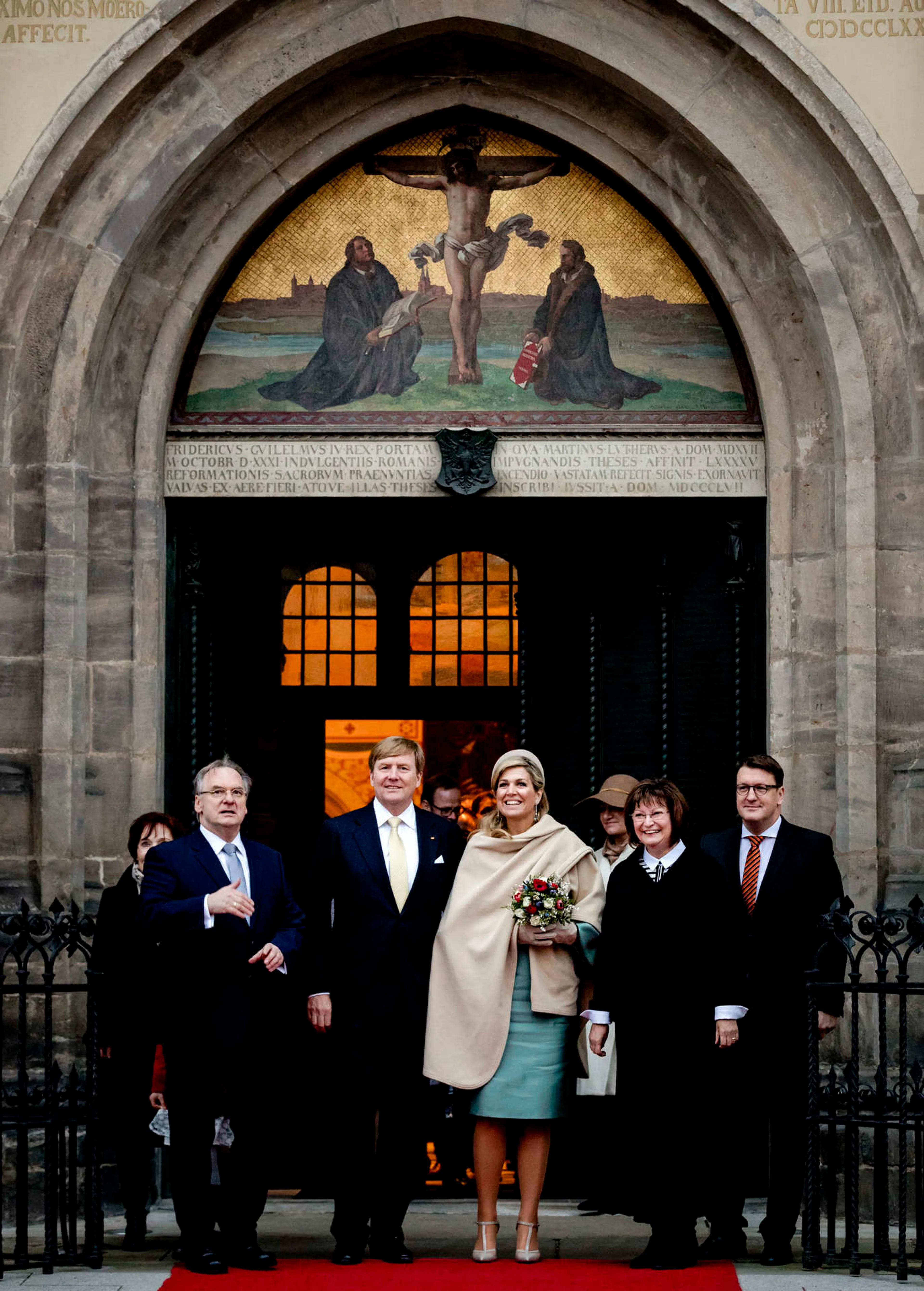 Voor Wittenberg betekende het bezoek van Willem-Alexander en Máxima de derde koninklijke visite in vier maanden tijd. Vanwege het 'Luther jaar' kwamen vorig jaar al de Deense koningin Margrethe en het Zweedse koningspaar naar Wittenberg. In de kerk klonk Luthers lied 'Een vaste burcht is mijn God' bij binnenkomst van het Nederlandse gezelschap. Predikant Hanna Kasparick gaf vervolgens tekst en uitleg bij beelden, wapens en andere kenmerkende onderdelen van de rijkelijk versierde kerk. Zo wees ze op het portret van Gaspard de Coligny, vader de Louise de Coligny. "Vierde vrouw van Willem van Oranje", voegde Kasparick er ten overvloede aan toe. Dat wist de koning al. Ook werd het graf van Maarten Luther bekeken.