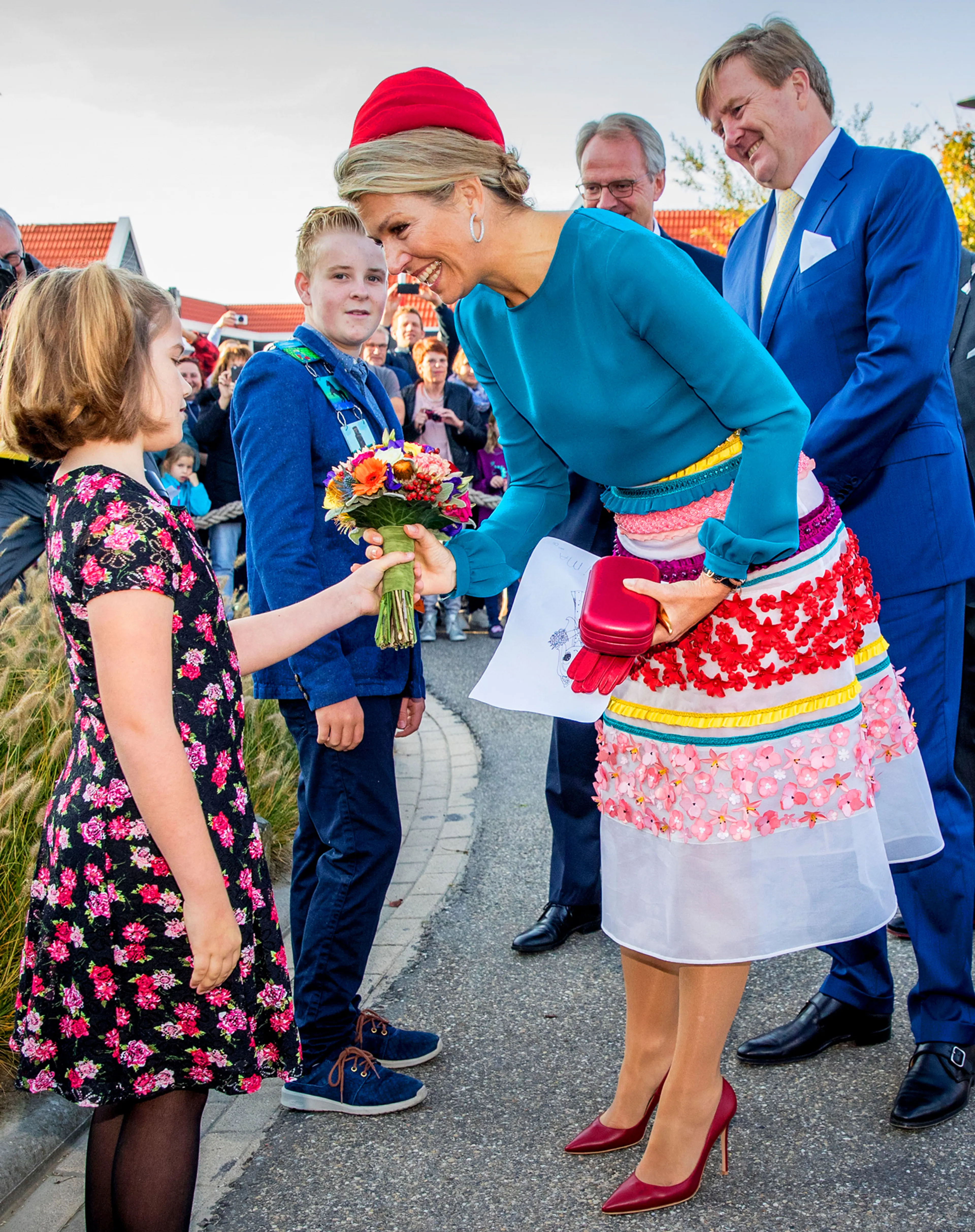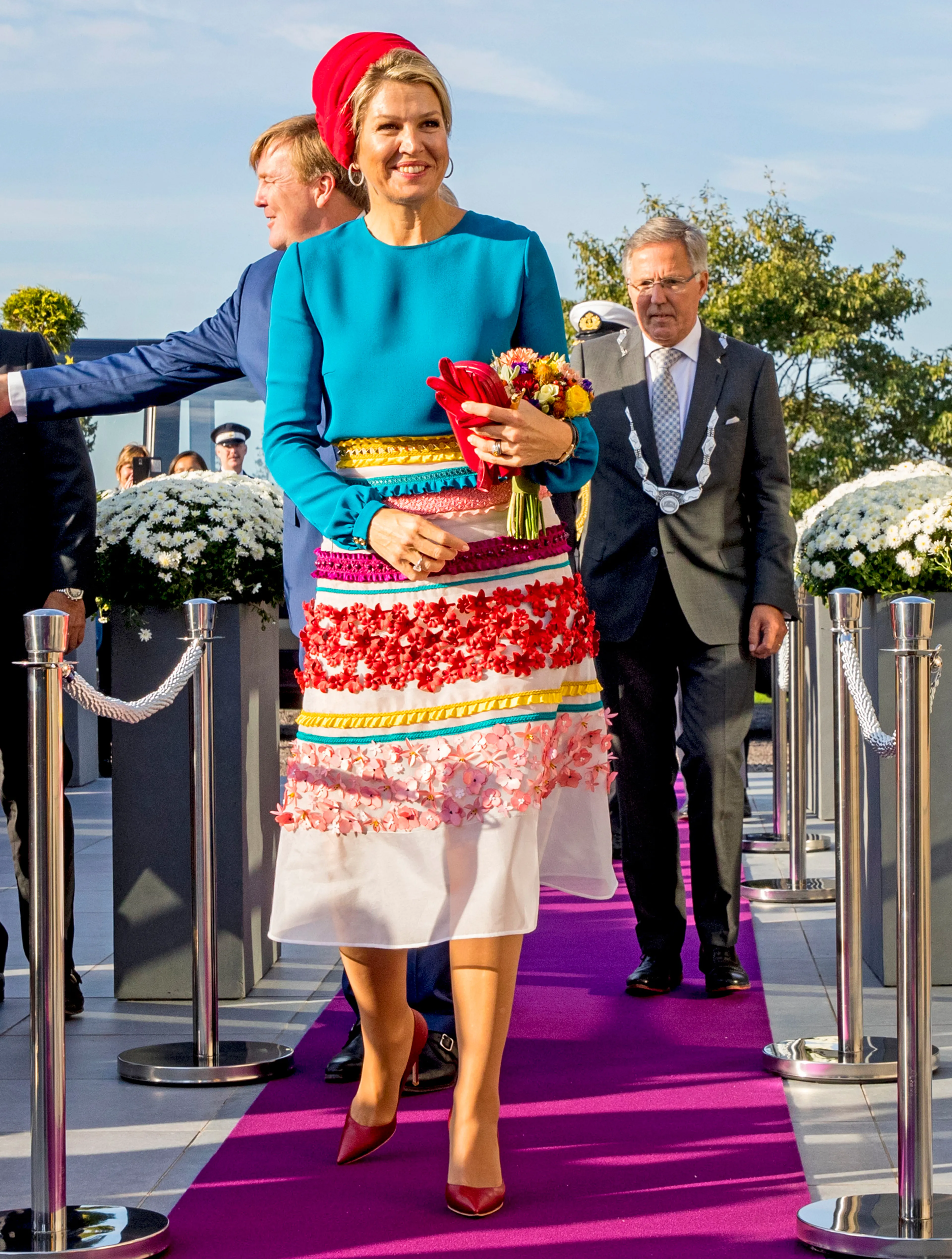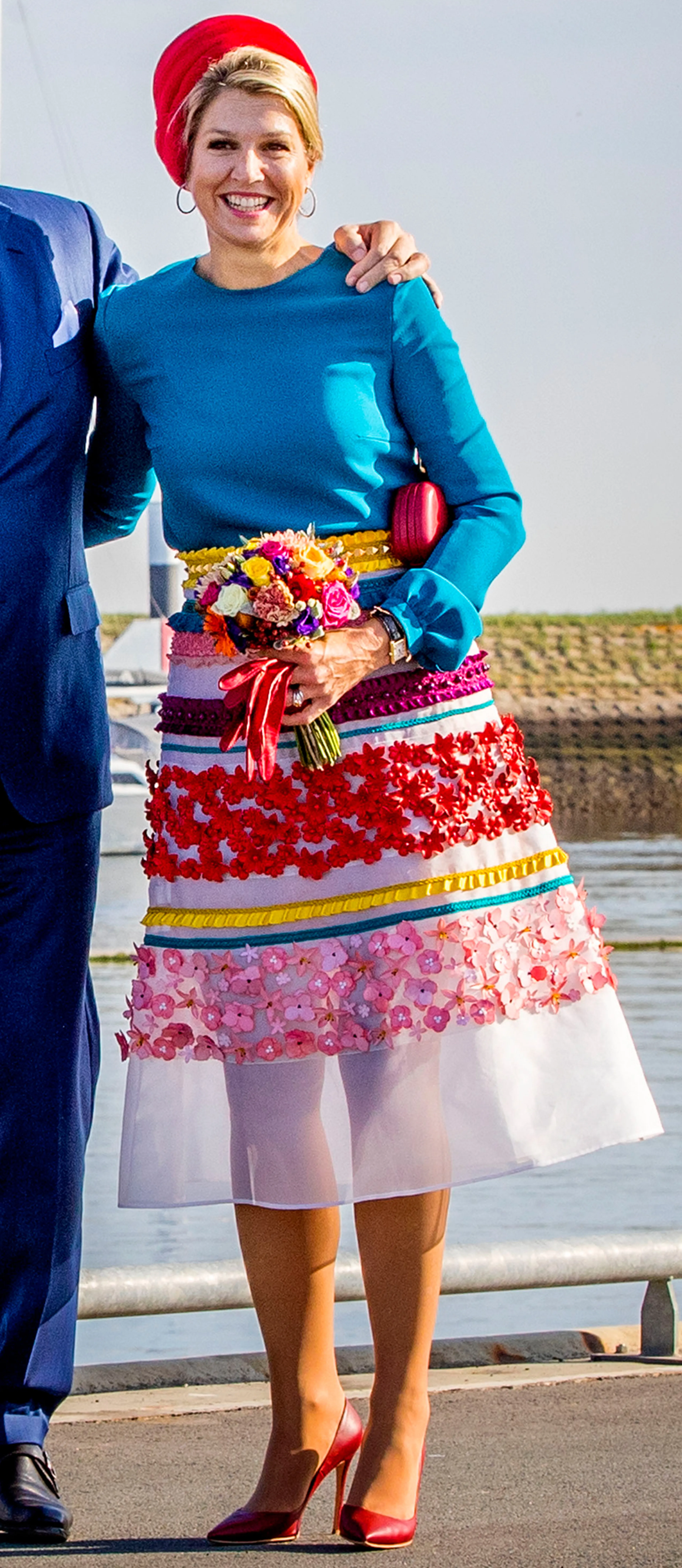 Koningin Máxima heeft dinsdag voor het streekbezoek aan Schouwen-Duiveland en Tholen een nieuwe outfit uitgekozen. Ze draagt een kleurrijke midi-rok van modeontwerper Claes Iversen gecombineerd met een blauwe blouse.