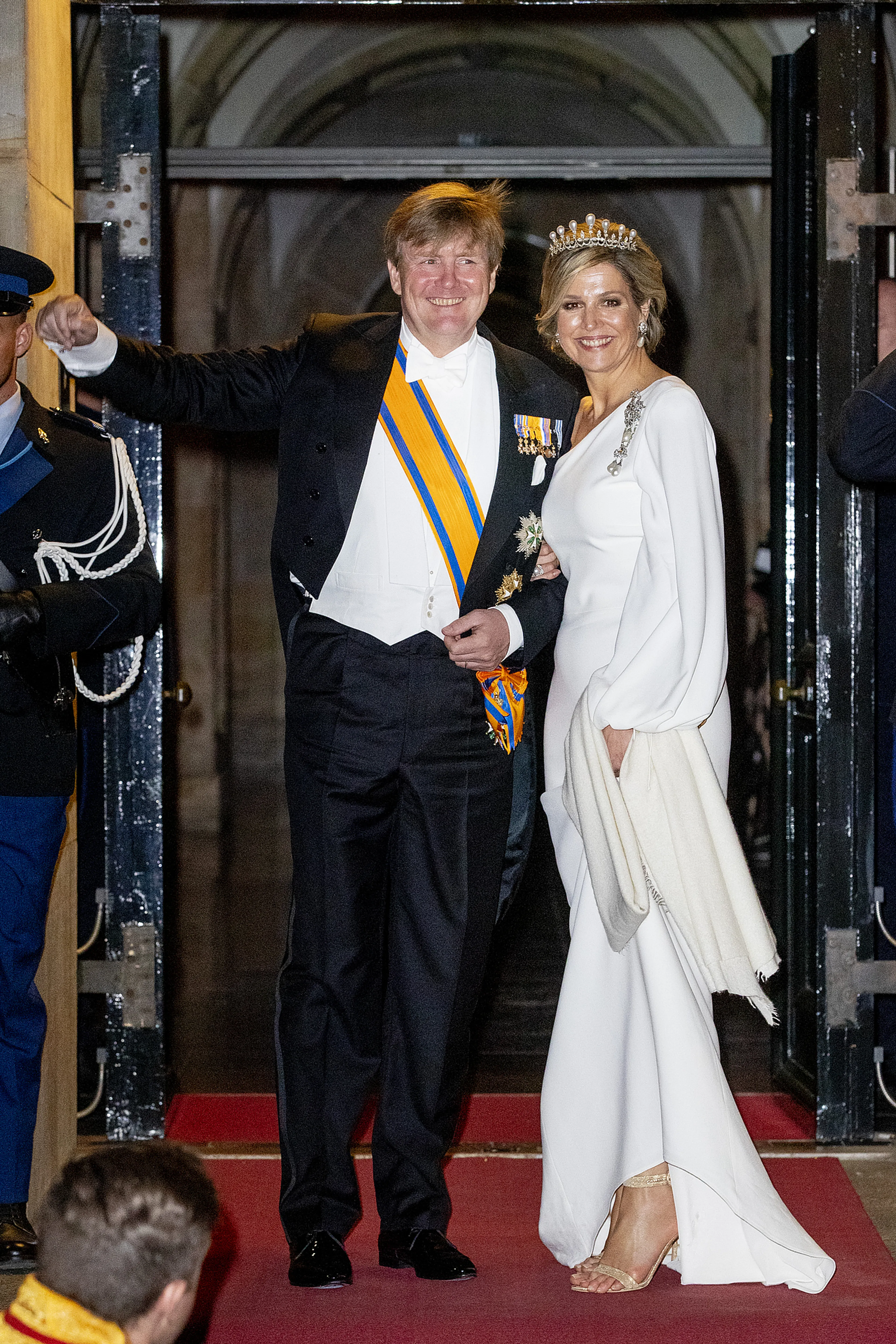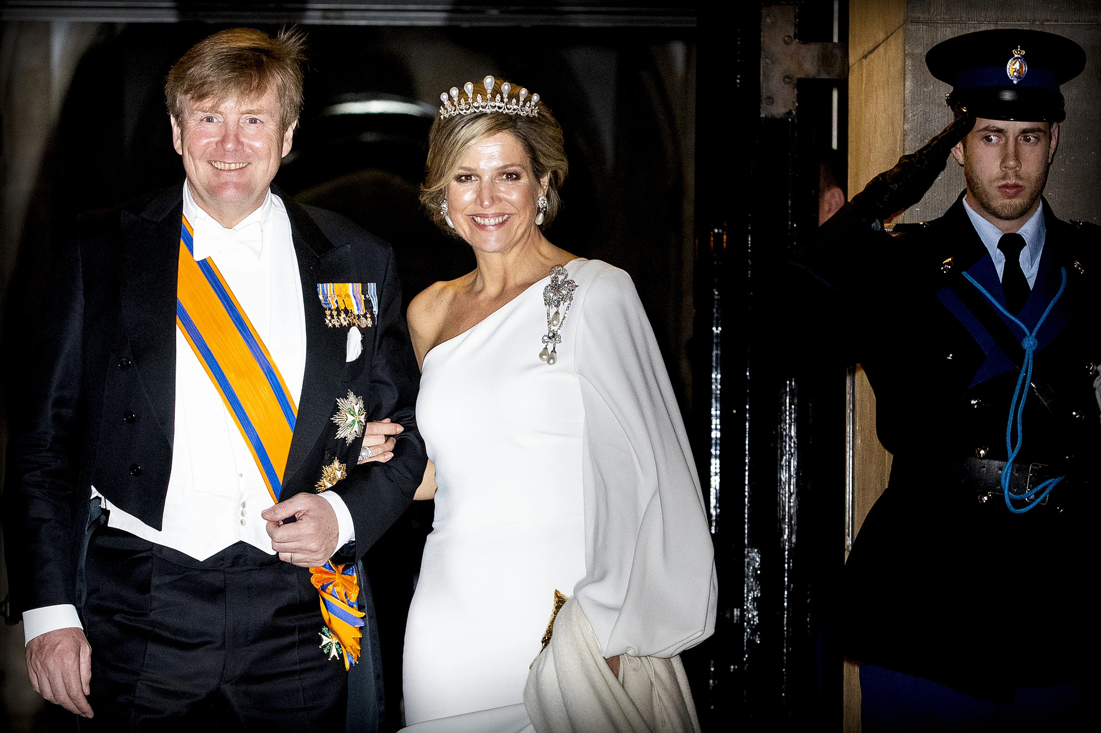 Koning Willem-Alexander en koningin Máxima hebben dinsdagavond het corps diplomatique ontvangen op het Koninklijk Paleis in Amsterdam. Behalve het koningspaar schoven ook prinses Beatrix en prinses Margriet aan bij het jaarlijkse galadiner. Máxima droeg niet één, maar twee outfits op deze bijzondere avond.