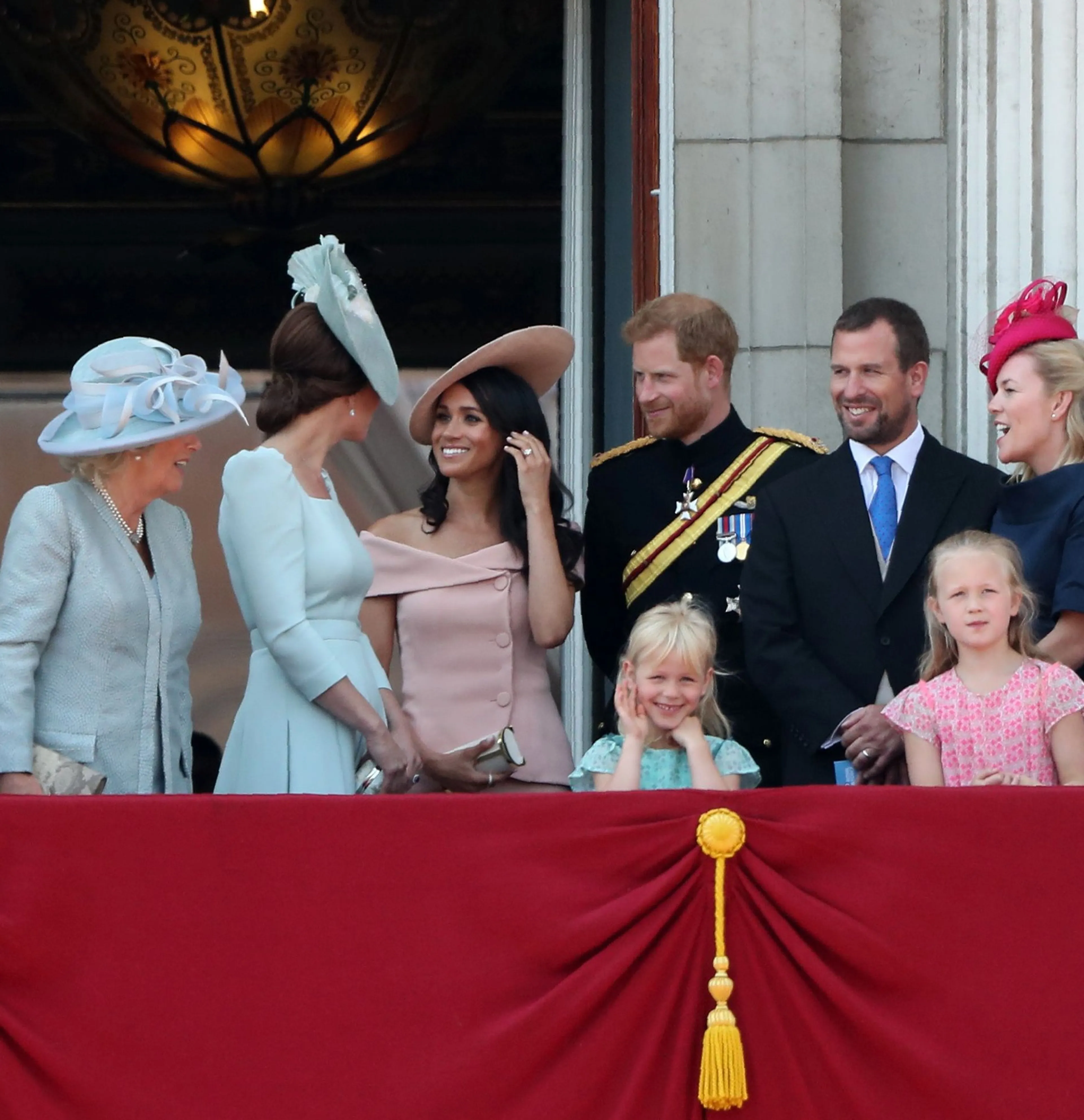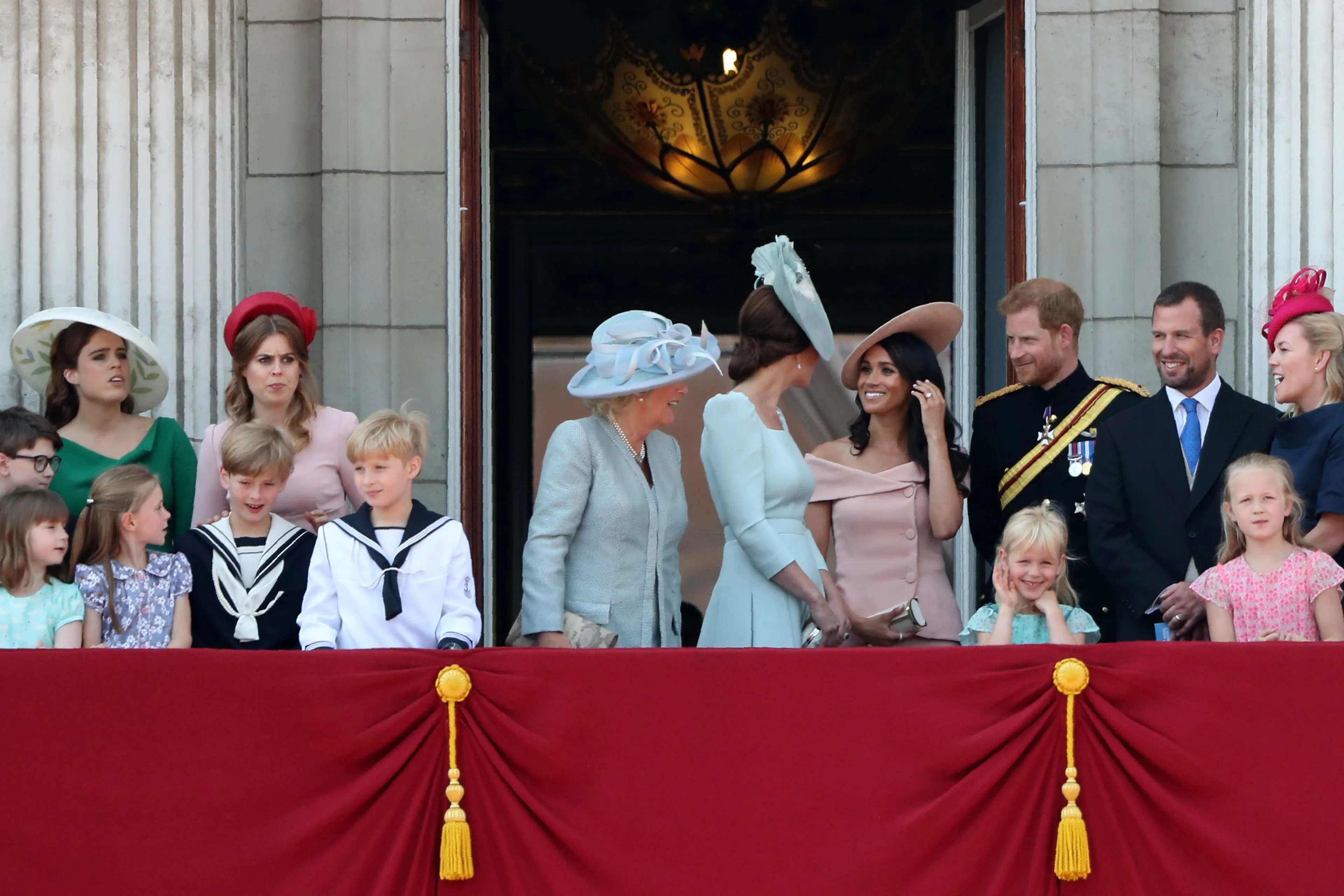 Hertogin Meghan stond zaterdag voor het eerst op het balkon van Buckingham Palace. De Amerikaanse, die vorige maand trouwde met prins Harry, was van de partij tijdens Trooping the Colour. De militaire parade is de officiële viering van de verjaardag van koningin Elizabeth, die eind april 92 jaar werd.