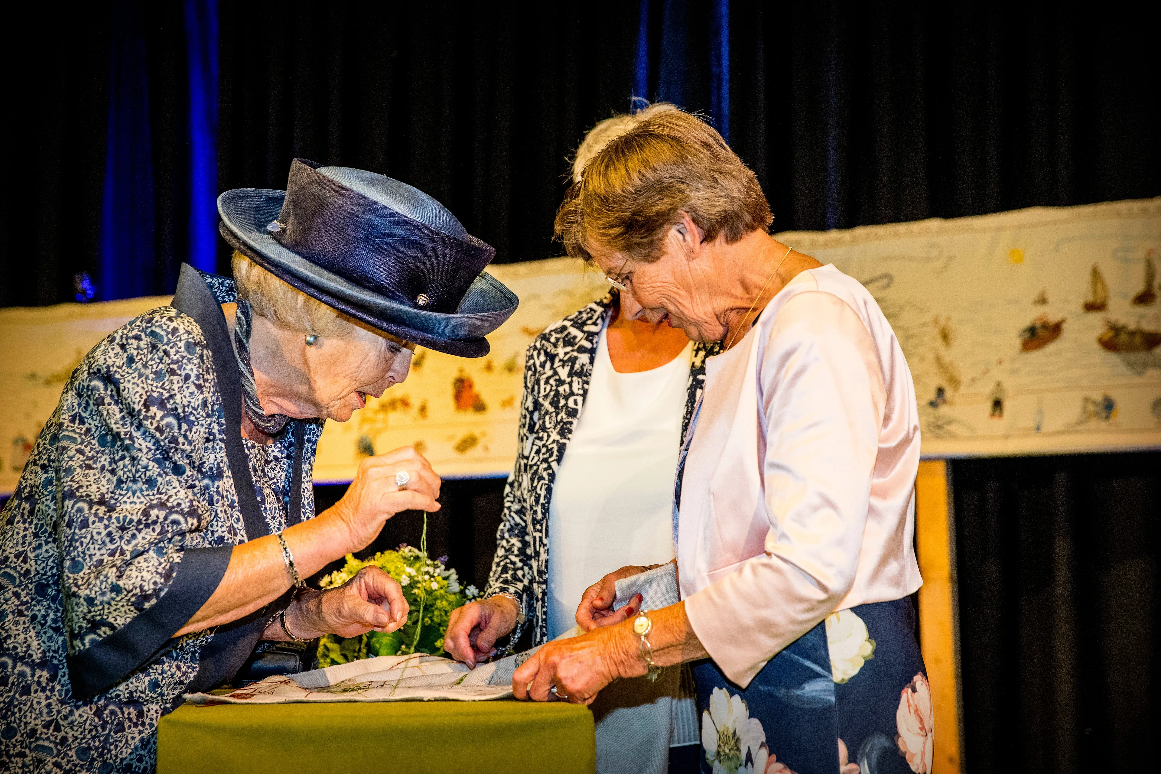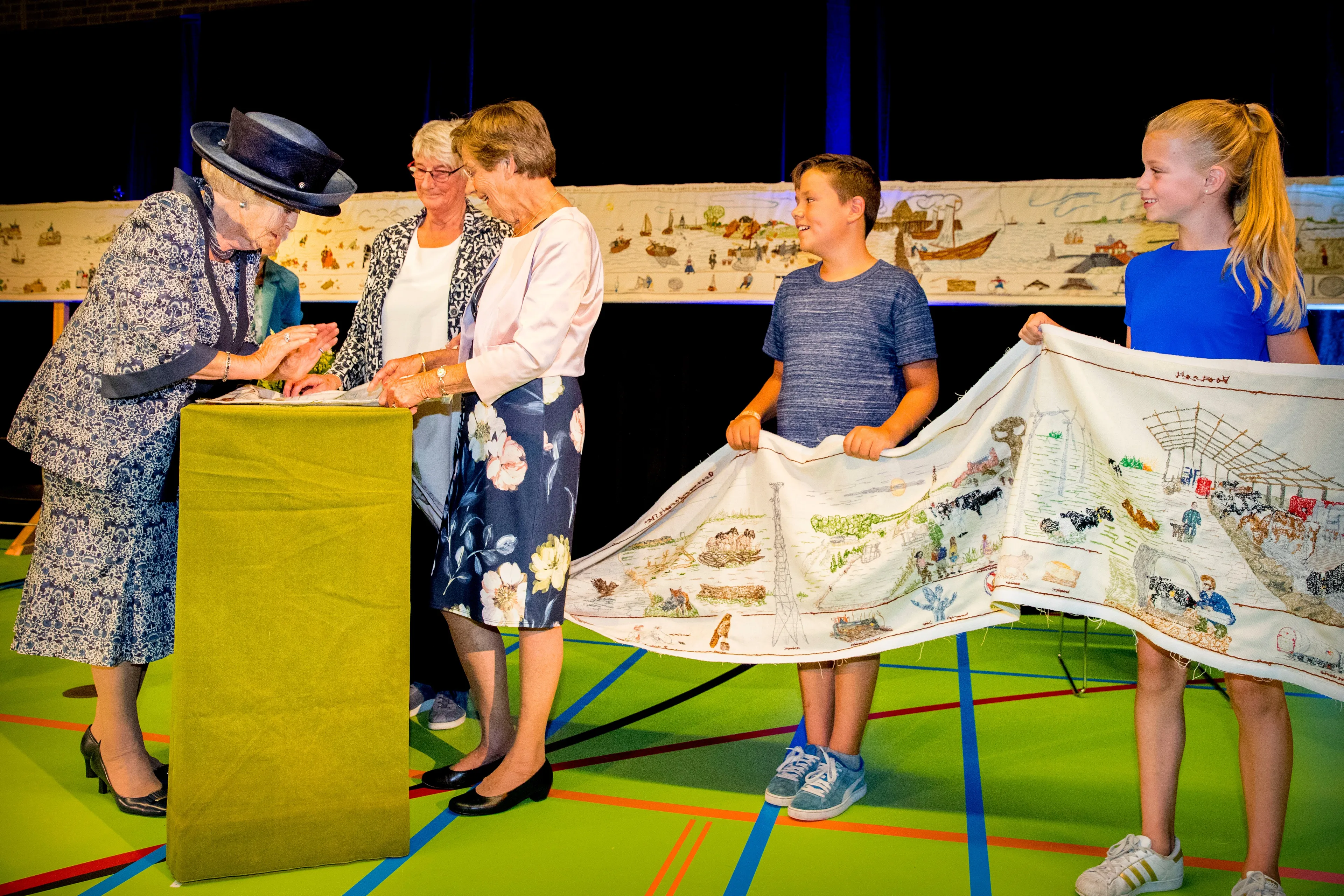 Vrijwilligers uit het dorp werkten gezamenlijk dertigduizend uur aan het 60 meter lange kleed, waar geborduurde historische scènes op staan. De prinses zette de laatste steken onder toeziend oog van de initiatiefnemers Jenny Bijsterbosch en Erie van Veelen.