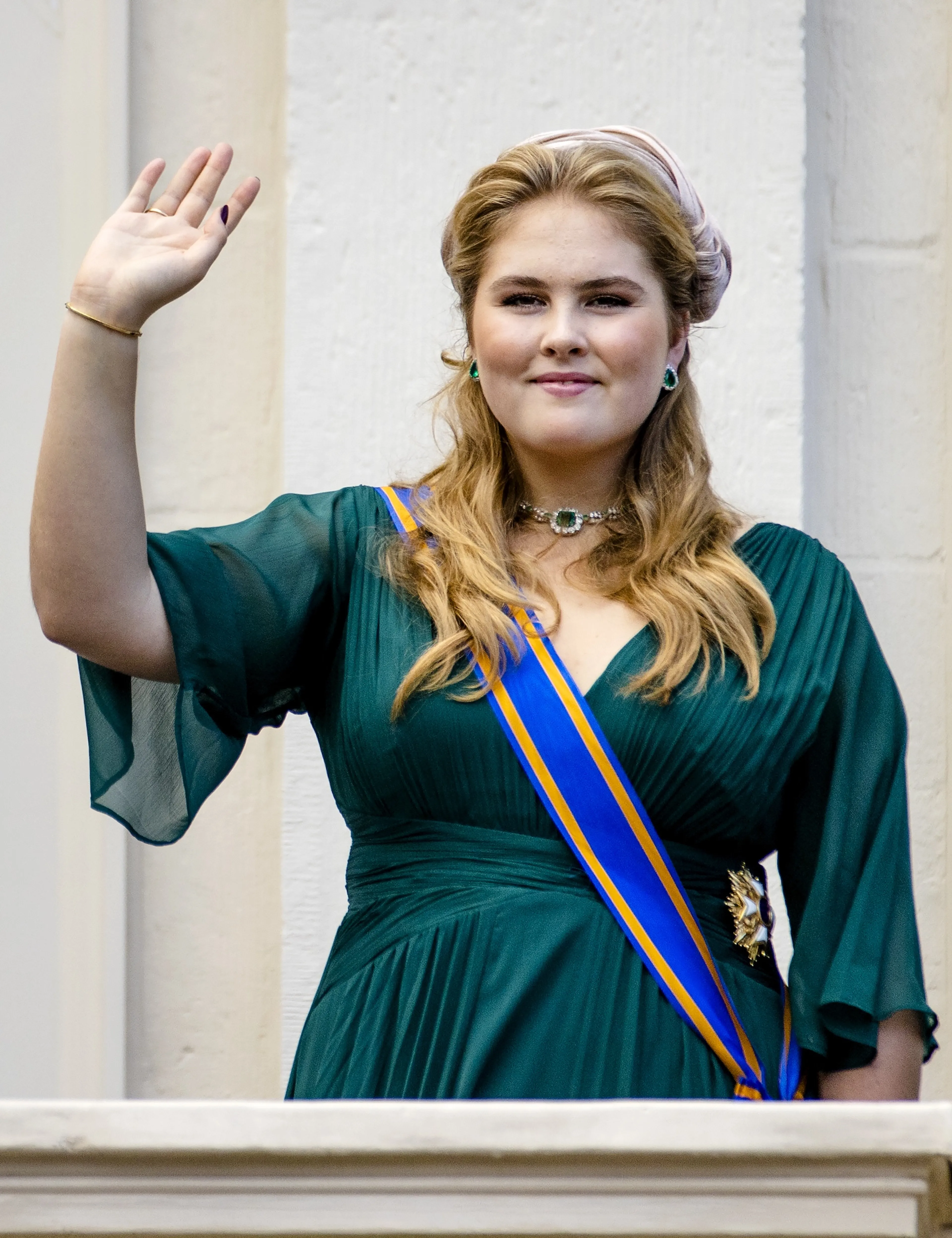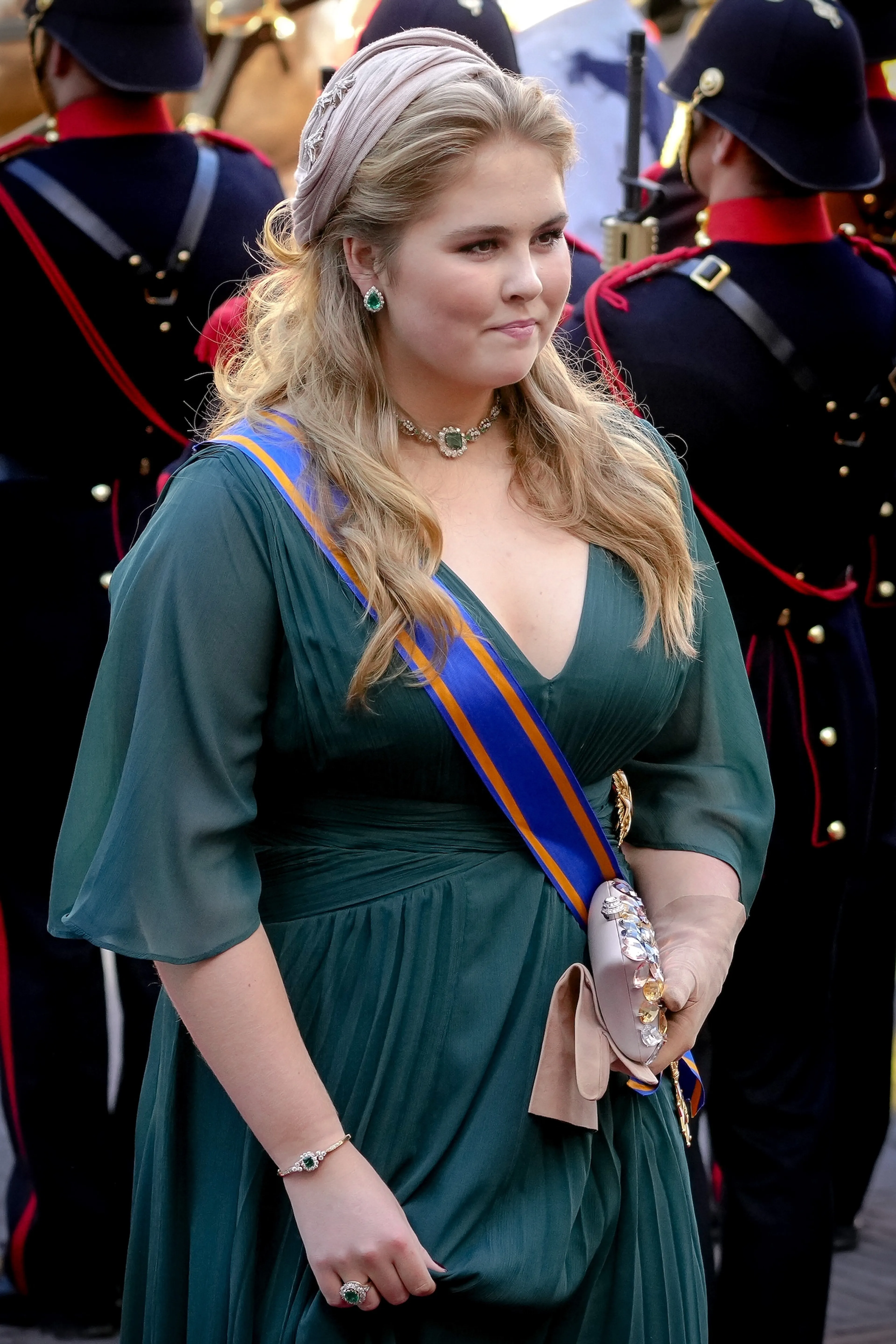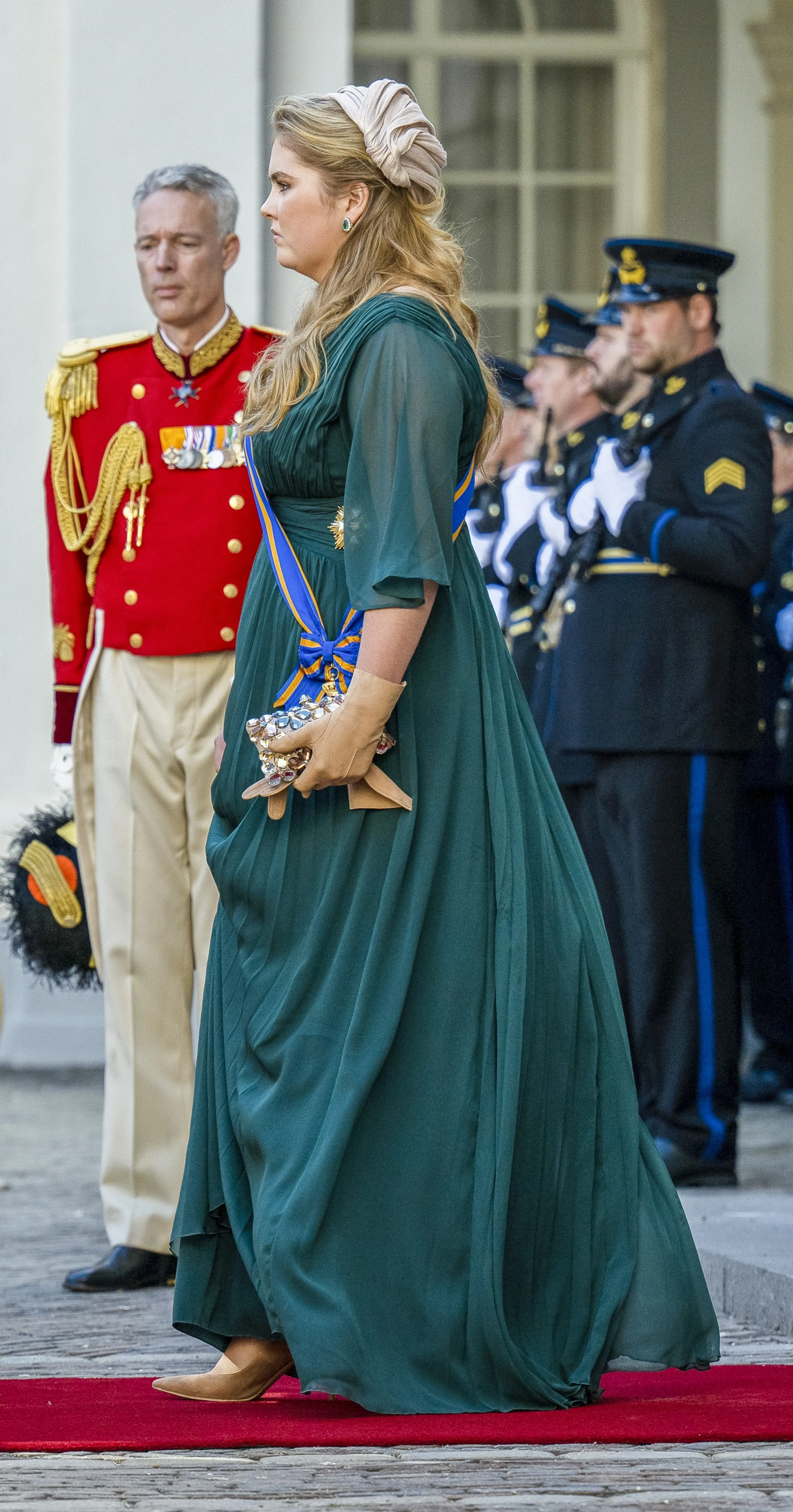 Prinses Amalia koos voor een donkergroene japon van voile met uitlopende plissé. De kleine hoed heeft ze van haar moeder geleend. Op de hoed, een creatie van de Belgische ontwerpster Fabienne Delvigne, waren drie diamanten sterren uit de koninklijke collectie gespeld. De Prinses van Oranje droeg het Ordelint en de ster van het Grootkruis der Orde van de Nederlandse Leeuw.
