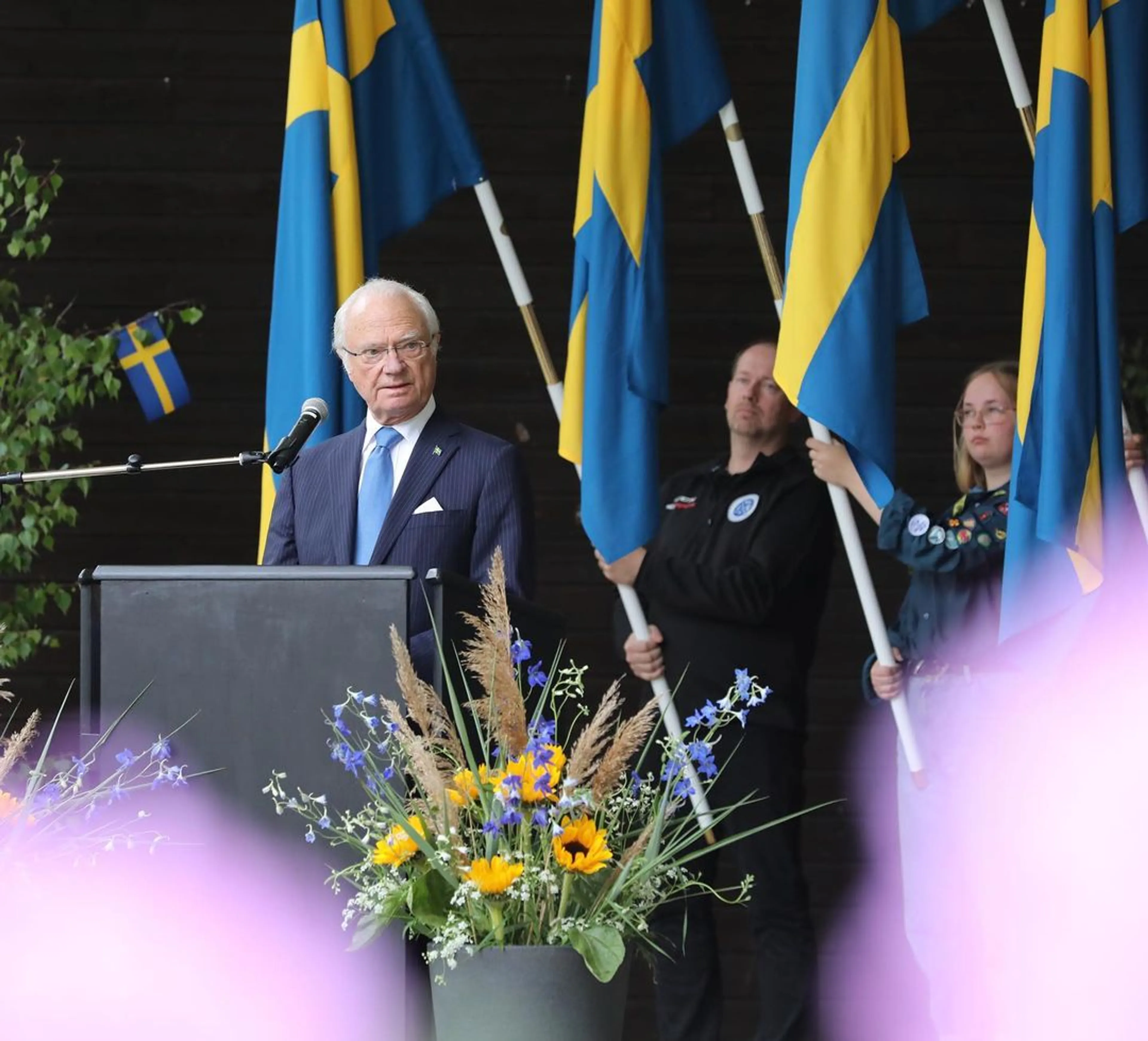 In het Holje-park hield de koning een toespraak en overhandigde hij vlaggen aan lokale verenigingen en organisaties. In zijn rede zei Carl Gustaf onder meer dat Zweden een land is "met een rijke geschiedenis en een veelbelovende toekomst. Laten we profiteren van beide, met gemeenschappelijke krachten."
