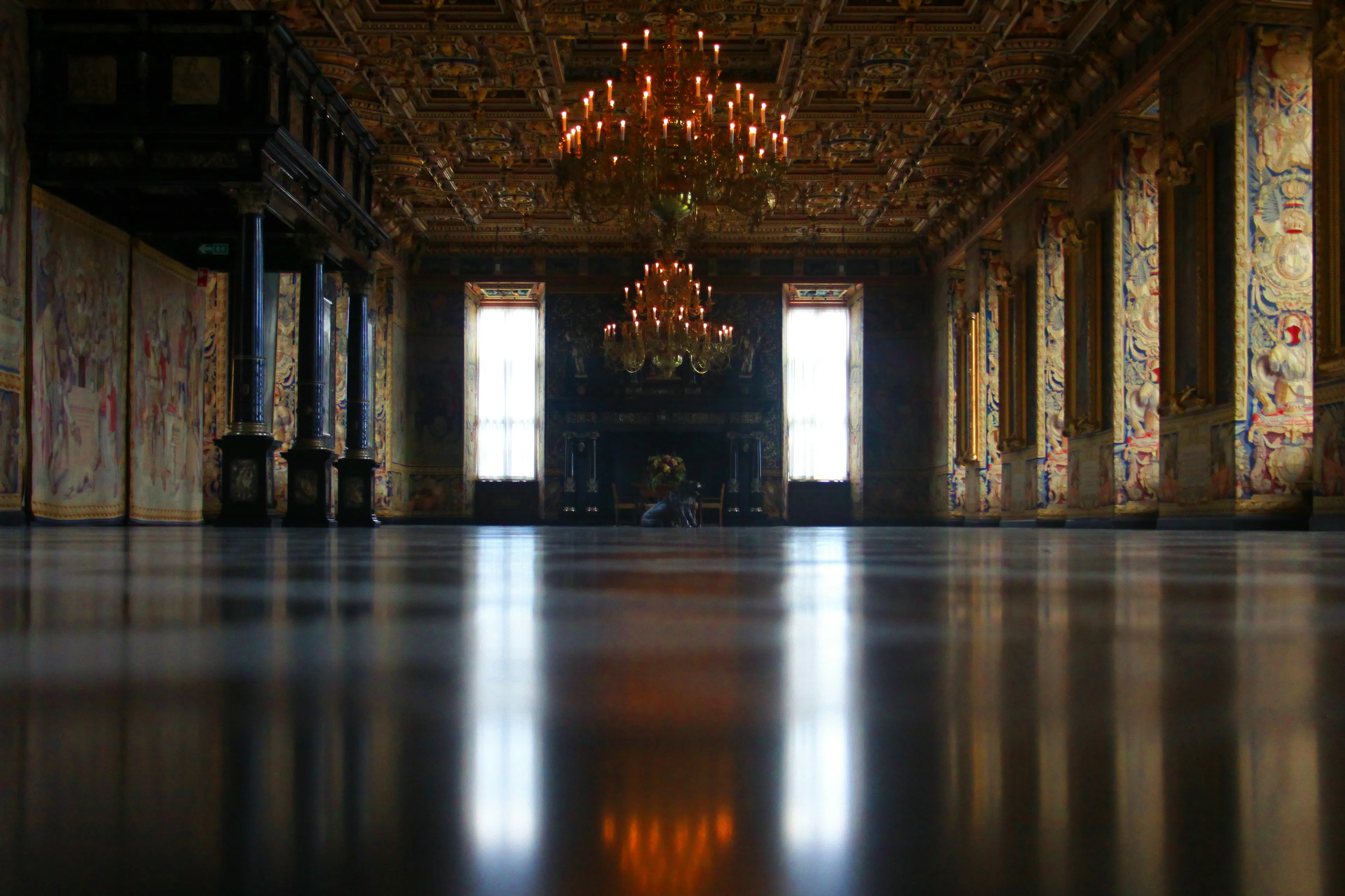 Deze hal is met recht koninklijk te noemen. Het is versierd met goud en aan het plafond hangen grote kroonluchters. Helaas is de zaal die koning Christian IV liet bouwen verwoest door de brand in de 19e eeuw, maar de zaal zoals we die nu zien, is een replica van het origineel. Aan de muren hangen portretten van verschillende Deense royals, maar ook koningin Margrethe, koning Frederik en kroonprins Christian hebben een plekje op de wand.