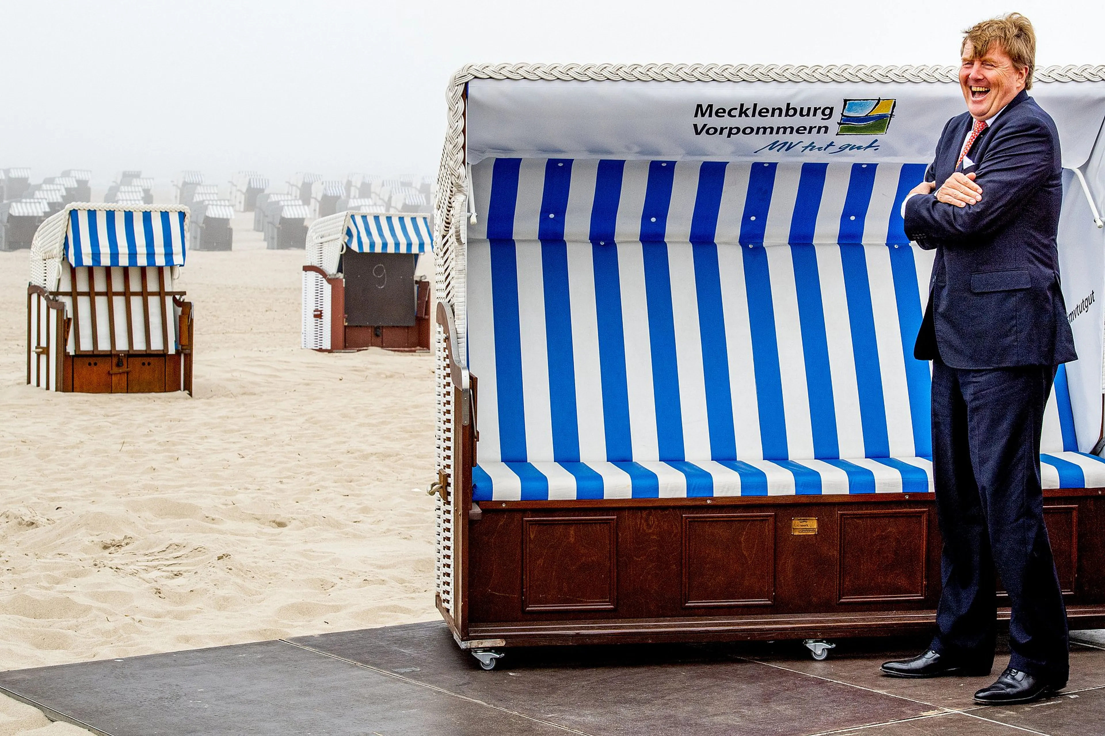 Koning Willem-Alexander en koningin Máxima konden maandagmiddag op het Oostzeestrand van Warnemünde geheel in hun rol blijven. De strandstoelen stonden weliswaar klaar maar het weer nodigde niet uit tot een lang verblijf op het zandstrand. En de markante vuurtoren van de Duitse kustplaats was door de zeemist niet te zien.