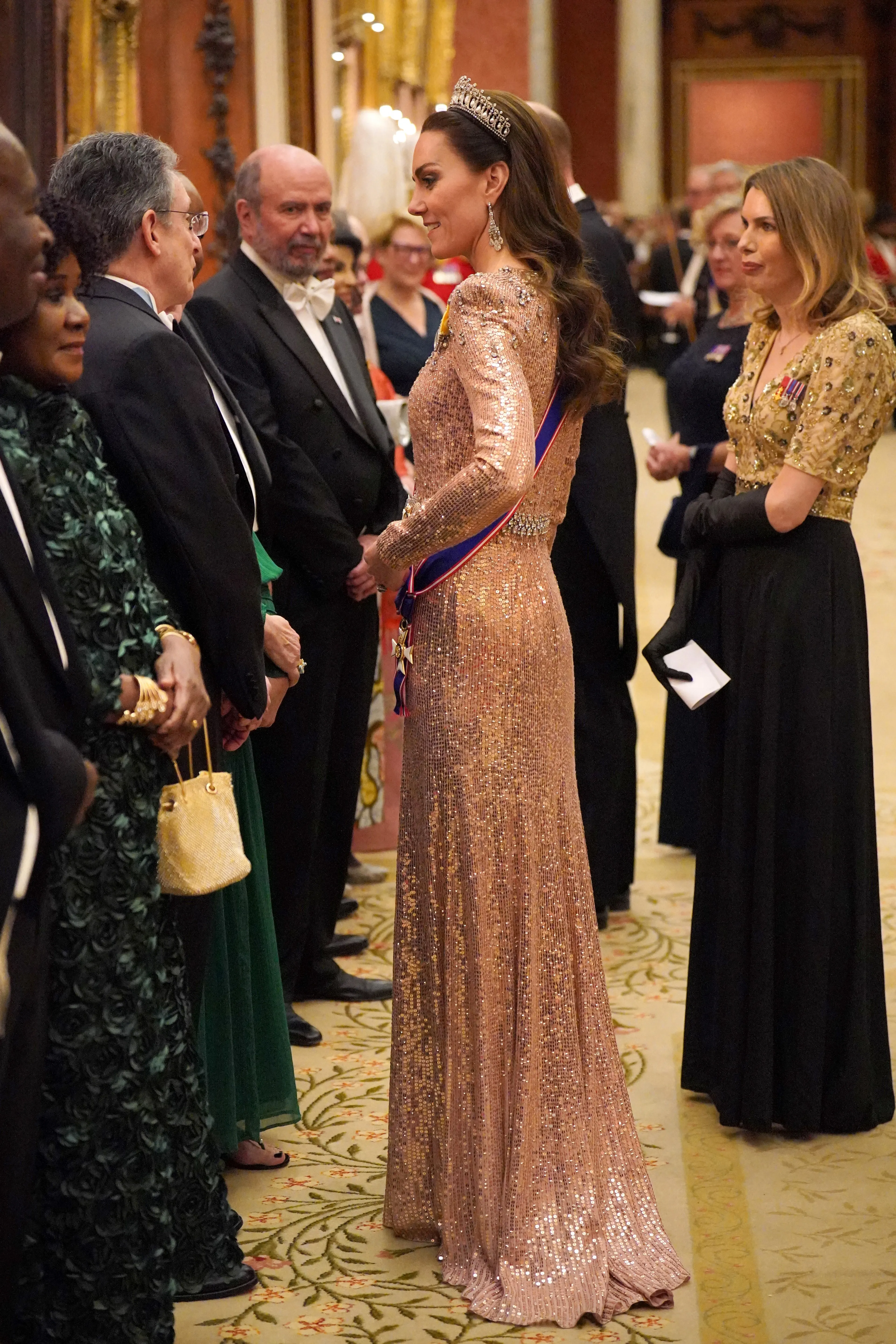 Dit keer liet Catherine haar oog vallen op een donkerblauwe galajurk. De jurk bevat een lijfje vol met pailletten en een cape die de jurk helemaal afmaakt. Met een historisch diadeem van koningin Victoria straalde ze van top tot teen. Dit alles droeg zij afgelopen december tijdens het staatsbanket met Duitsland.
