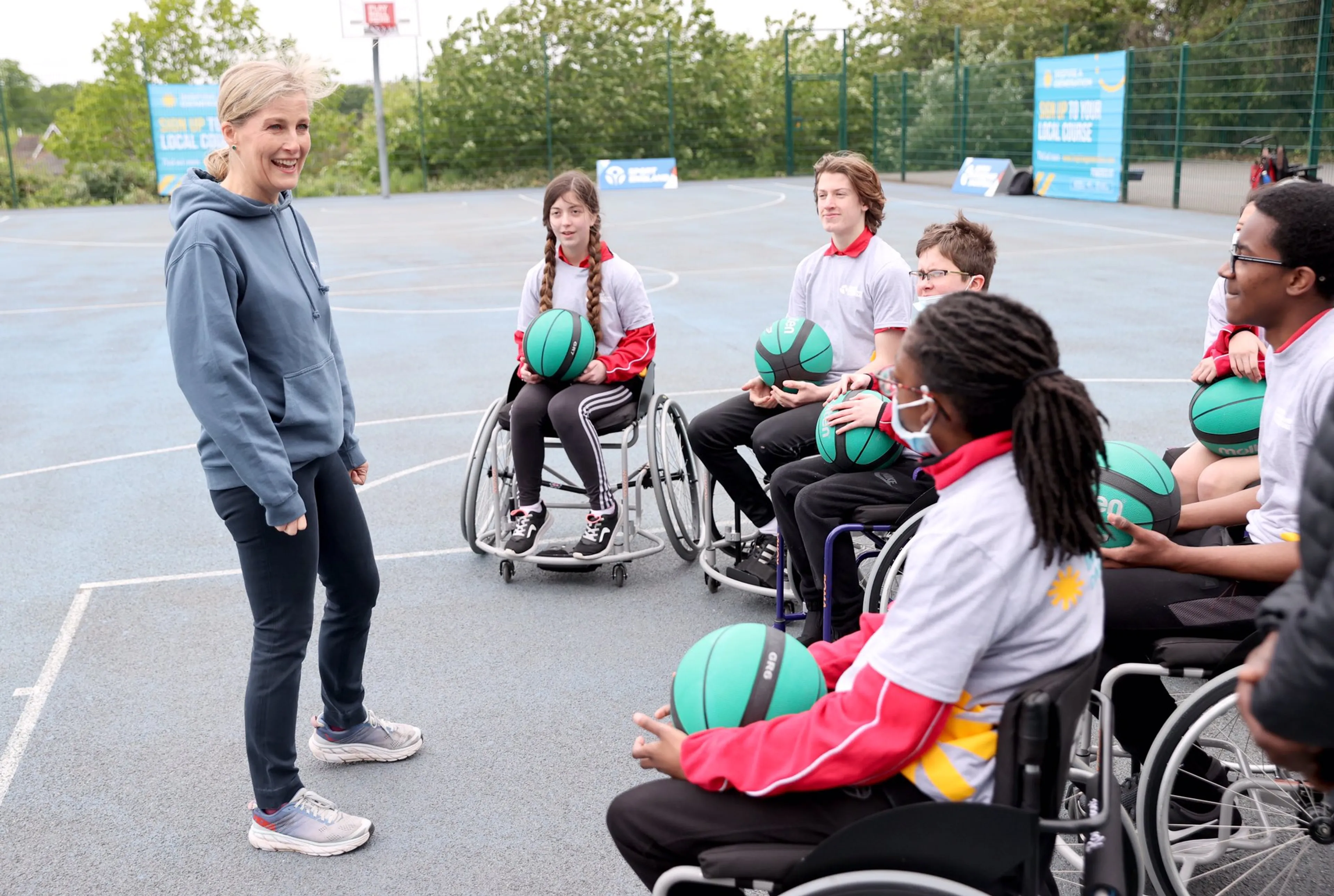Op Twitter zijn meerdere foto’s te zien waarop de gravin van Wessex samen met kinderen aan het oefenen is met een basketbal. Ook ging Sophie in gesprek met de kinderen. "We hadden een geweldige ochtend tijdens onze eerste rolstoelbasketbalsessie", schrijft British Wheelchair Basketball.