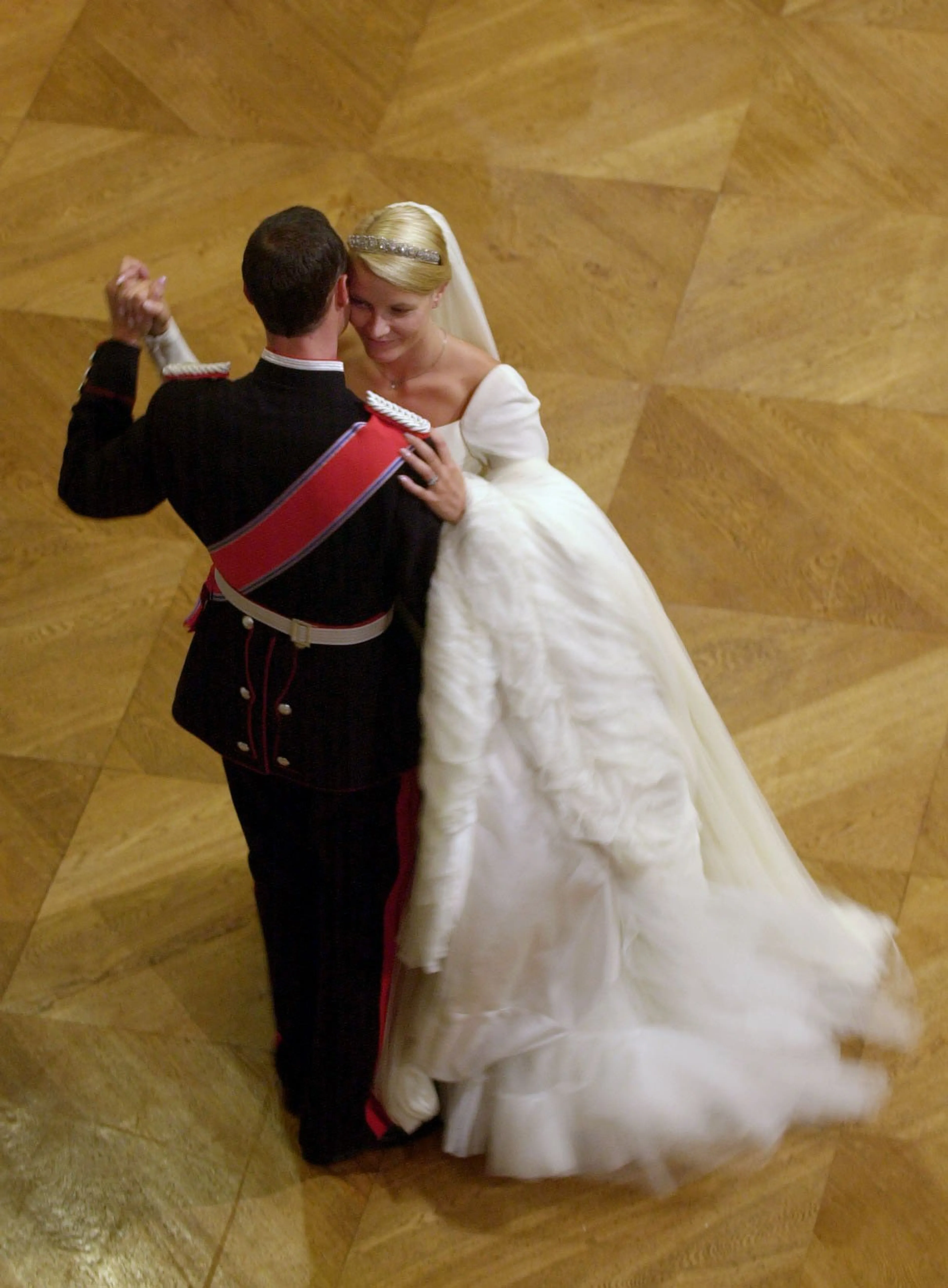 Op haar bruiloft draagt Mette-Marit de Diamond Daisy Bandeau-tiara, een geschenk van koning Harald en koningin Sonja voor haar huwelijk met hun zoon Haakon.
