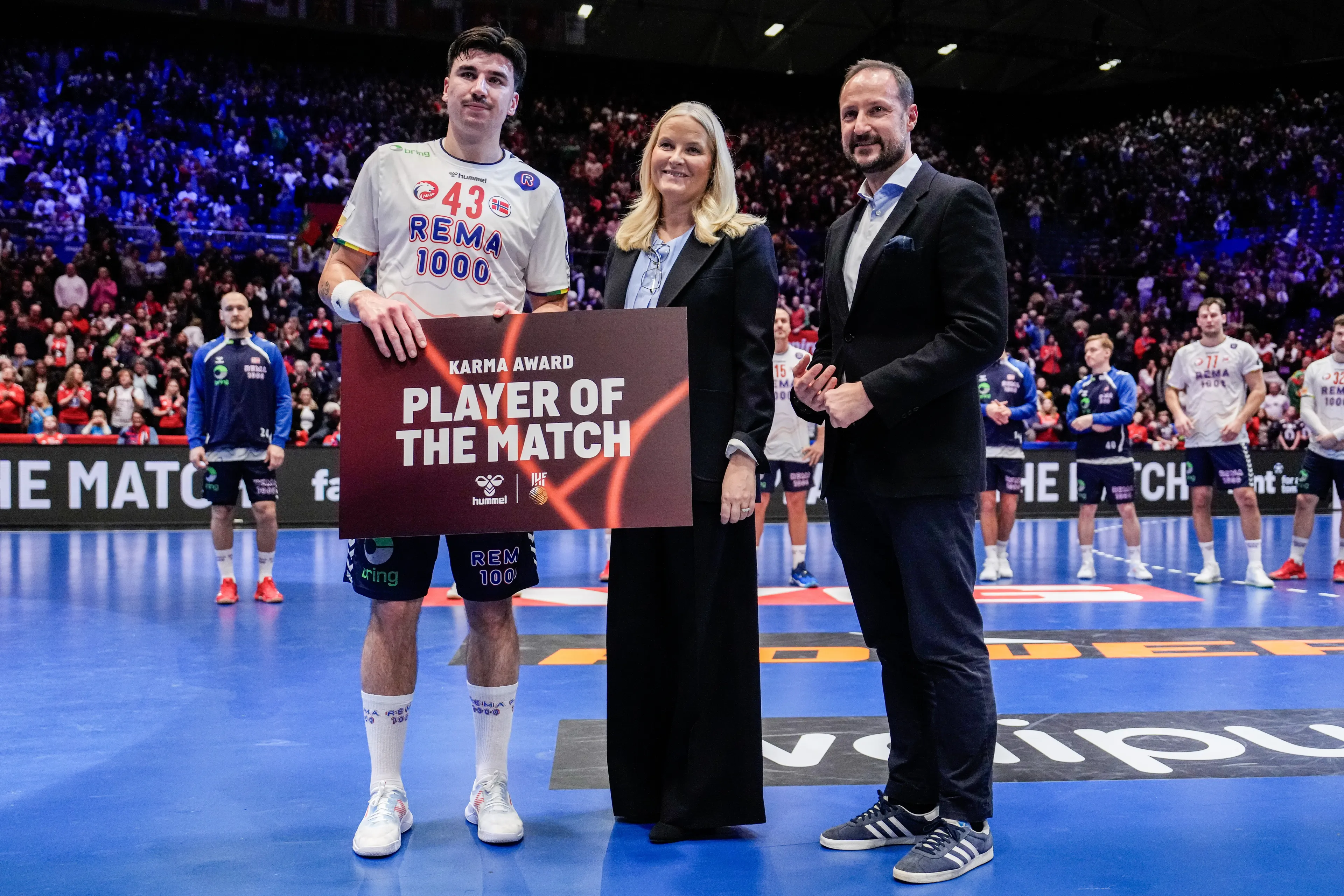Dit weekend was de tribune van het WK handbal voor mannen in Noorwegen gevuld met bijzonder publiek. Op de tribune zaten kroonprins Haakon en kroonprinses Mette-Marit klaar om de spanning van de wedstrijd te ervaren. Aan het einde van de wedstrijd reikten ze een prijs uit aan de beste speler van de wedstrijd.