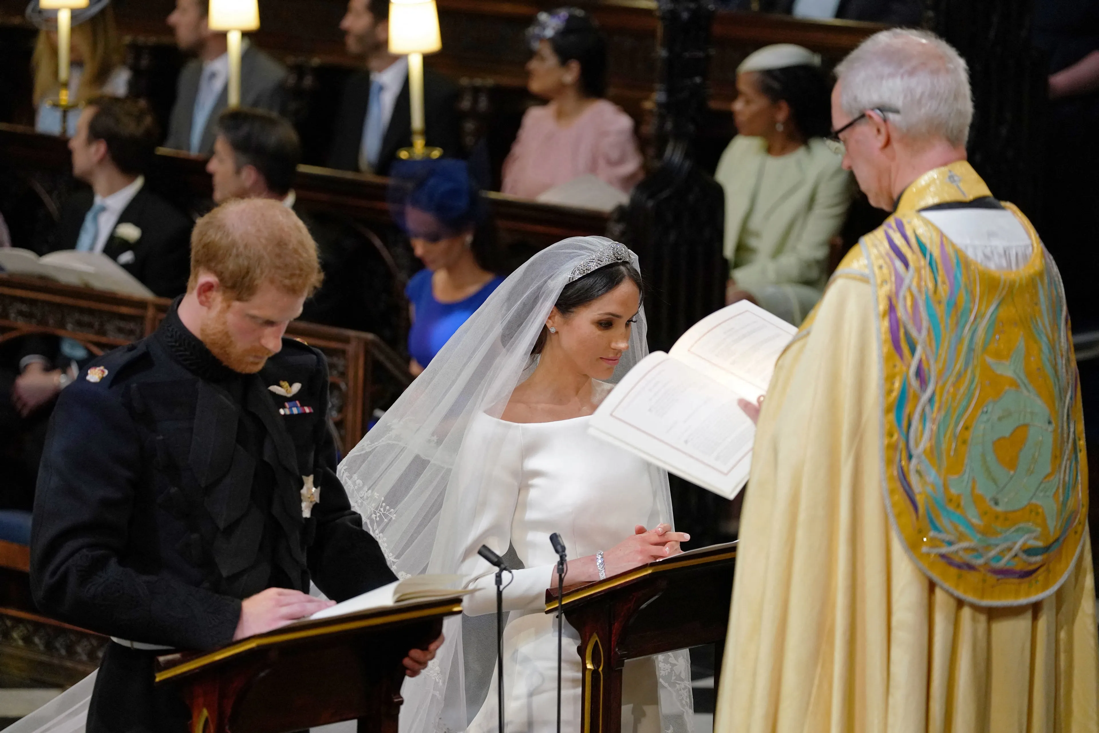 Harry en Meghan trouwen in 2018 in de St. George's Chapel in Windsor. De dienst wordt geleid door de eerder genoemde Justin Welby. Dat hij het huwelijk eerder al gesloten zou hebben, zoals Meghan beweerde in het interview met Oprah Winfrey, ontkrachtte hij later in een interview in La Repubblica. "Ik heb het huwelijkscertificaat ondertekend, wat een wettelijk document is. En ik zou een ernstig misdrijf hebben begaan als ik het had ondertekend wetende dat het vals was."