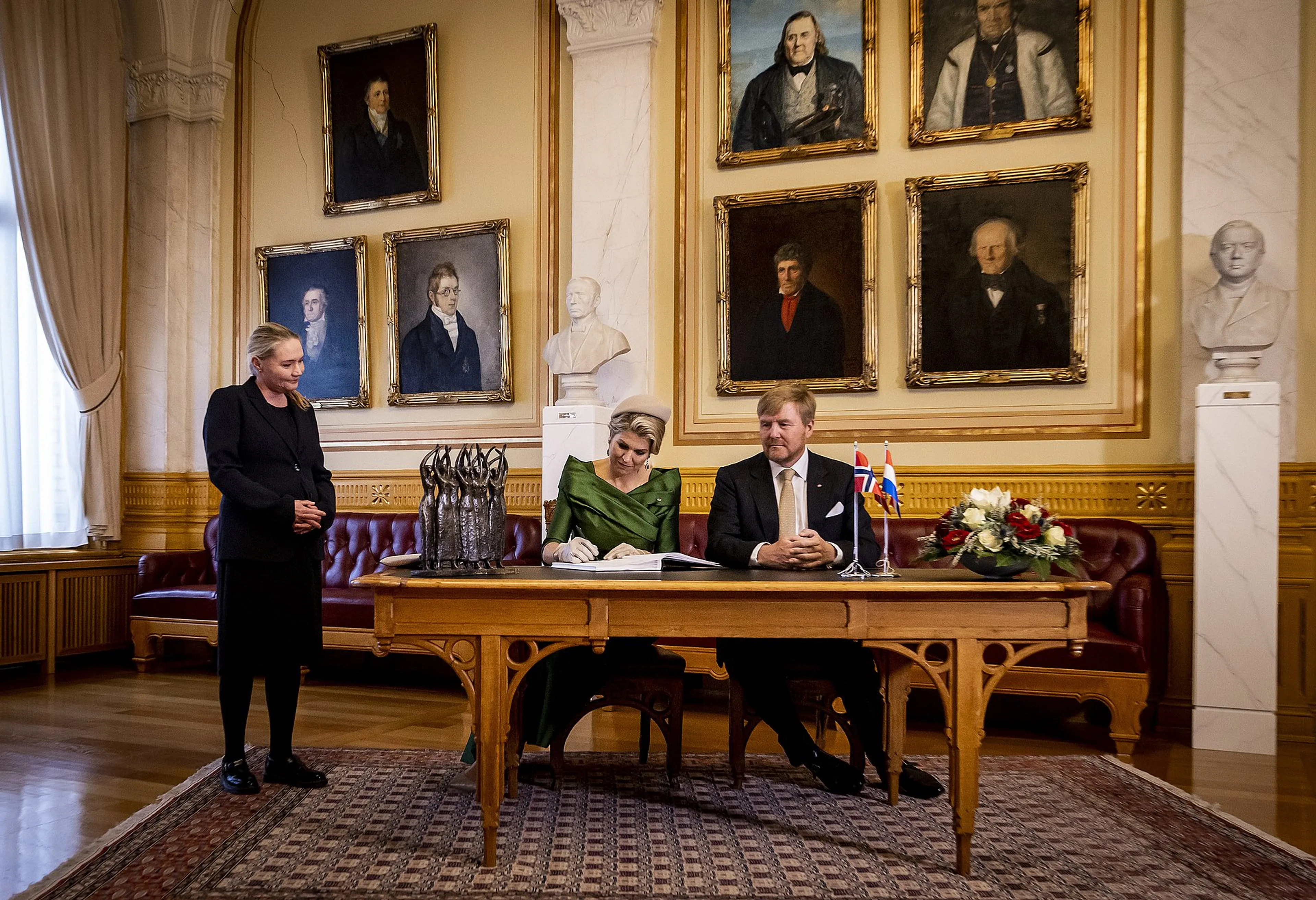 Koning Willem-Alexander en koningin Máxima sloten het ochtendprogramma af met een beleefdheidsbezoek aan parlementsvoorzitter Eva Kristin Hansen. Zij ontving het koningspaar in de Storting - het Noorse parlement - en had daar een kort onderhoud met de Nederlandse bezoekers. Aansluitend tekenden de koning en koningin in de Eidsvoll Gallery het gastenboek. Voorafgaand aan het bezoek aan de Storting legde koning Willem-Alexander een krans bij het Nationaal Monument bij de aan de Oslofjord gelegen vesting Akershus.