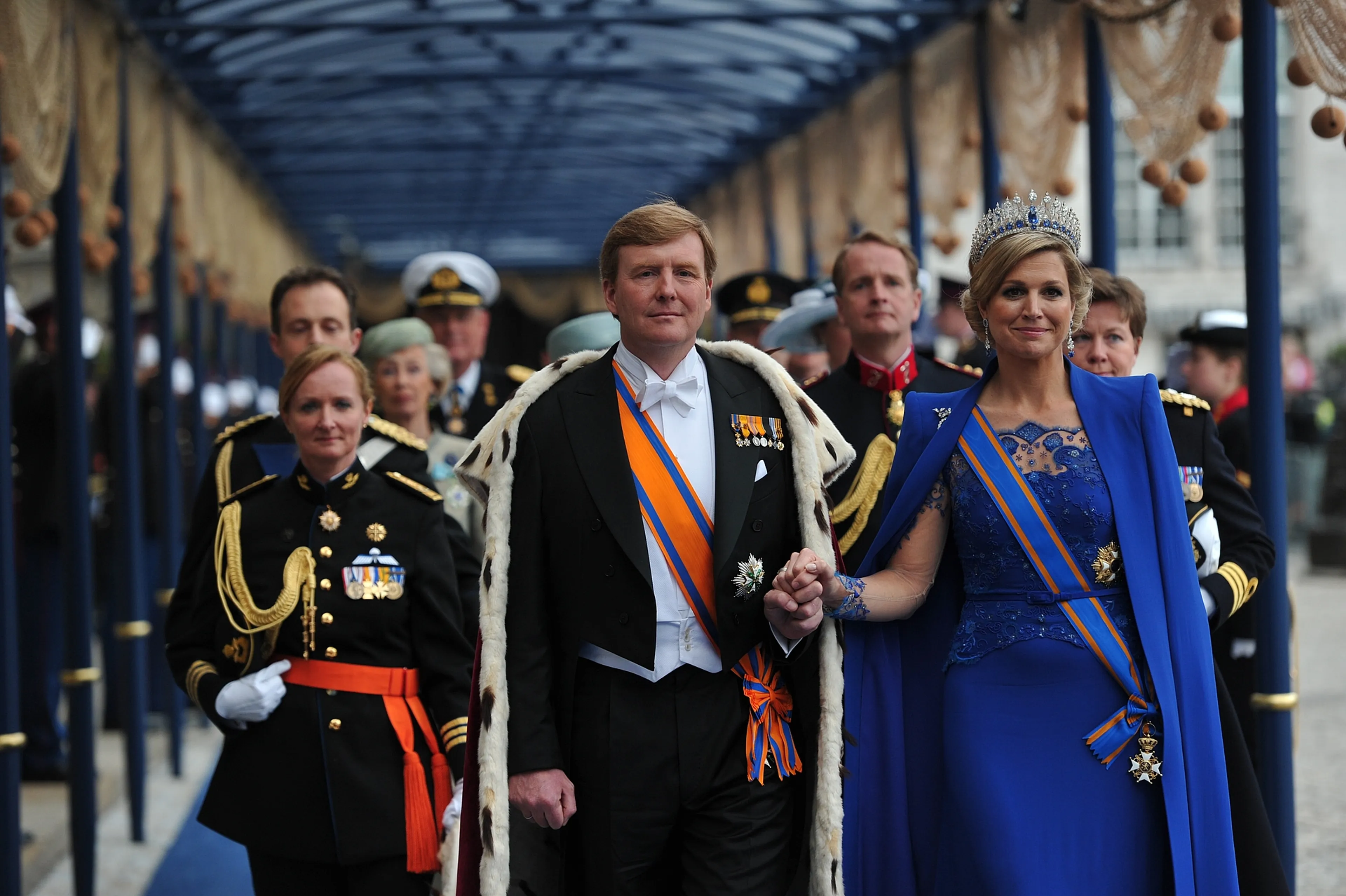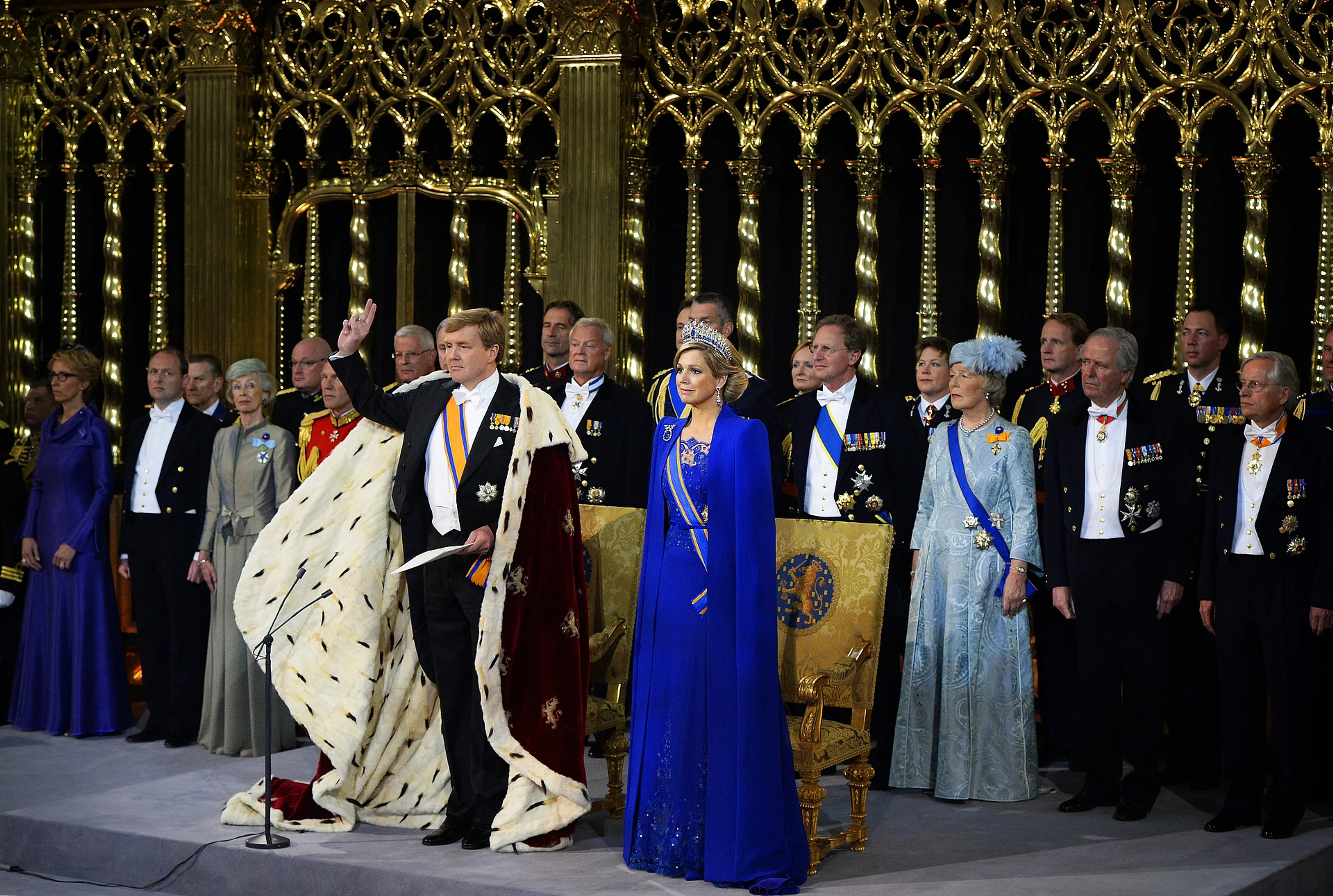 30 april 2013: na maandenlange voorbereidingen was het moment daar. De koning ziet er piekfijn uit in zijn chique rokkostuum en de historische hermelijnen mantel. Dankzij de voor het oog verborgen riem bleef de mantel op zijn plaats.