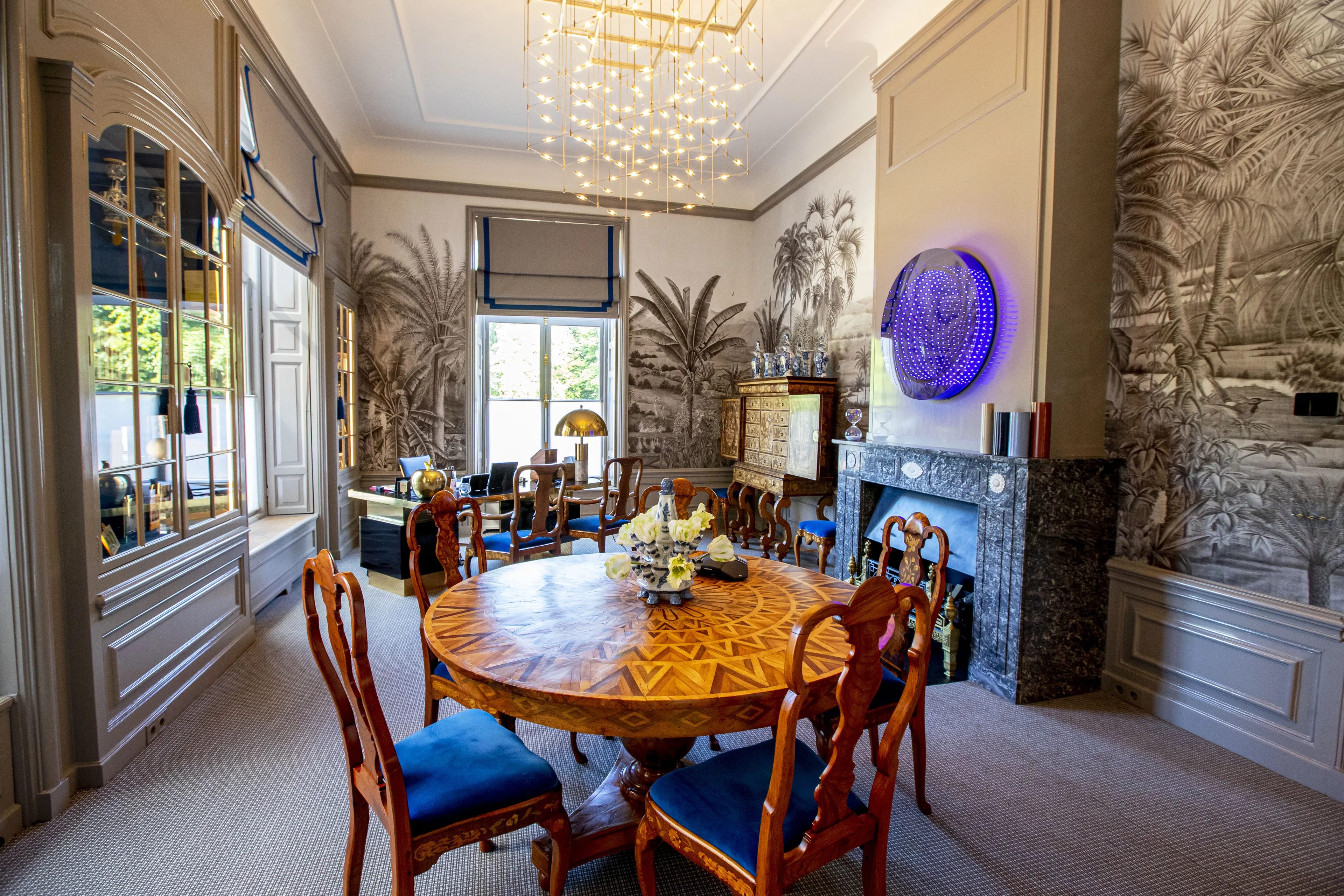 Naast de DNA Salon is de werkkamer van koning Willem-Alexander. Vanuit deze kamer hield de koning tijdens de coronalockdowns veel videogesprekken.