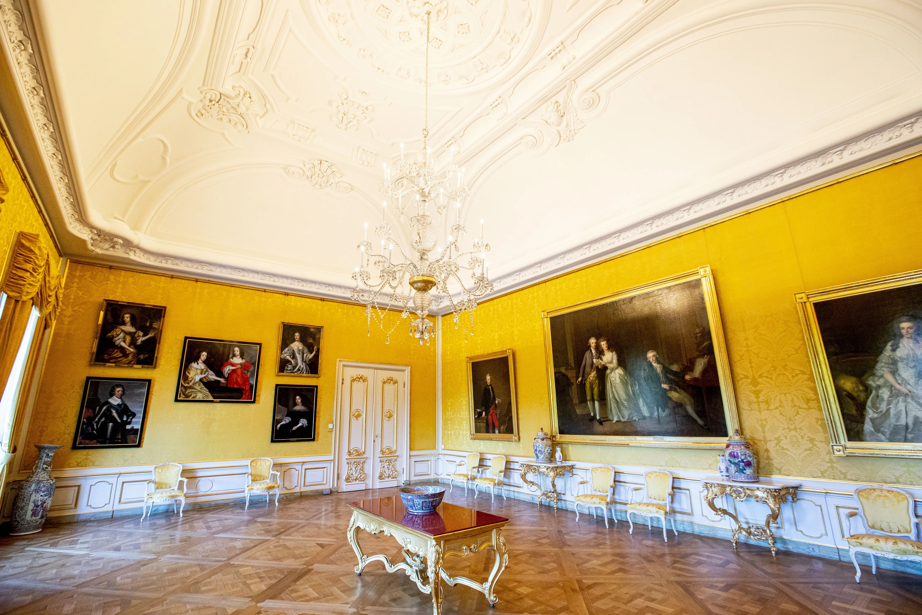 Op de tweede verdieping van Paleis Huis ten Bosch vinden we de Gele Balzaal. De Gele Balzaal is nog helemaal in de oude stijl. In 2014 ontvangt het koningspaar Barack Obama.