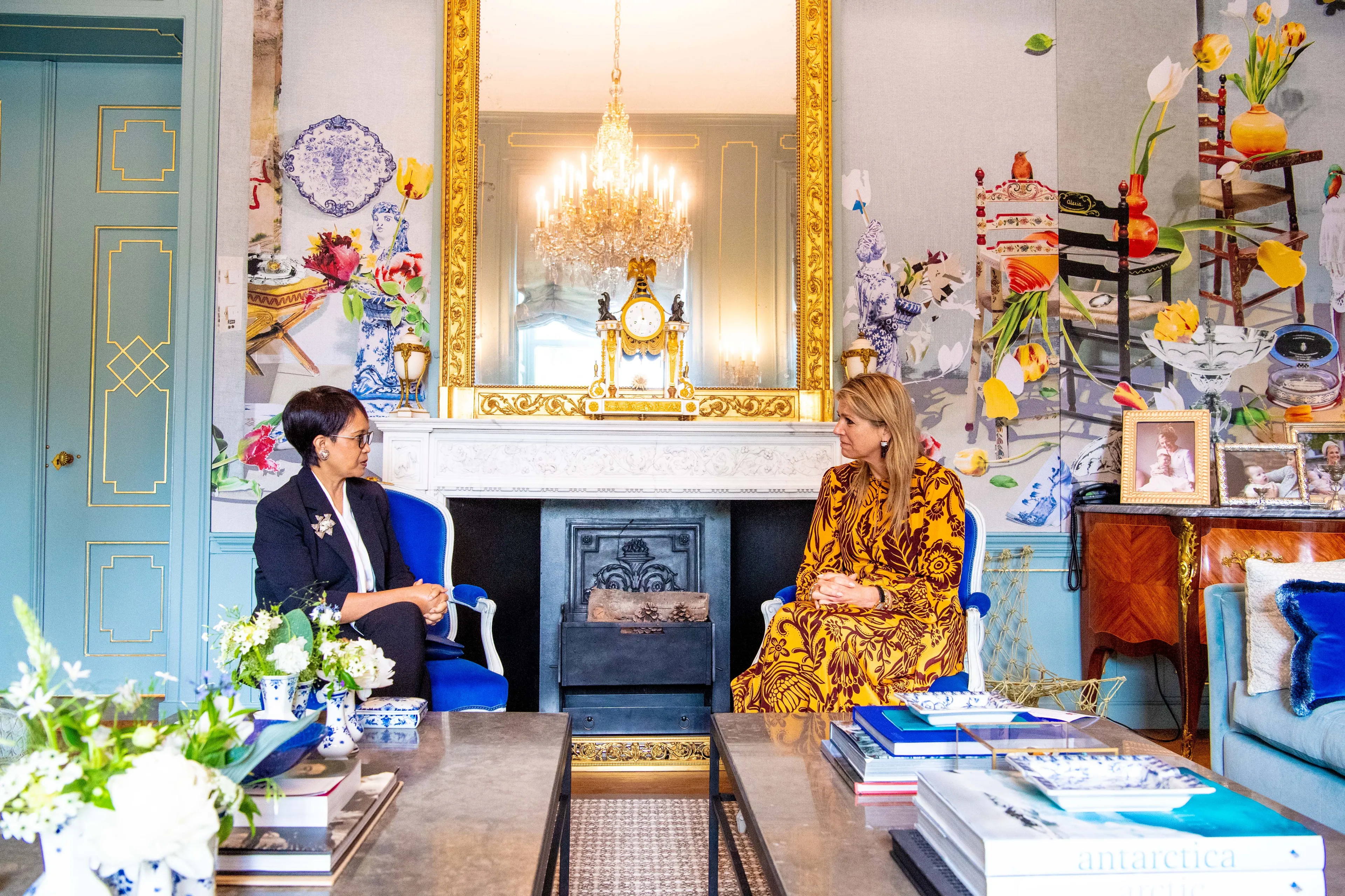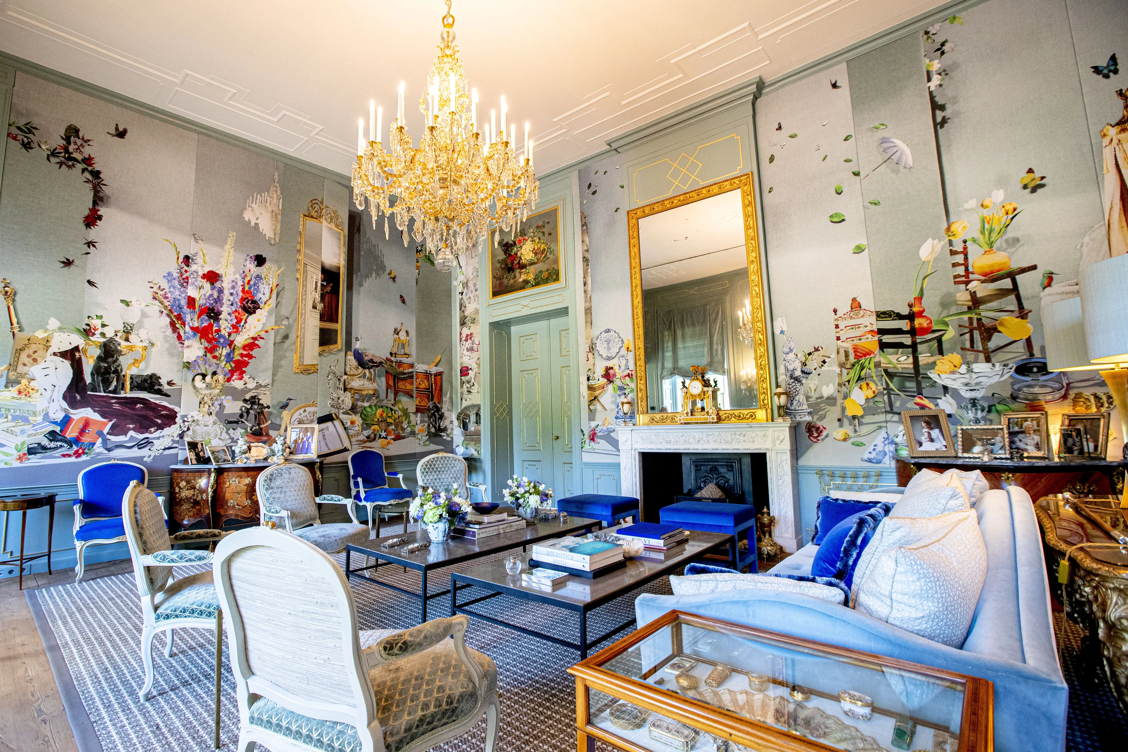 Vanuit de Blauwe Salon loop je zo door naar de werkkamer van koningin Máxima. Deze ruimte kennen we van het interview met Matthijs van Nieuwkerk ter ere van haar haar vijftigste verjaardag.