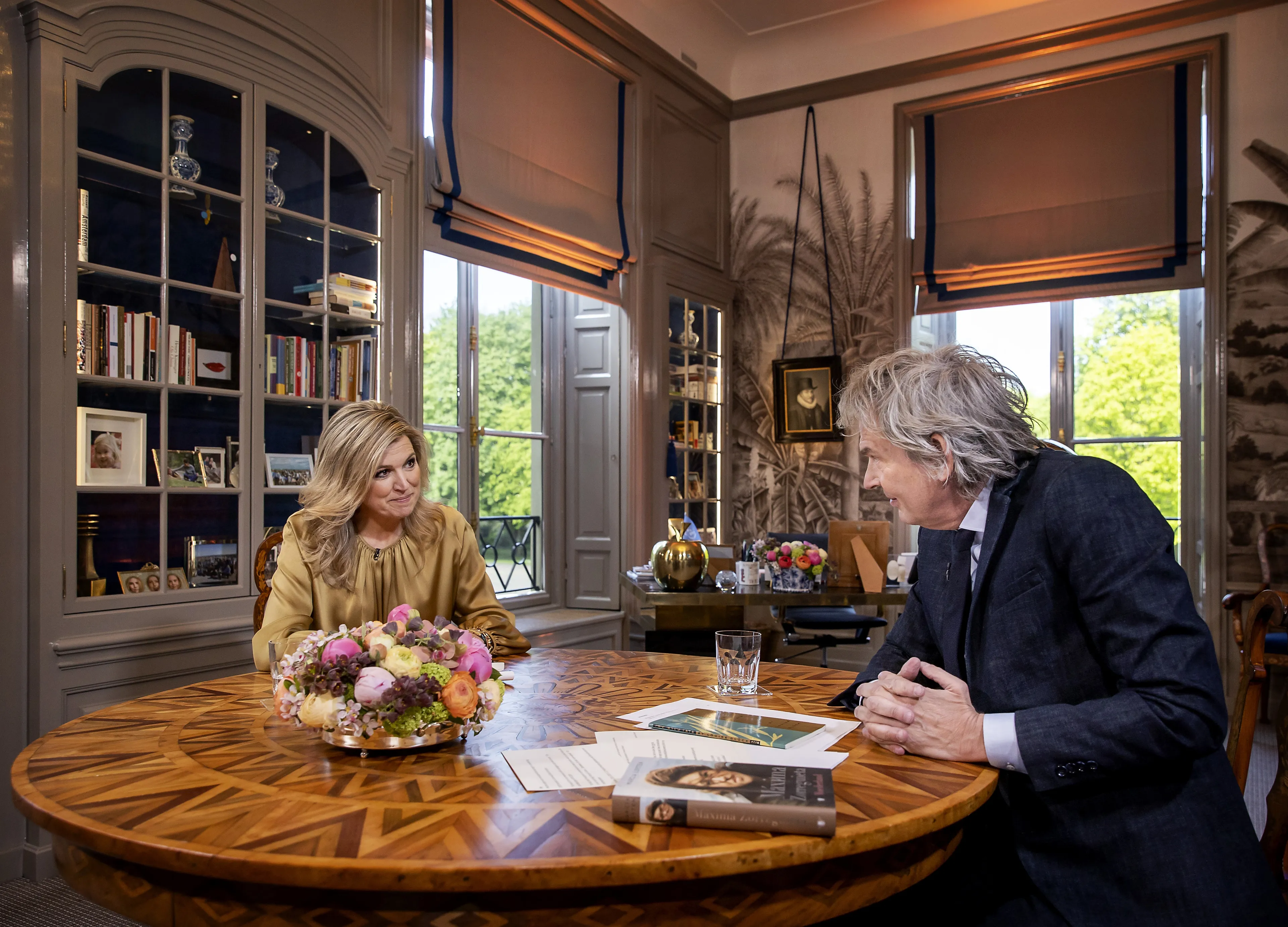 De werkkamer van koningin Máxima grenst aan de bibliotheek, waar genoeg te lezen valt voor het koningspaar en de prinsessen.