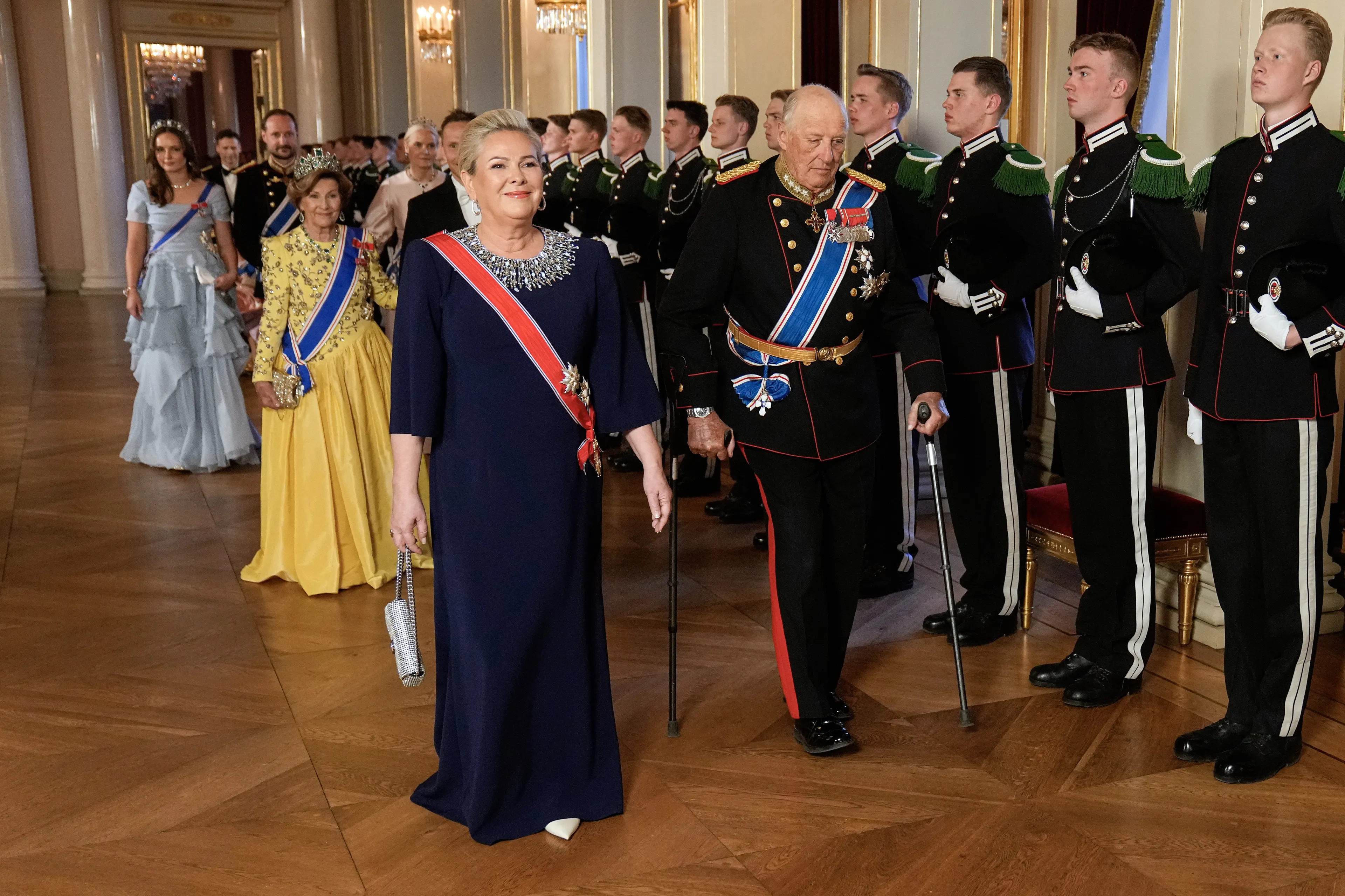 Koning Harald organiseerde het diner op het paleis in Oslo. Koningin Sonja ging gekleed in een van haar vele gekleurde jurken. Ze koos voor een gele japon met met een basque waist.